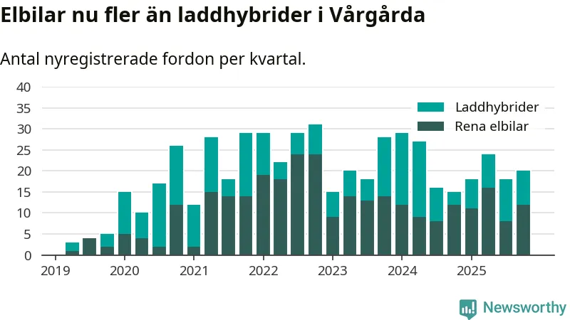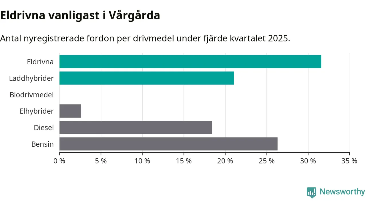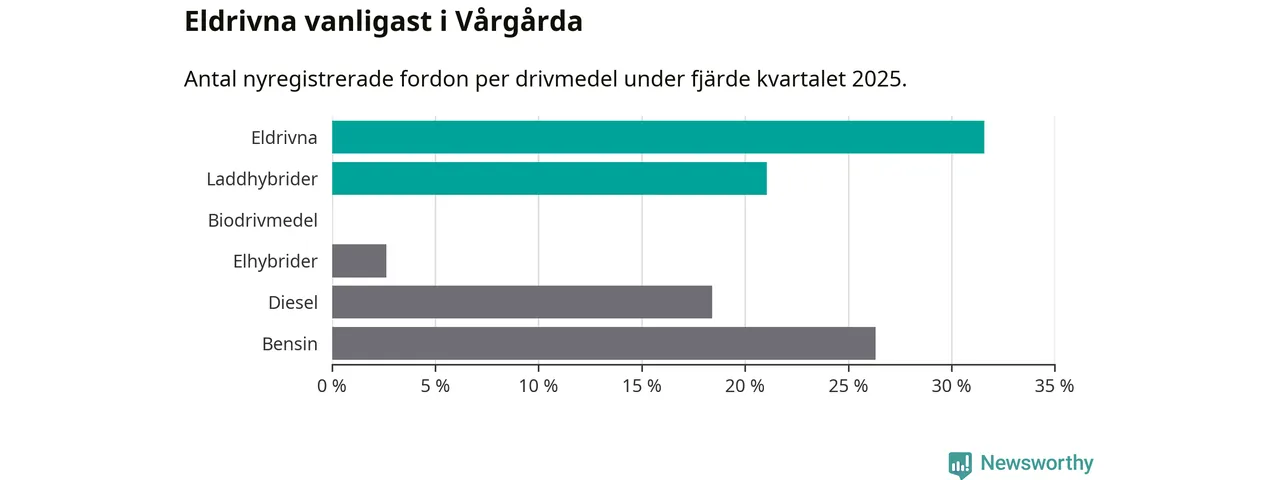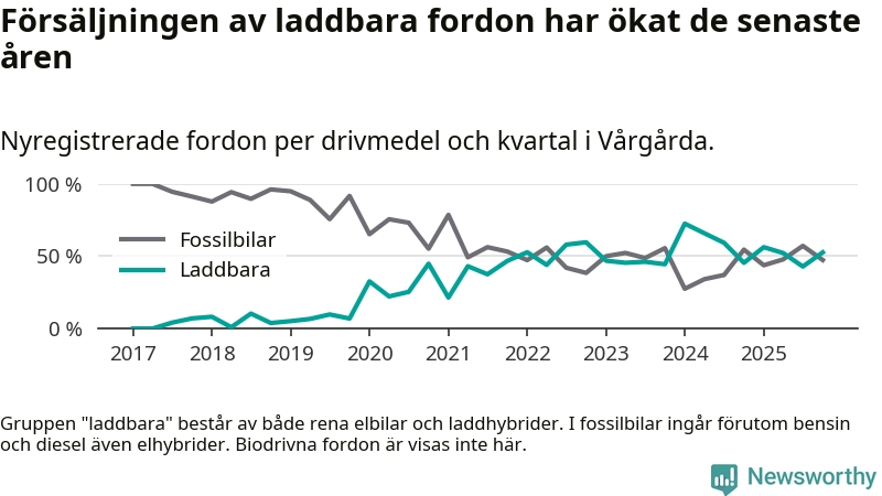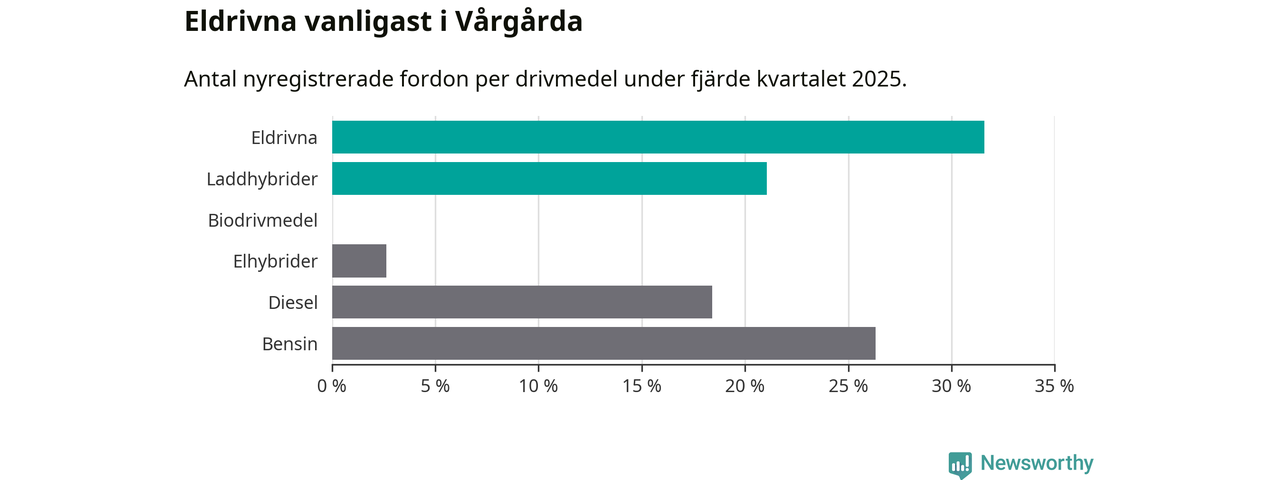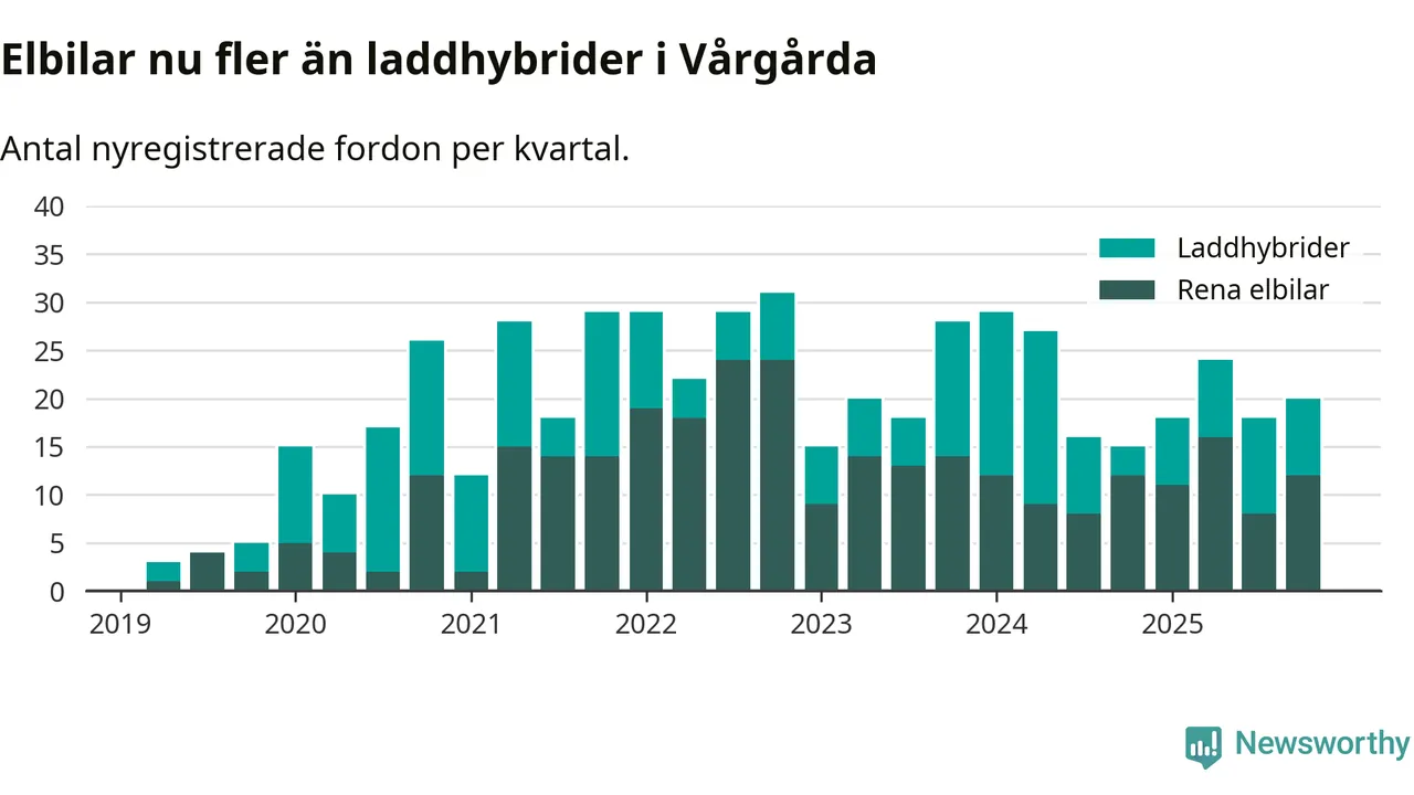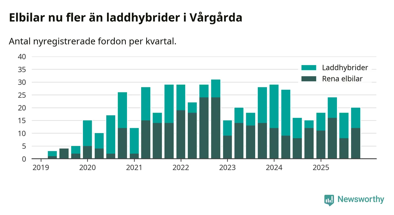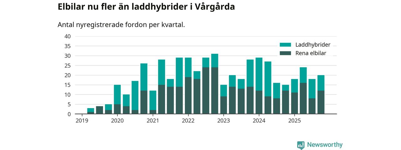 Under fjärde kvartalet 2025 var 53 procent av alla nyregistrerade personbilar i Vårgårda laddbara (sammanlagt registrerades 38 nya bilar). Merparten av de laddbara bilarna var rena elbilar (32 procent av alla).