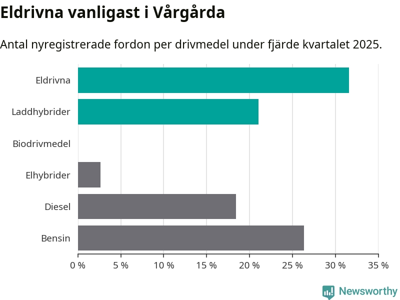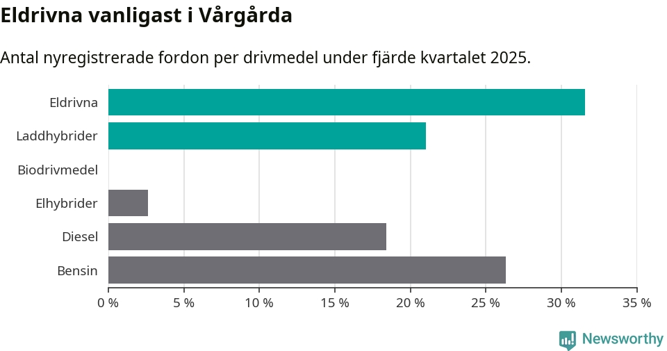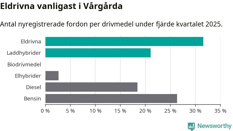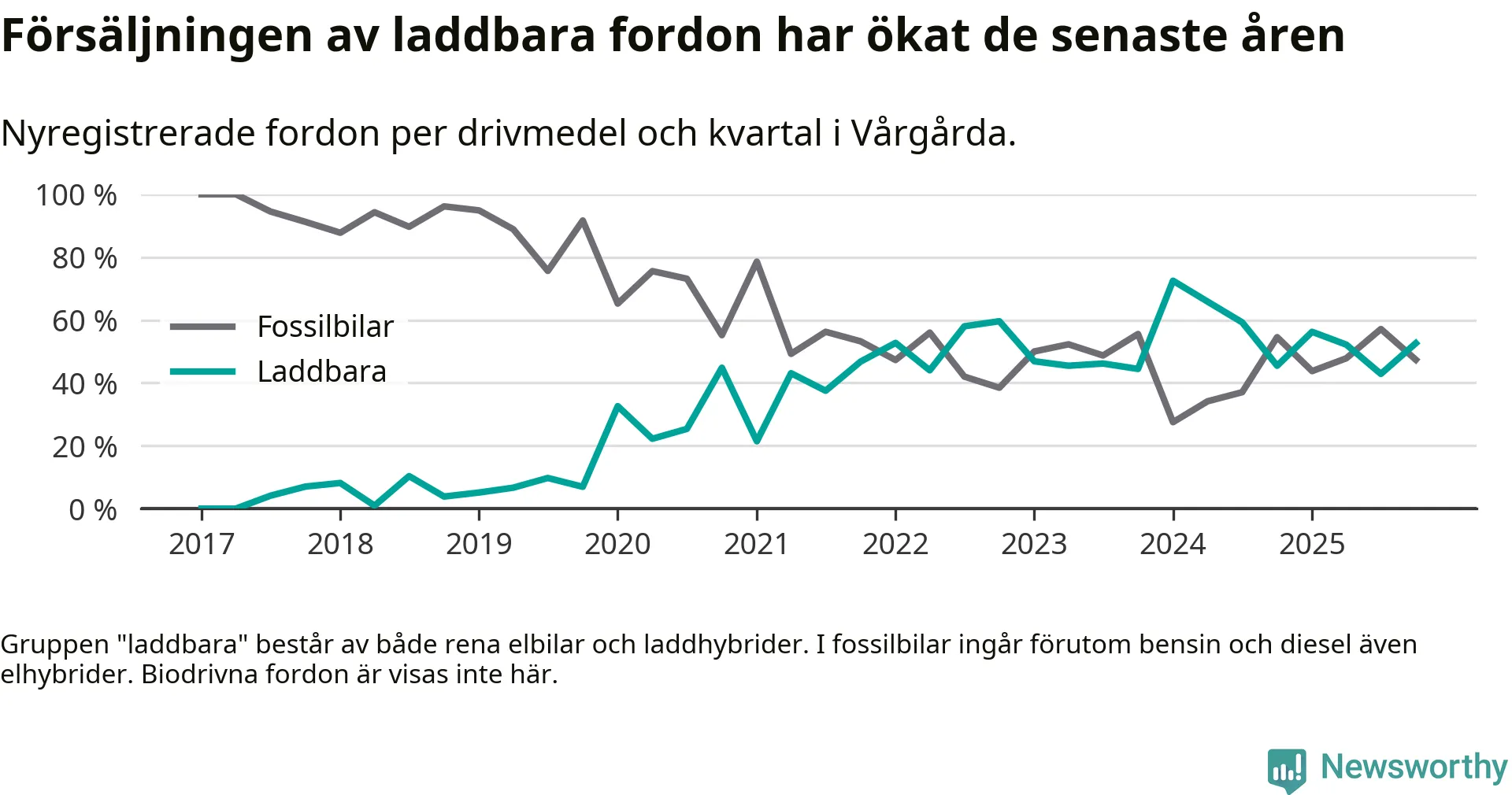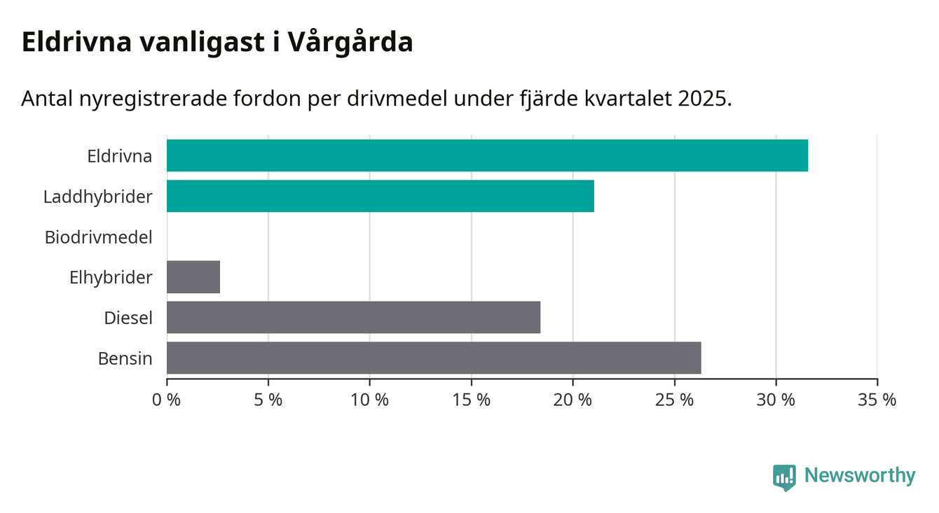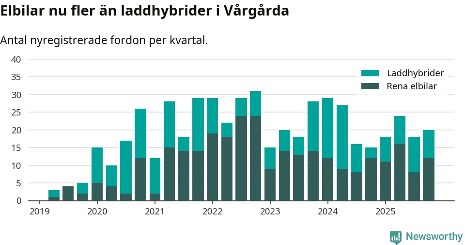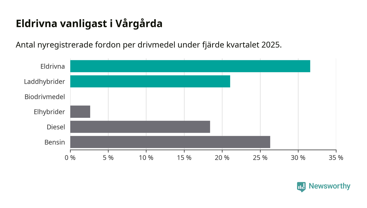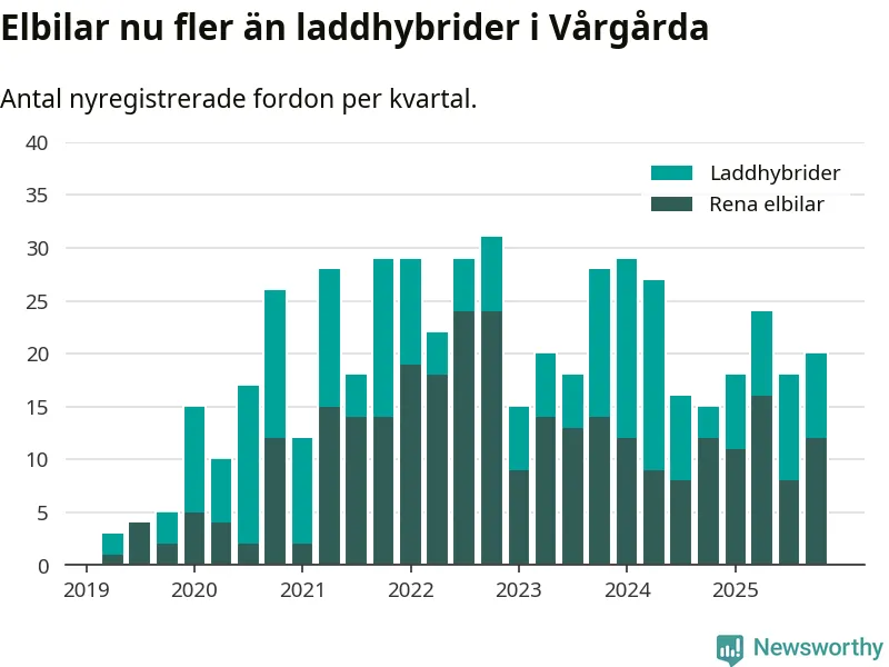 Under fjärde kvartalet 2025 var 53 procent av alla nyregistrerade personbilar i Vårgårda laddbara (sammanlagt registrerades 38 nya bilar). Merparten av de laddbara bilarna var rena elbilar (32 procent av alla).