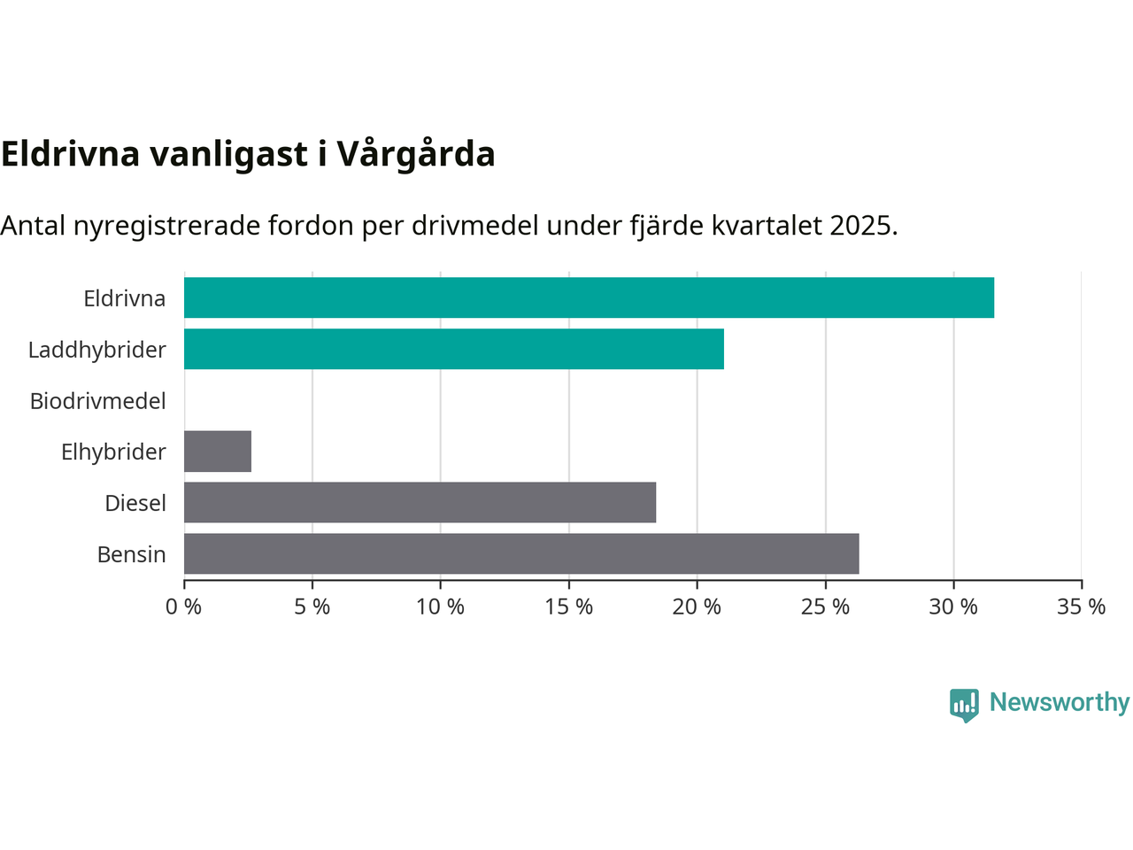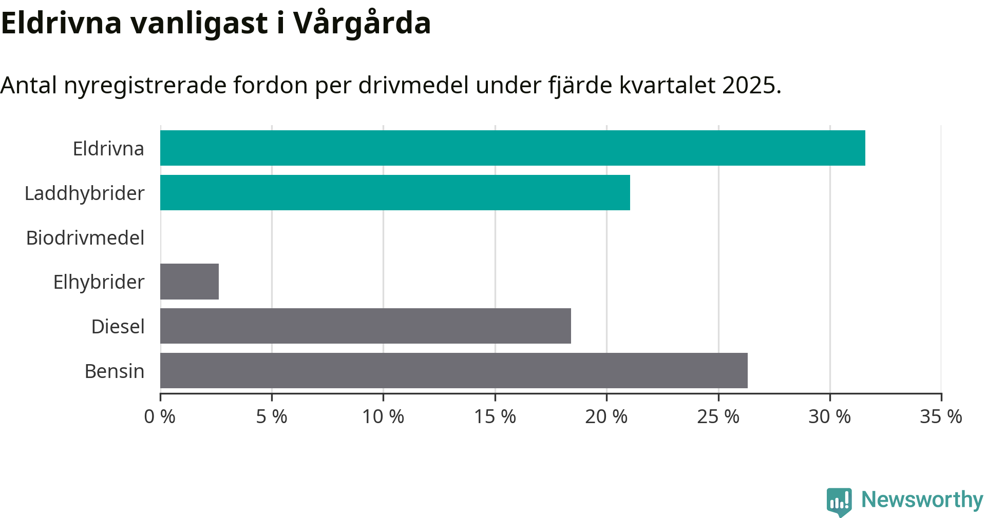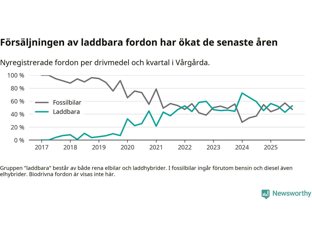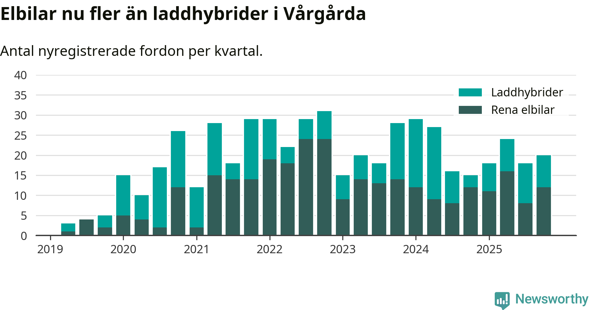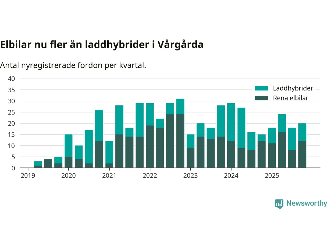 Under fjärde kvartalet 2025 var 53 procent av alla nyregistrerade personbilar i Vårgårda laddbara (sammanlagt registrerades 38 nya bilar). Merparten av de laddbara bilarna var rena elbilar (32 procent av alla).