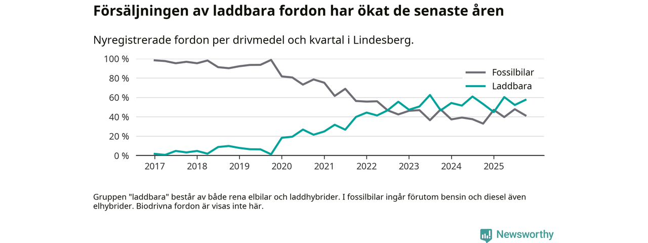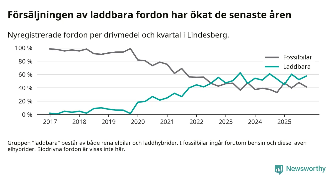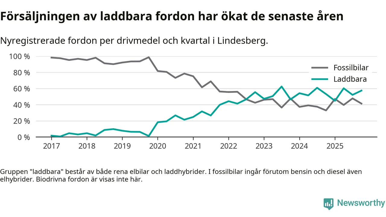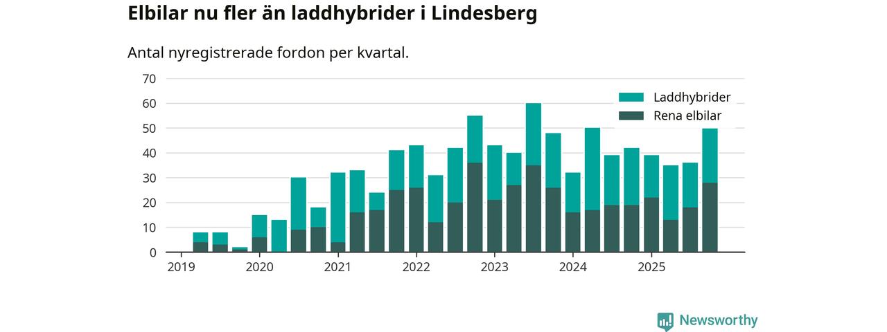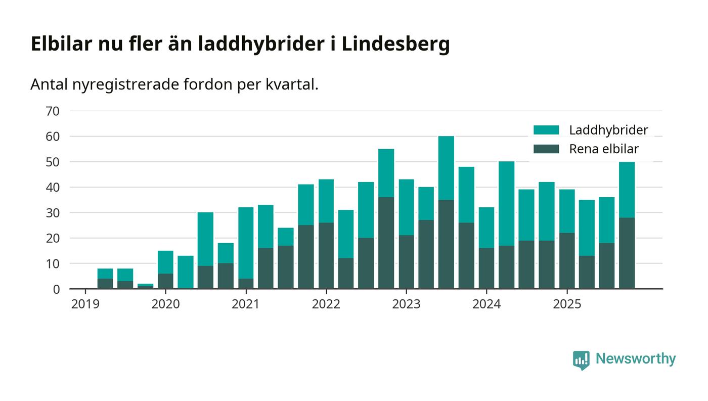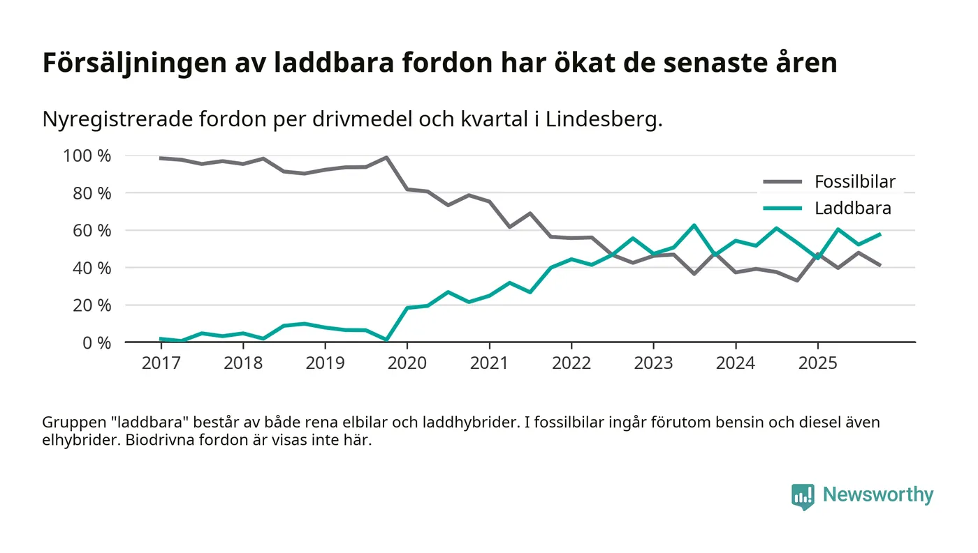 Under fjärde kvartalet 2025 var 57 procent av alla nyregistrerade personbilar i Lindesberg laddbara (sammanlagt registrerades 87 nya bilar). Merparten av de laddbara bilarna var rena elbilar (32 procent av alla).