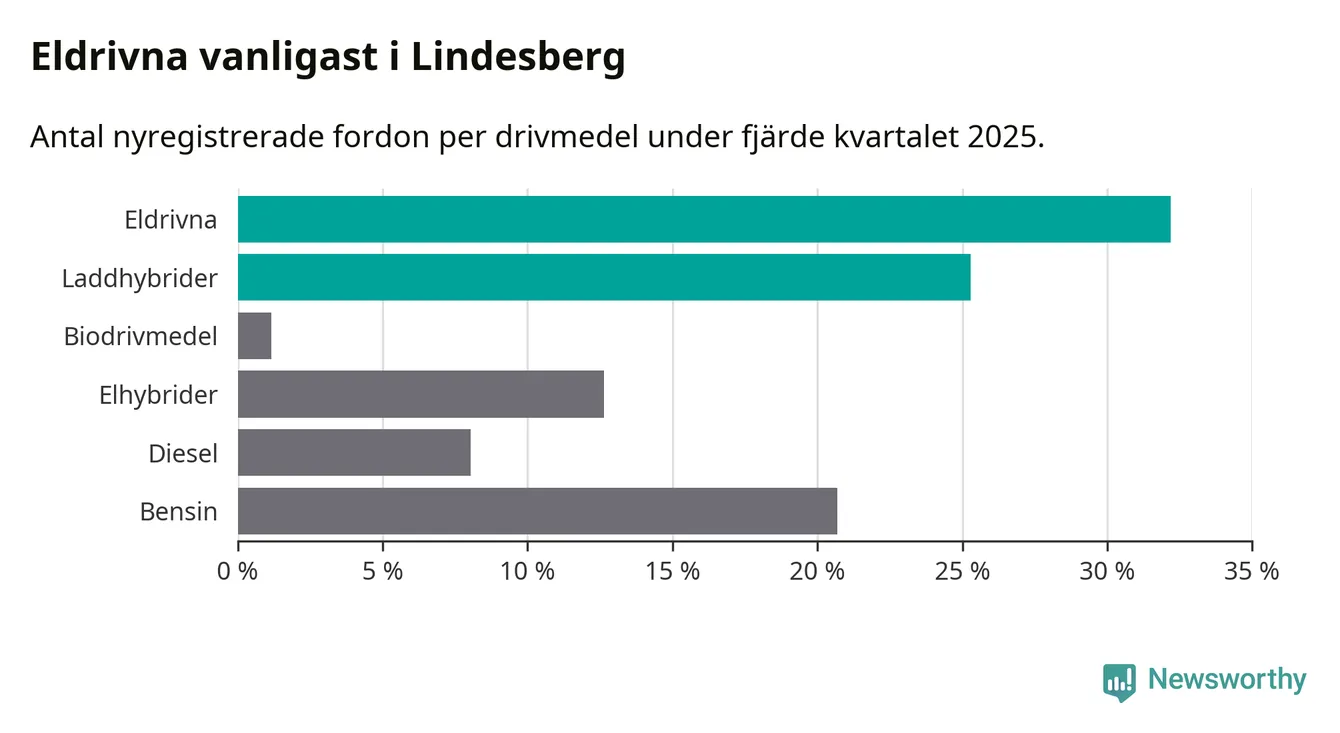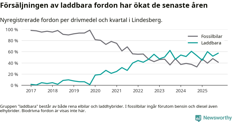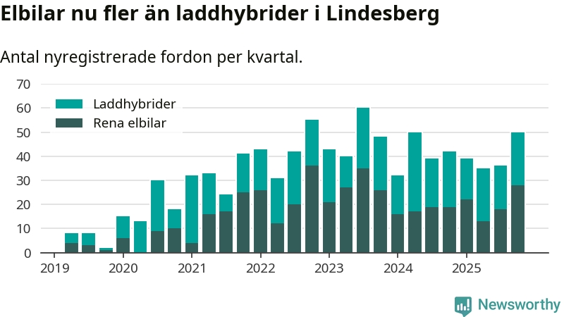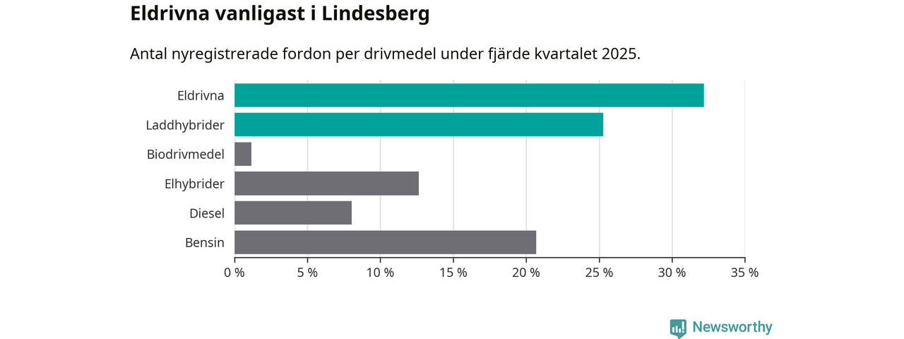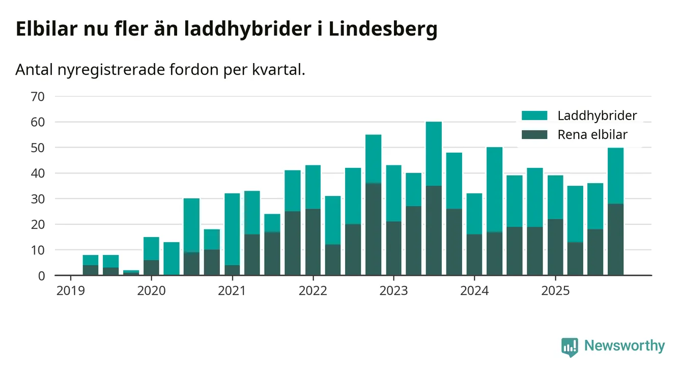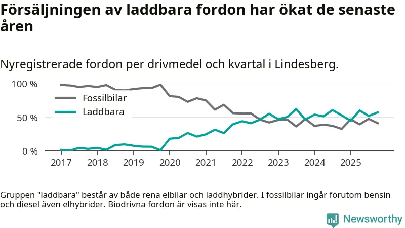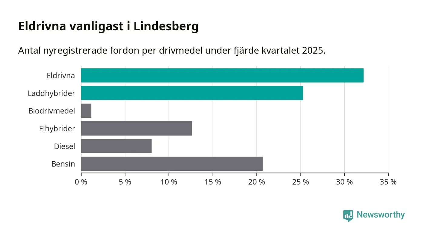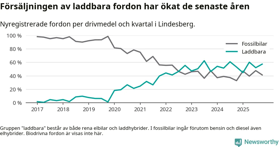 Under fjärde kvartalet 2025 var 57 procent av alla nyregistrerade personbilar i Lindesberg laddbara (sammanlagt registrerades 87 nya bilar). Merparten av de laddbara bilarna var rena elbilar (32 procent av alla).