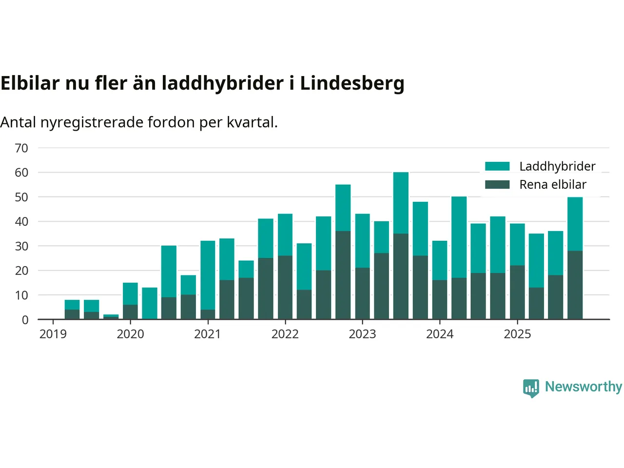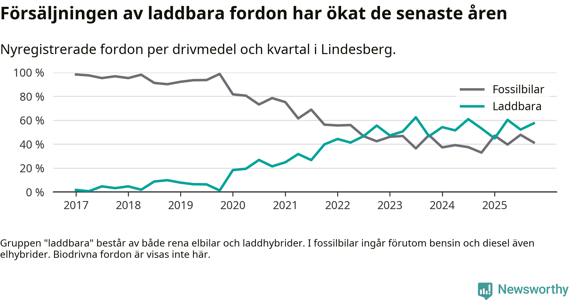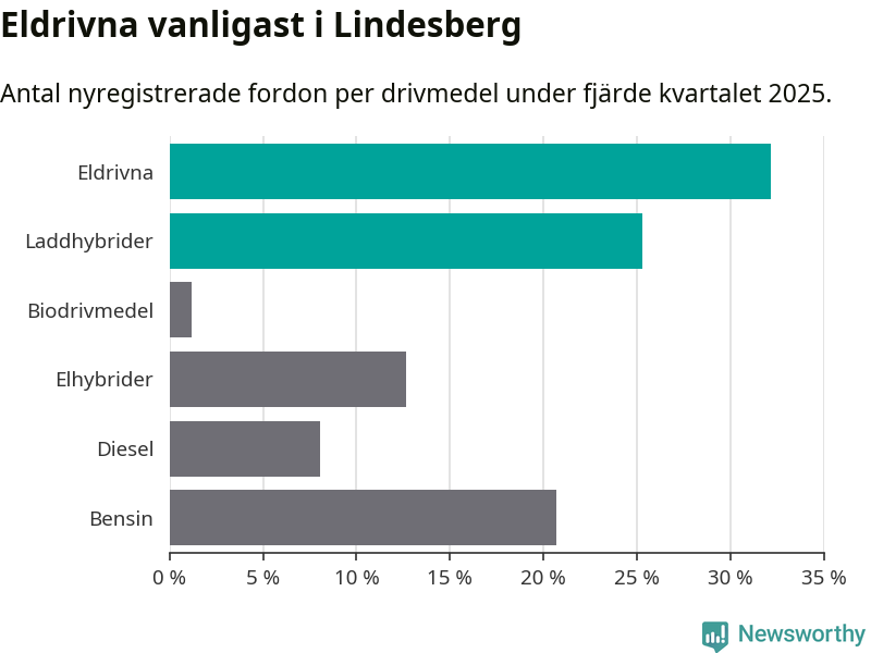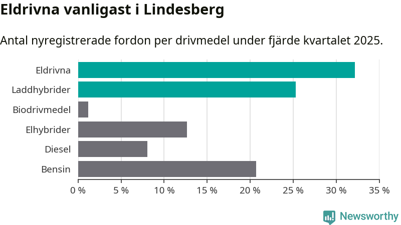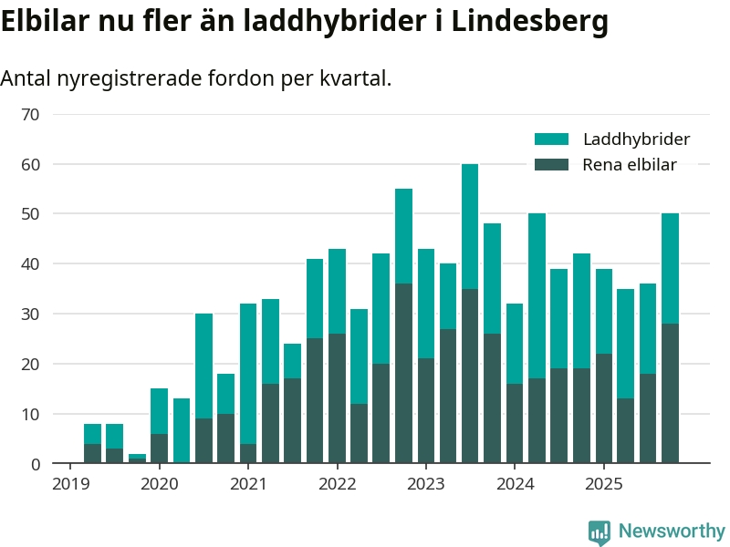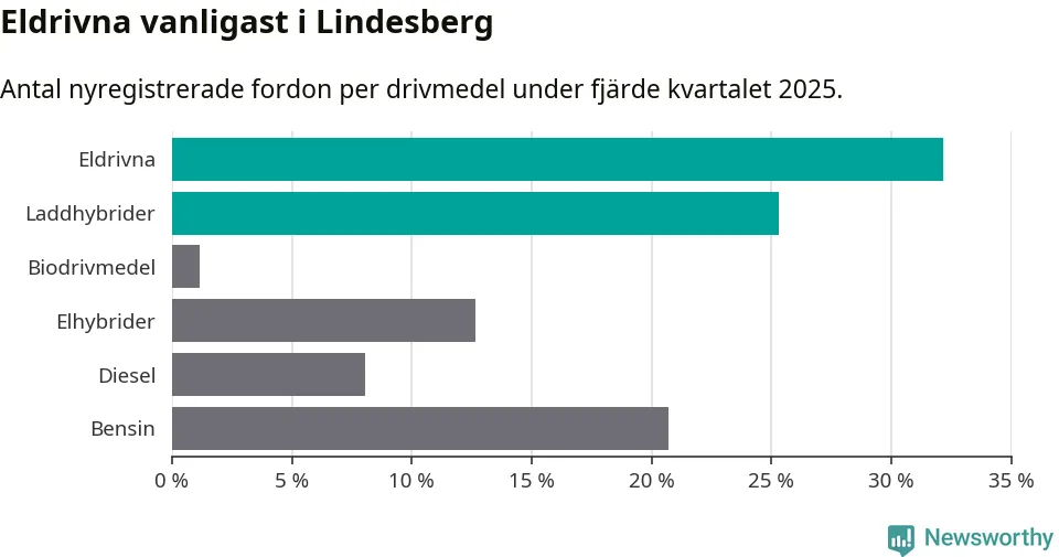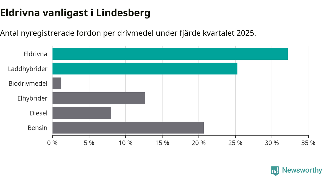 Under fjärde kvartalet 2025 var 57 procent av alla nyregistrerade personbilar i Lindesberg laddbara (sammanlagt registrerades 87 nya bilar). Merparten av de laddbara bilarna var rena elbilar (32 procent av alla).