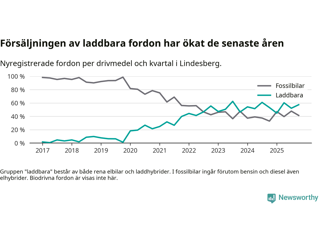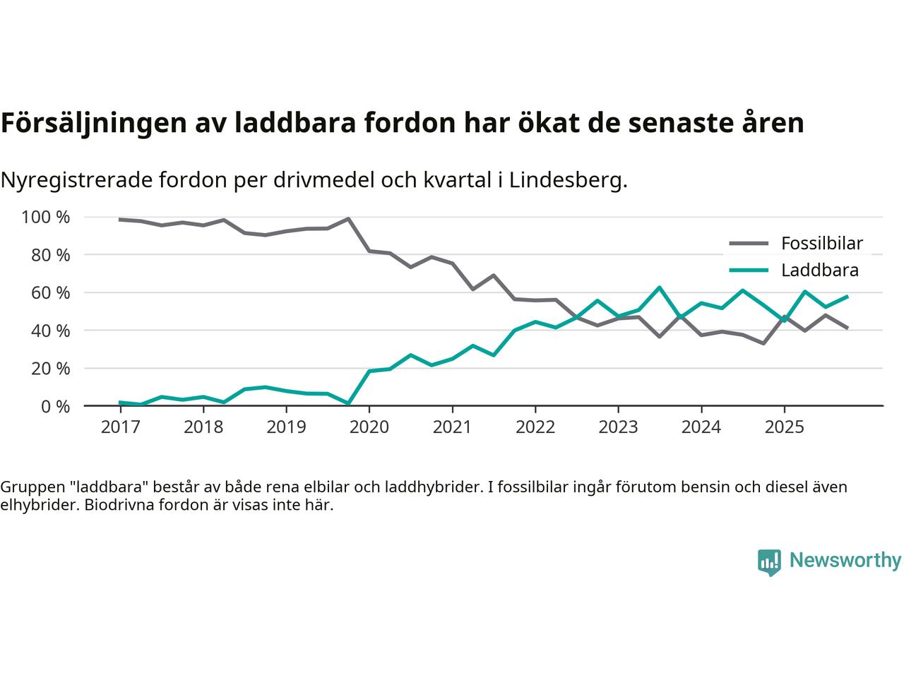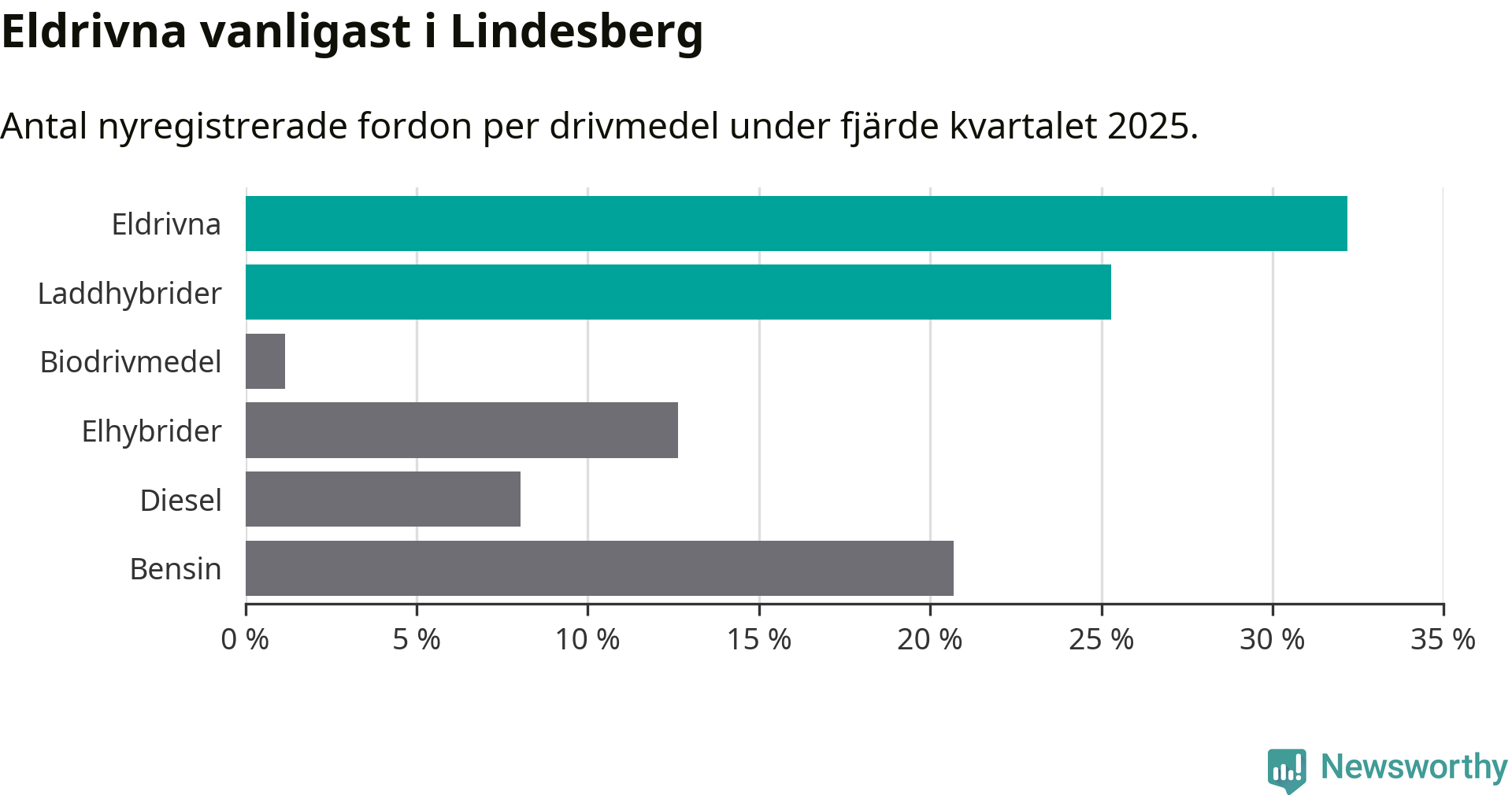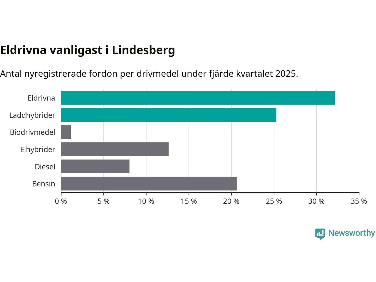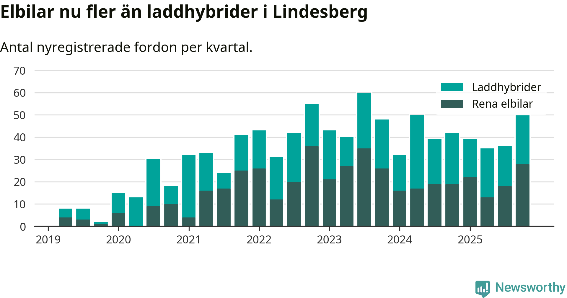 Under fjärde kvartalet 2025 var 57 procent av alla nyregistrerade personbilar i Lindesberg laddbara (sammanlagt registrerades 87 nya bilar). Merparten av de laddbara bilarna var rena elbilar (32 procent av alla).