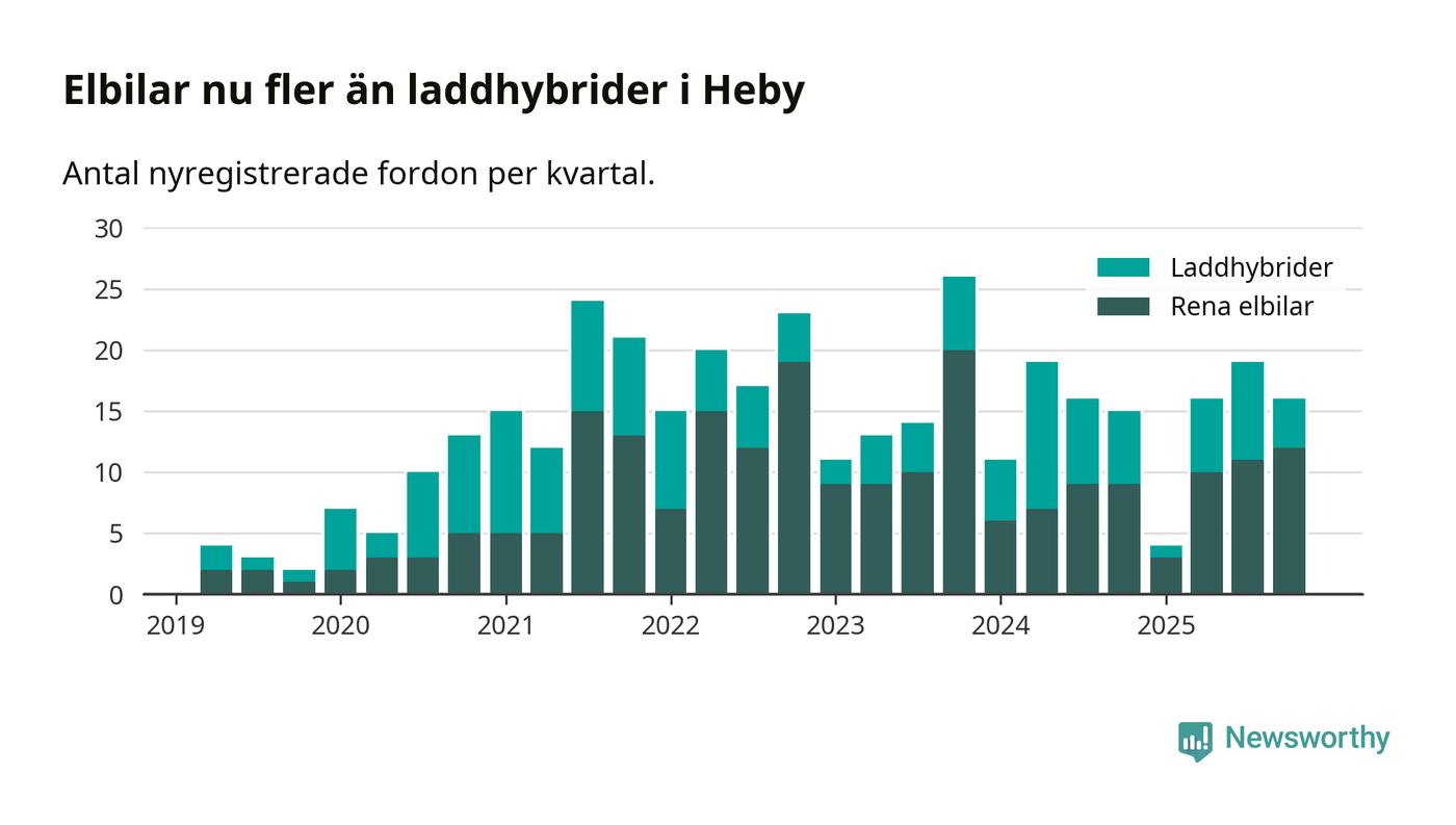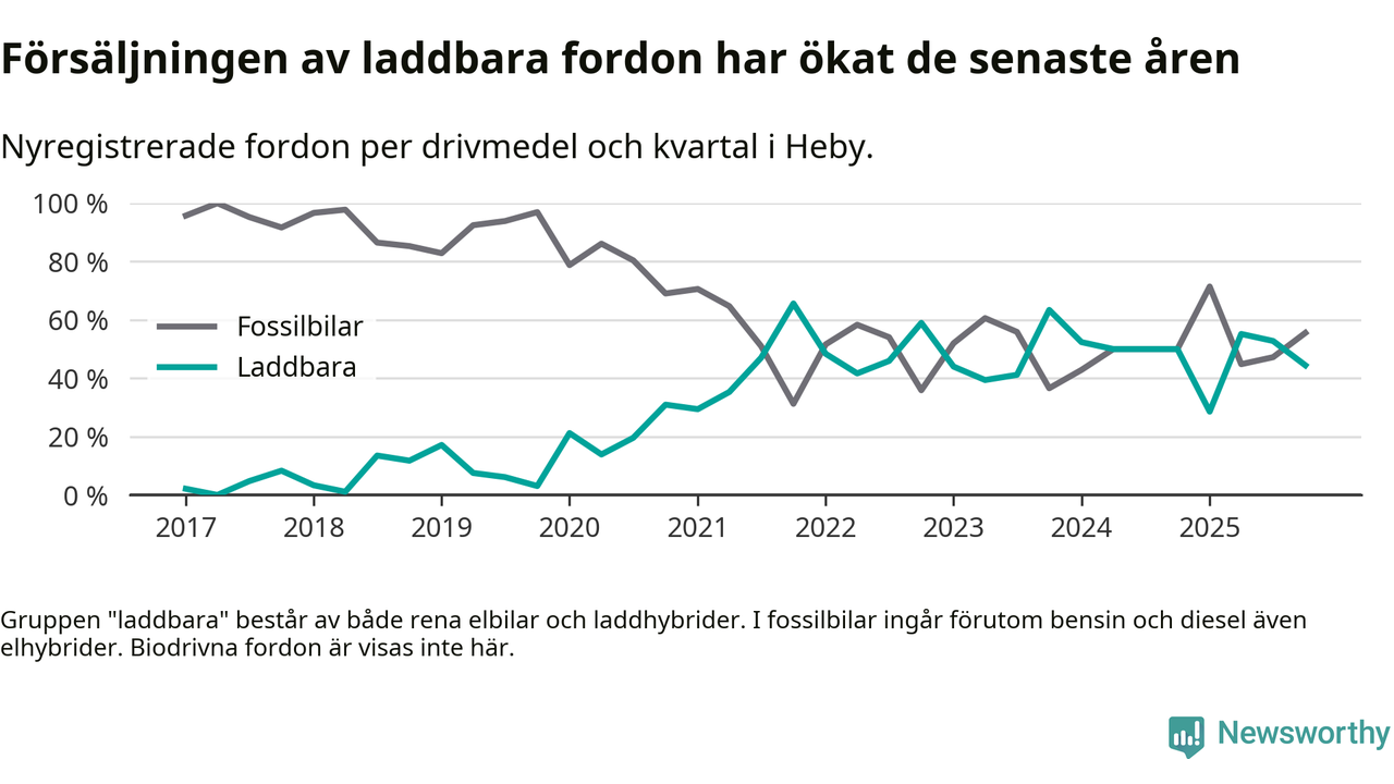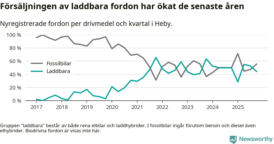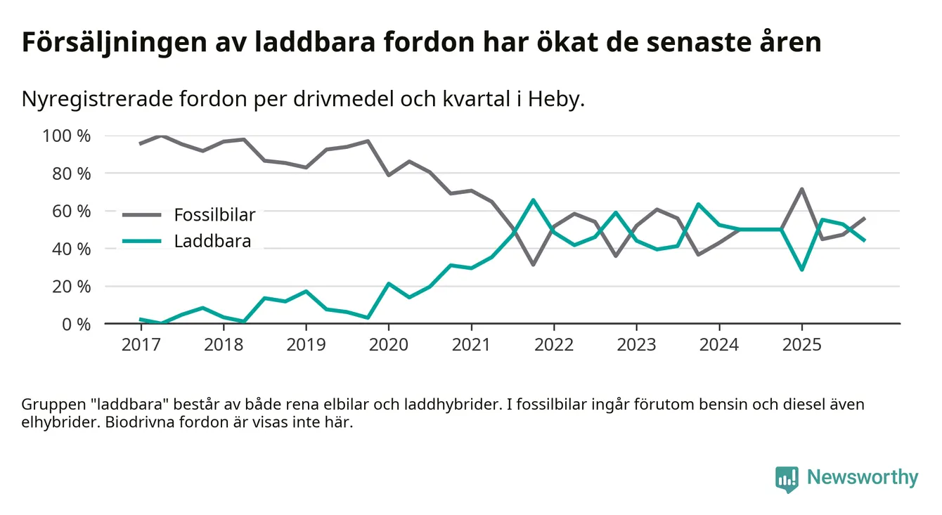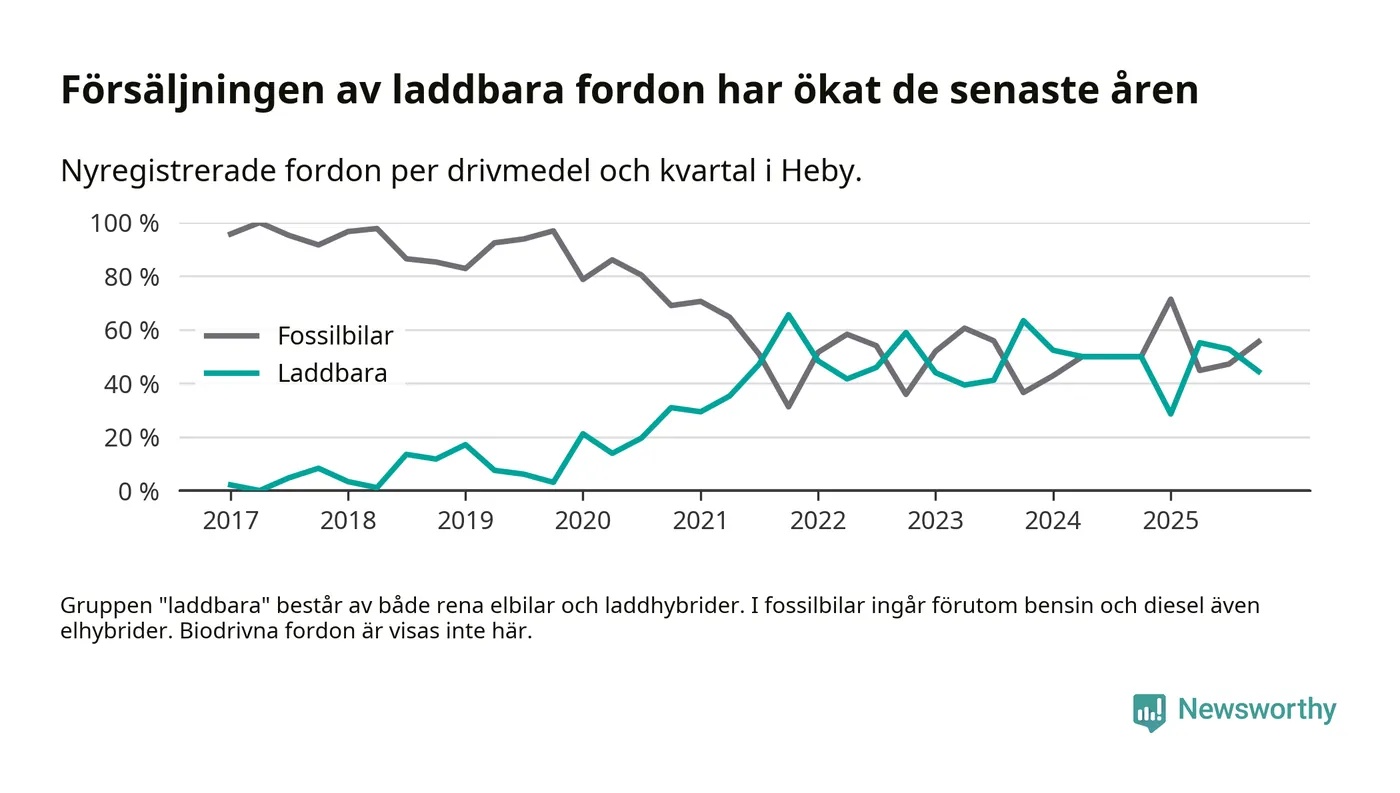Under fjärde kvartalet 2025 var 44 procent av alla nyregistrerade personbilar i Heby laddbara (sammanlagt registrerades 36 nya bilar). Merparten av de laddbara bilarna var rena elbilar (33 procent av alla).