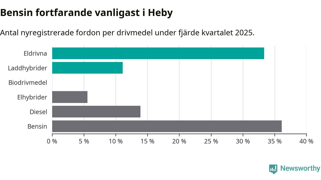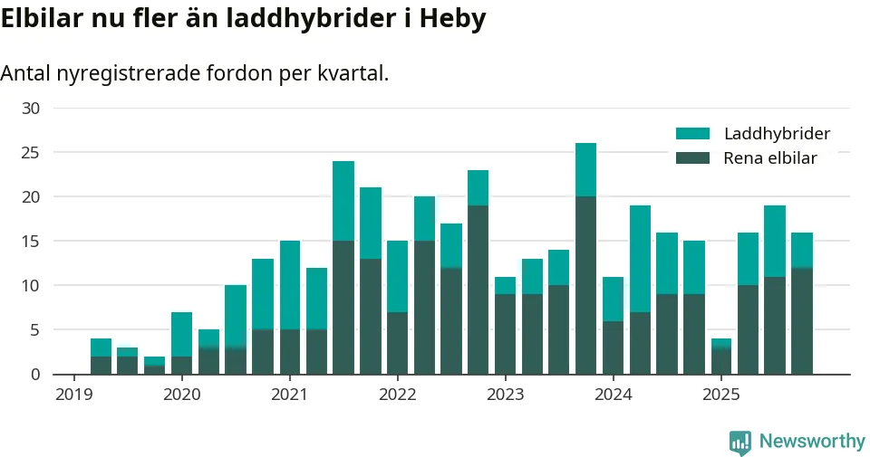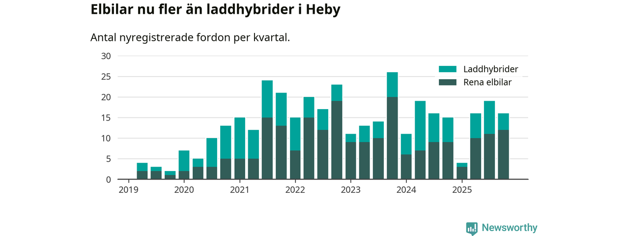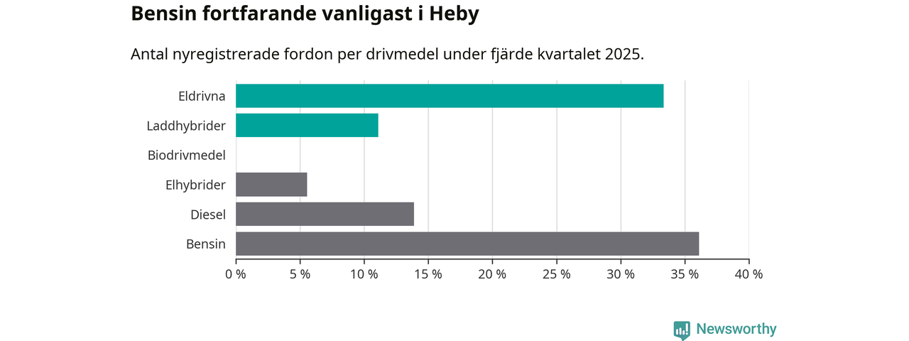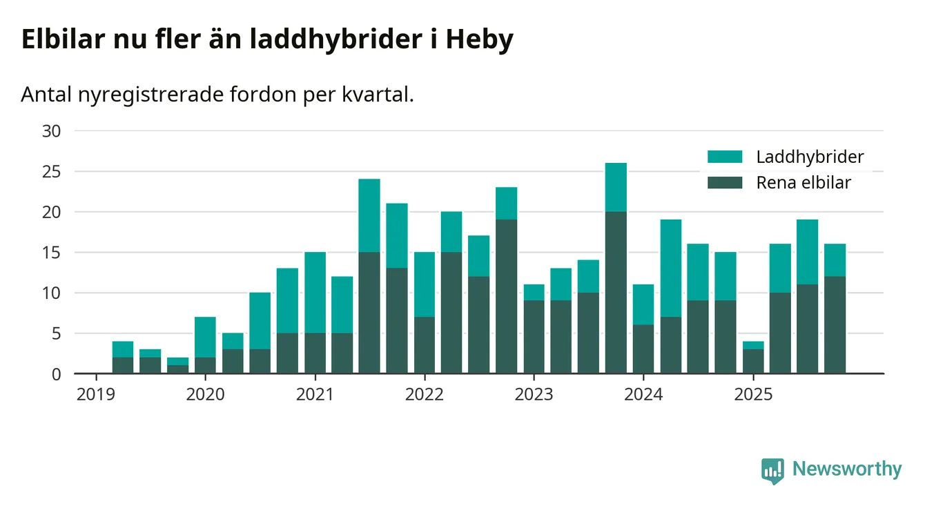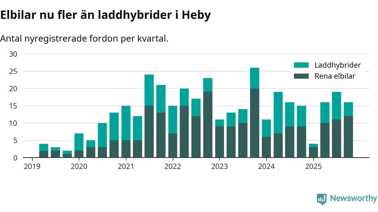 Under fjärde kvartalet 2025 var 44 procent av alla nyregistrerade personbilar i Heby laddbara (sammanlagt registrerades 36 nya bilar). Merparten av de laddbara bilarna var rena elbilar (33 procent av alla).