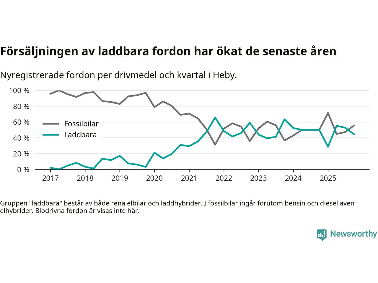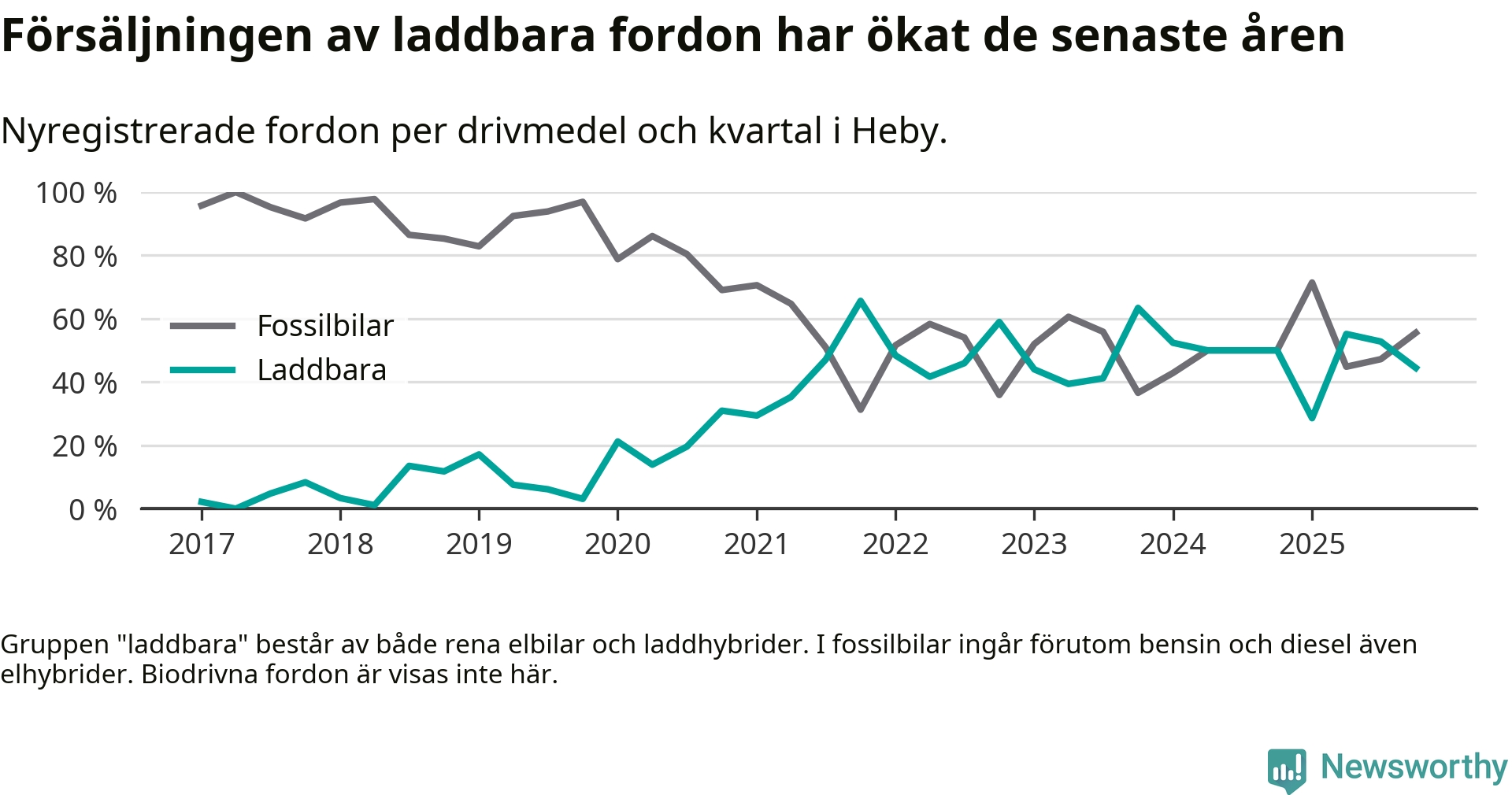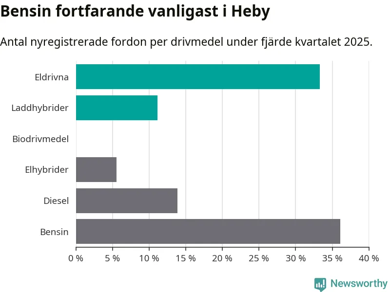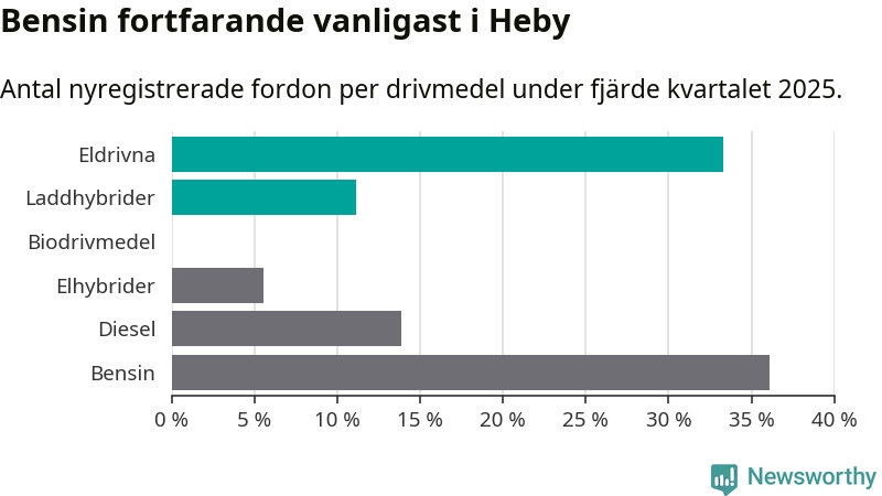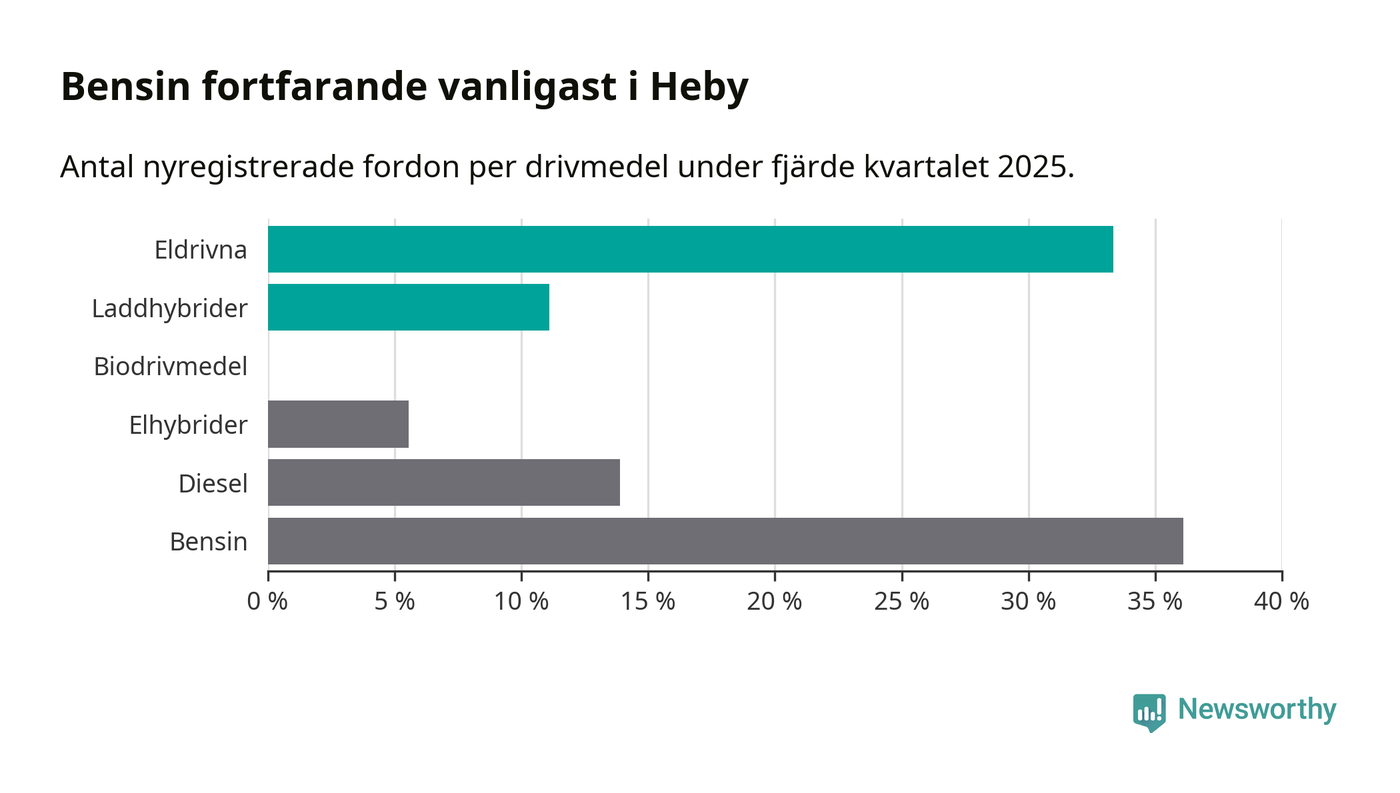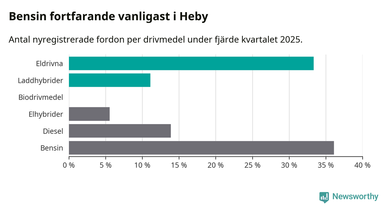 Under fjärde kvartalet 2025 var 44 procent av alla nyregistrerade personbilar i Heby laddbara (sammanlagt registrerades 36 nya bilar). Merparten av de laddbara bilarna var rena elbilar (33 procent av alla).