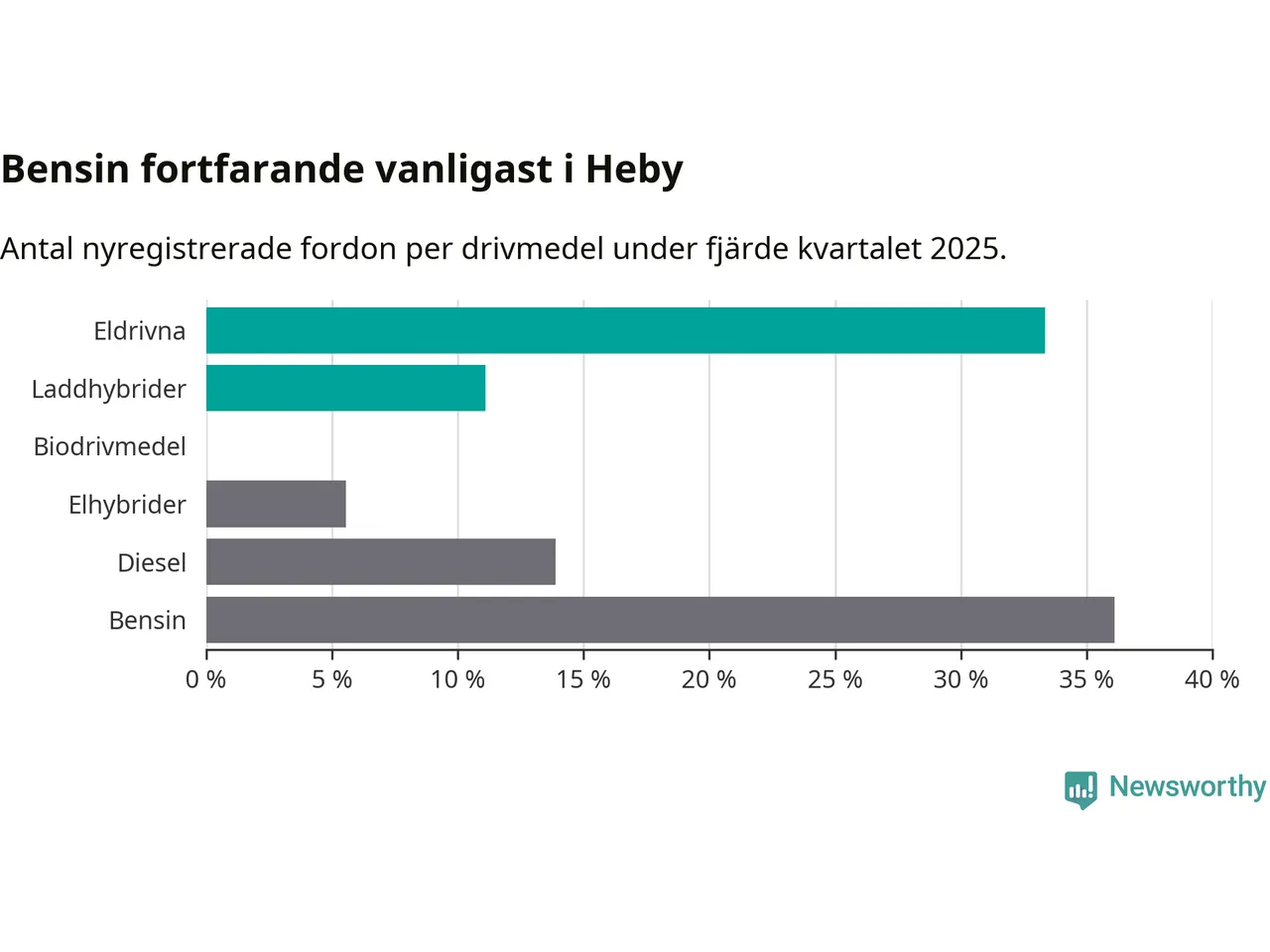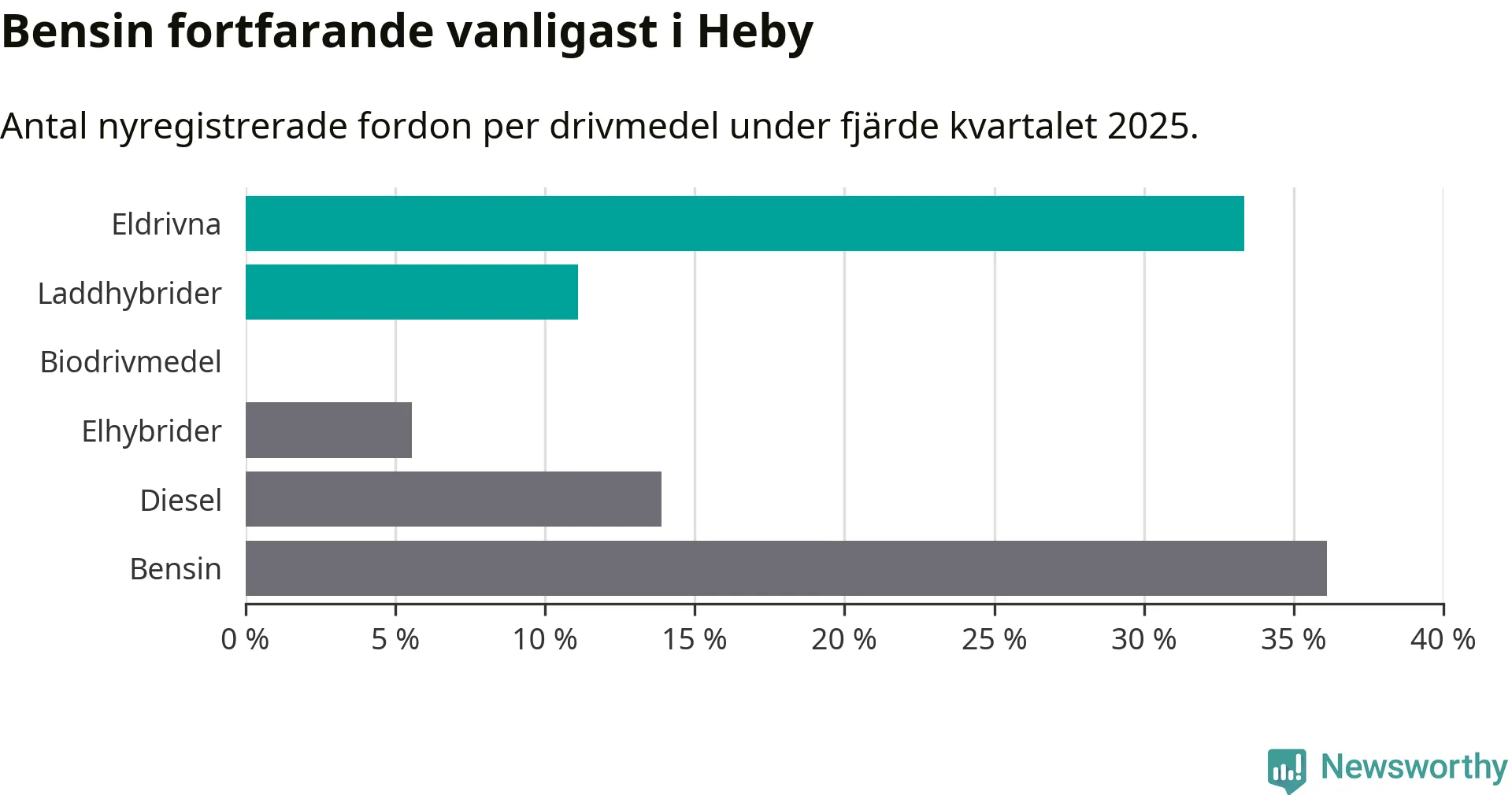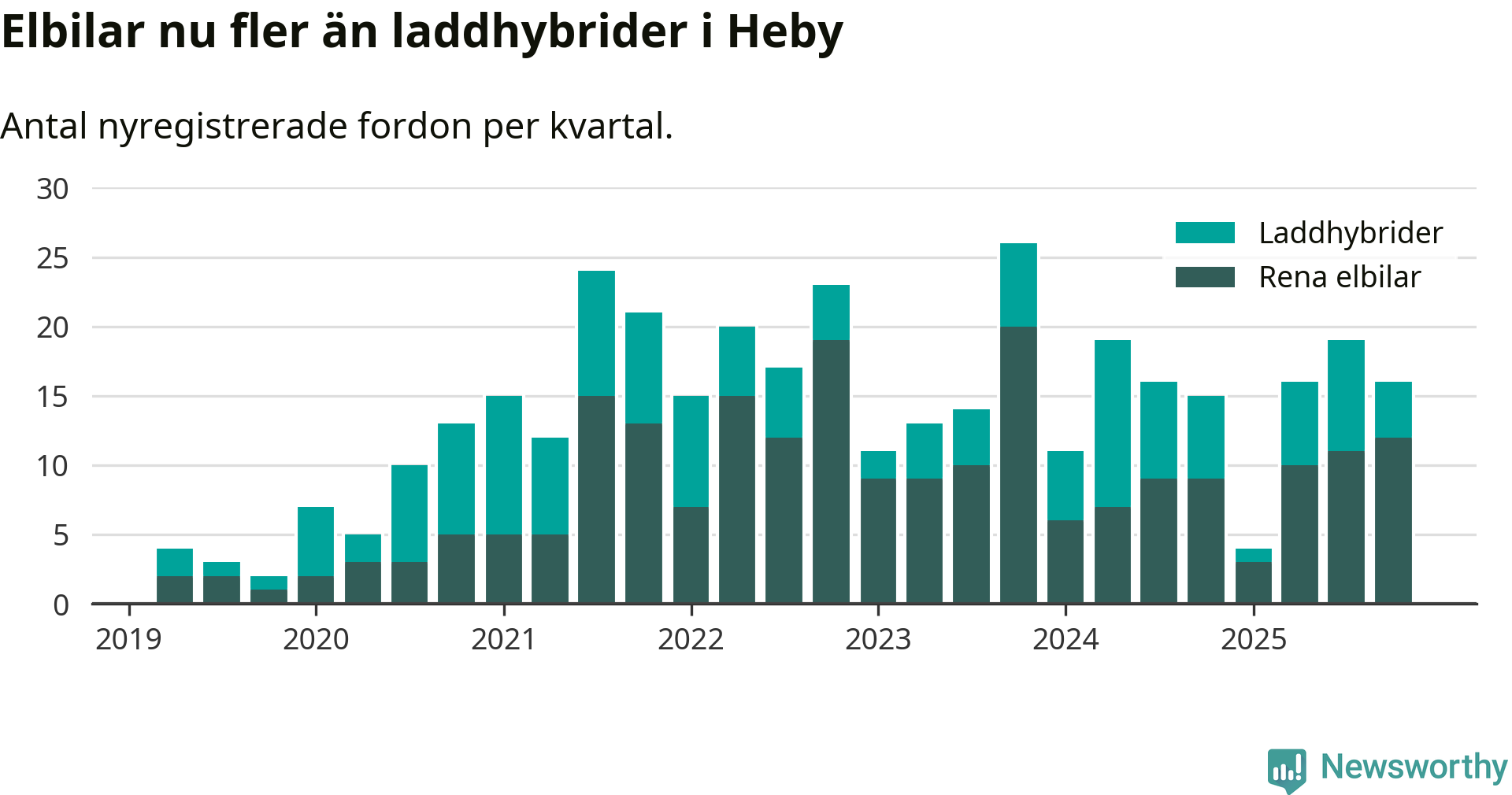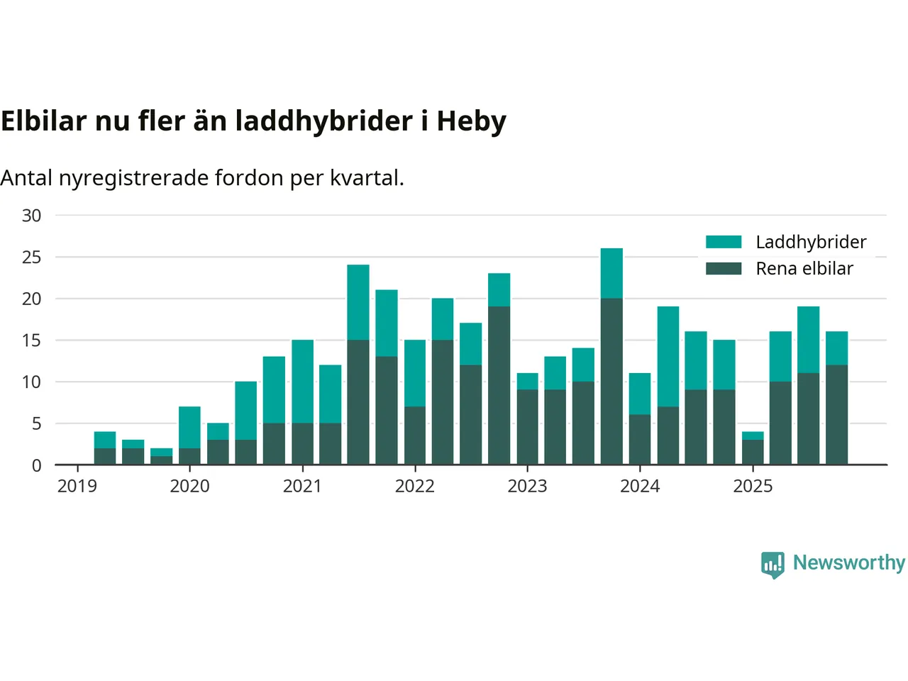 Under fjärde kvartalet 2025 var 44 procent av alla nyregistrerade personbilar i Heby laddbara (sammanlagt registrerades 36 nya bilar). Merparten av de laddbara bilarna var rena elbilar (33 procent av alla).