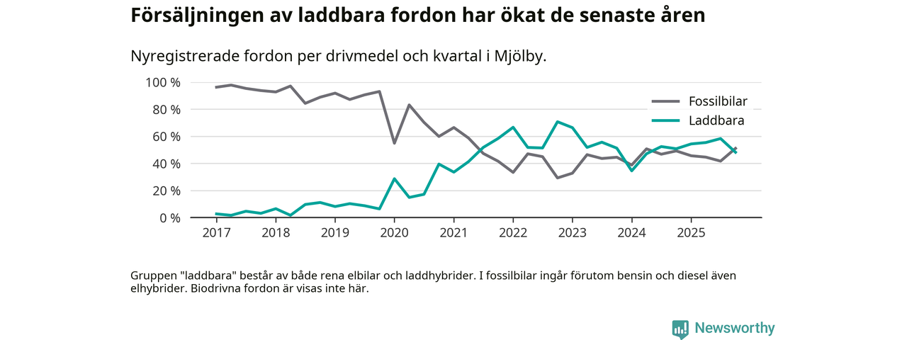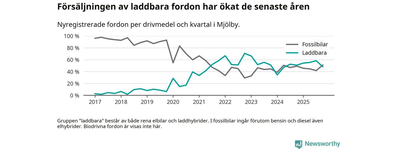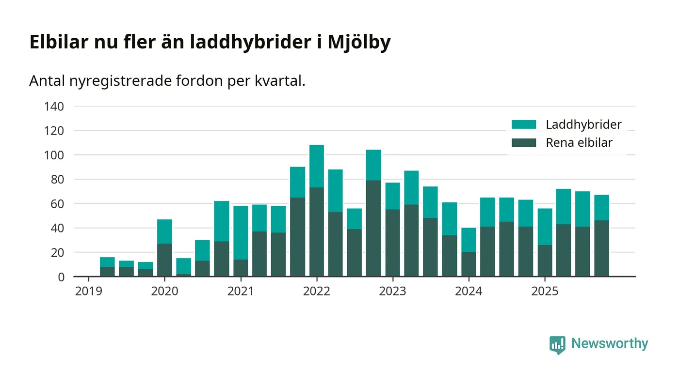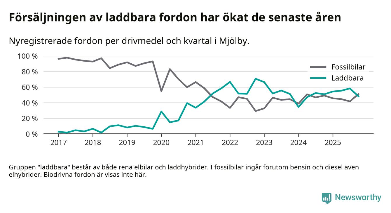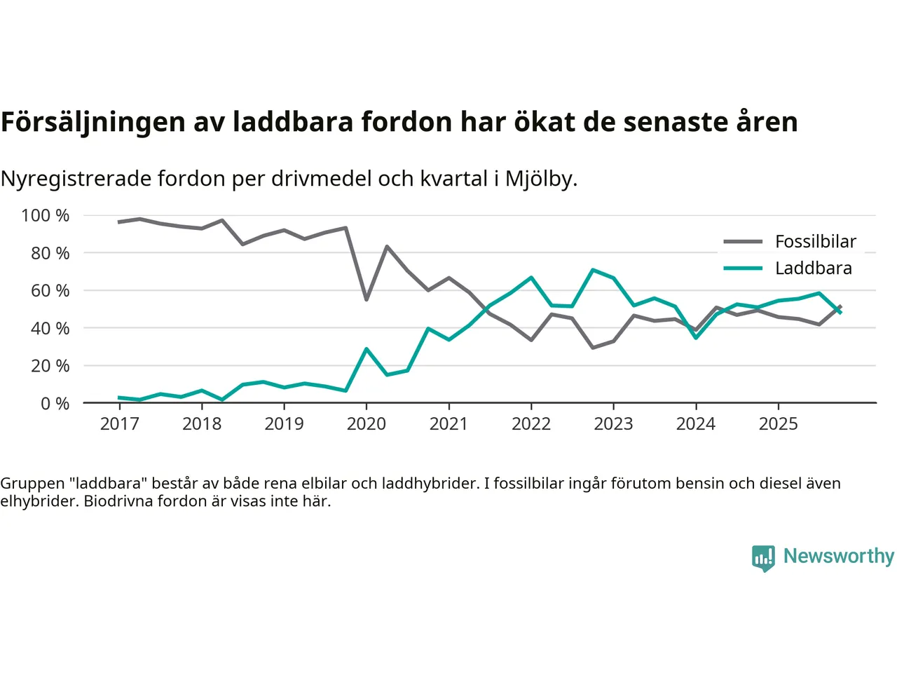 Under fjärde kvartalet 2025 var 48 procent av alla nyregistrerade personbilar i Mjölby laddbara (sammanlagt registrerades 139 nya bilar). Merparten av de laddbara bilarna var rena elbilar (33 procent av alla).