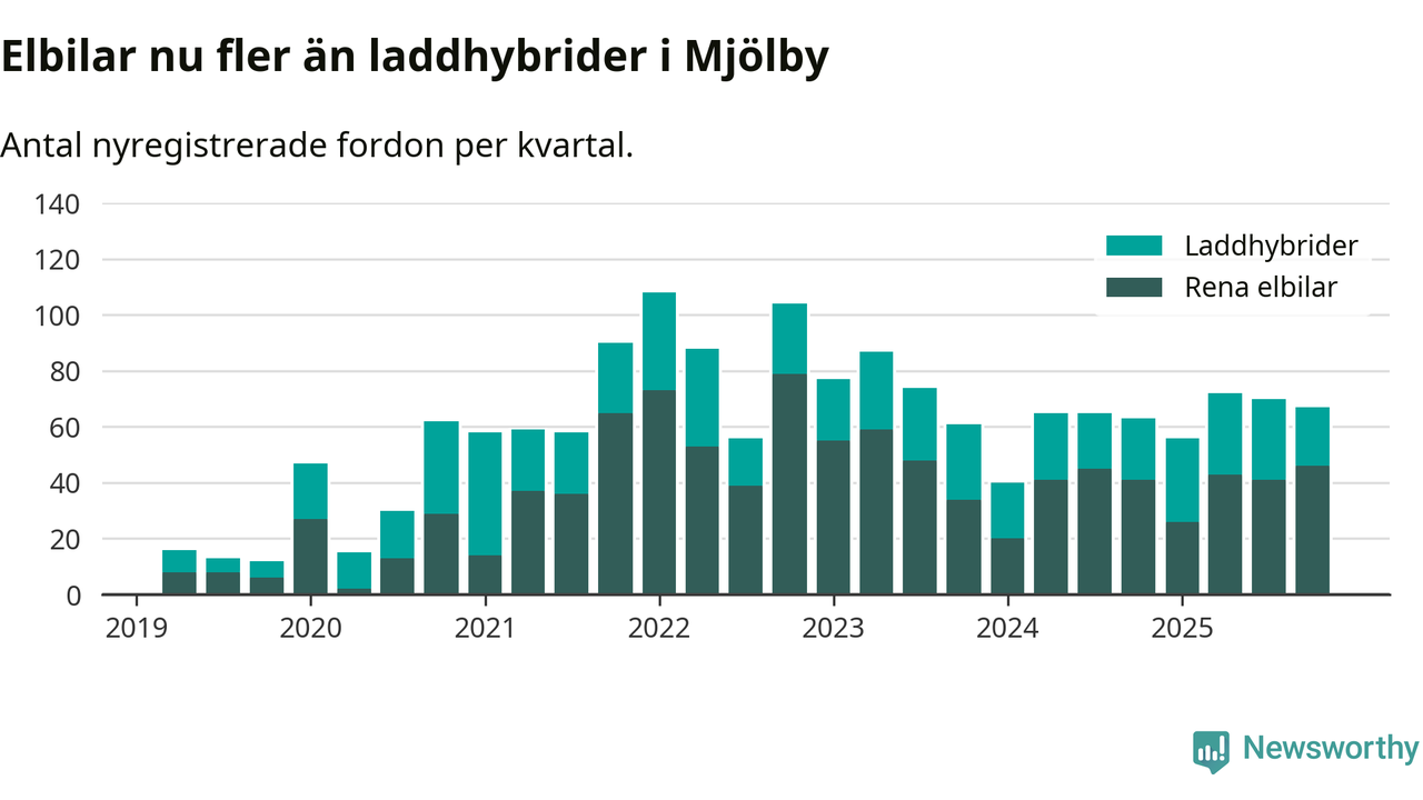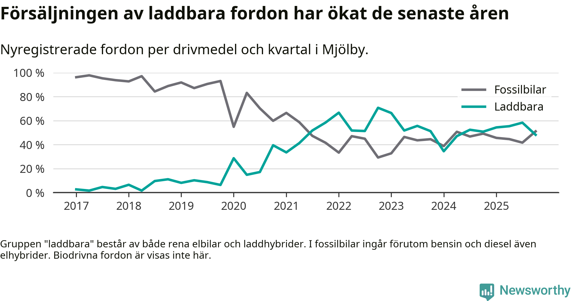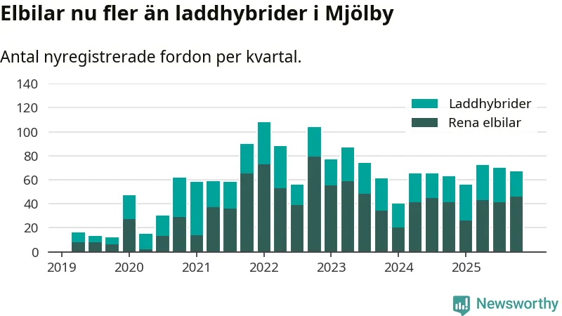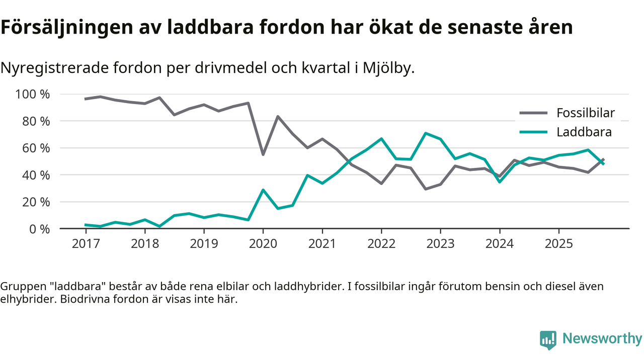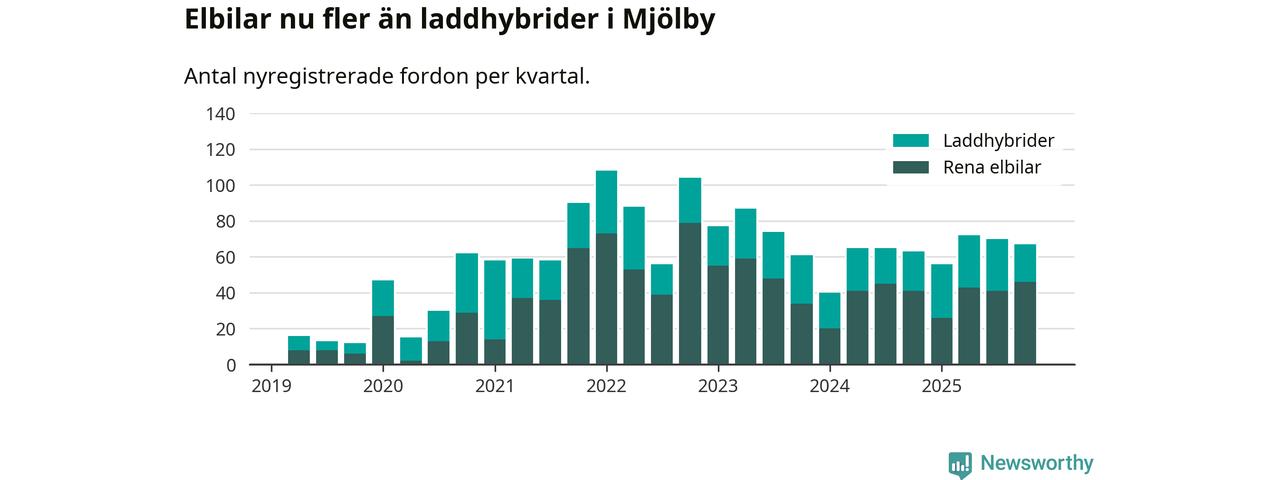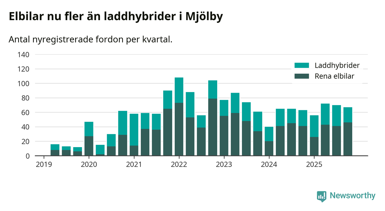 Under fjärde kvartalet 2025 var 48 procent av alla nyregistrerade personbilar i Mjölby laddbara (sammanlagt registrerades 139 nya bilar). Merparten av de laddbara bilarna var rena elbilar (33 procent av alla).