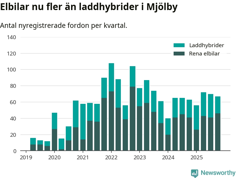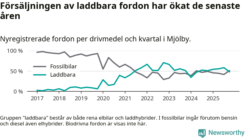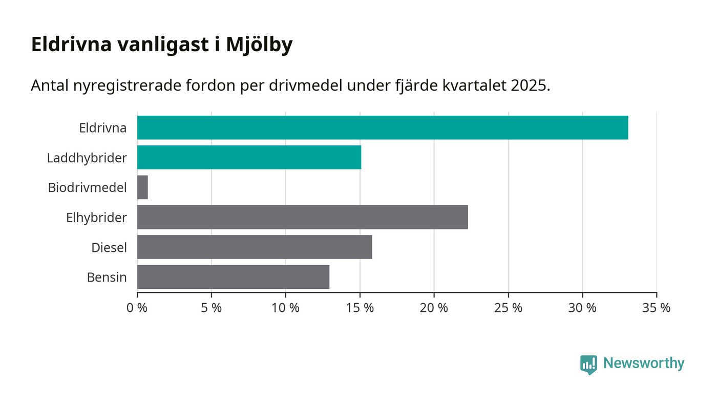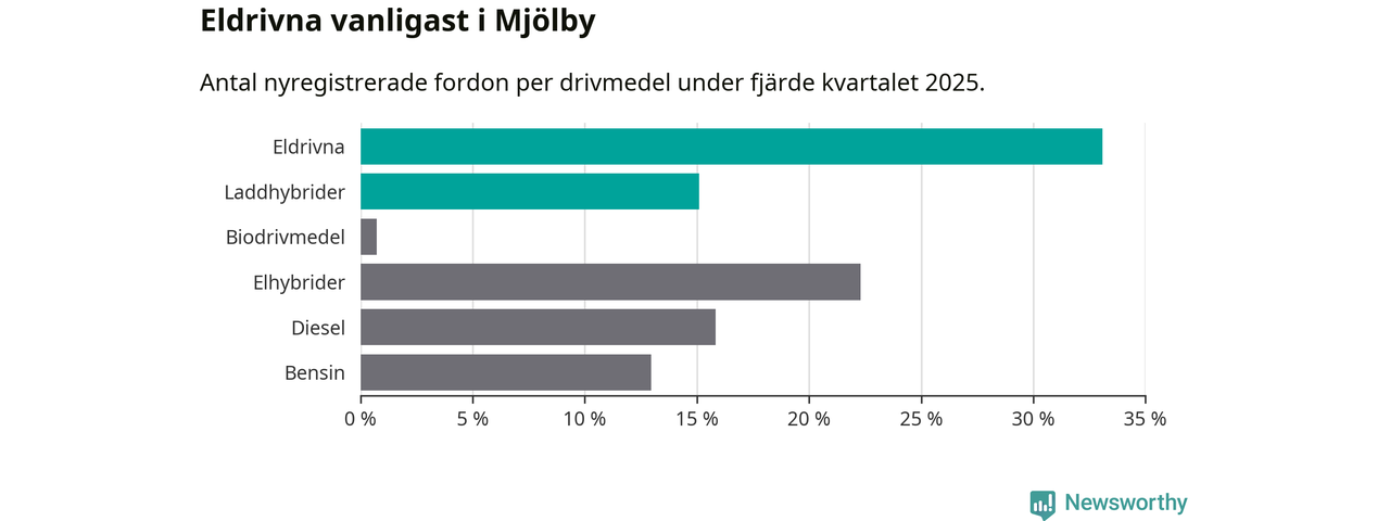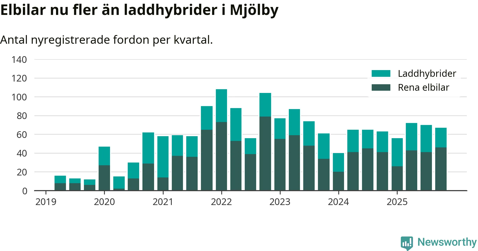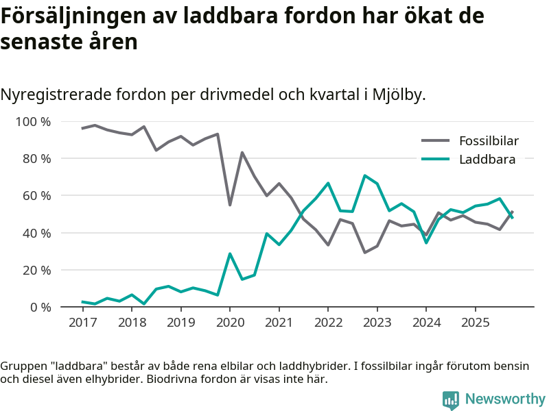Under fjärde kvartalet 2025 var 48 procent av alla nyregistrerade personbilar i Mjölby laddbara (sammanlagt registrerades 139 nya bilar). Merparten av de laddbara bilarna var rena elbilar (33 procent av alla).