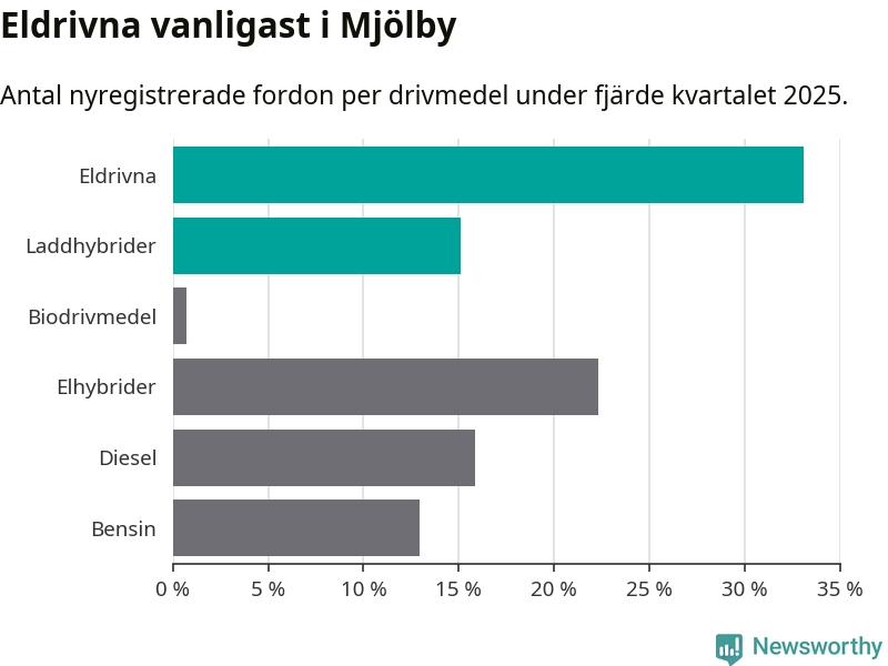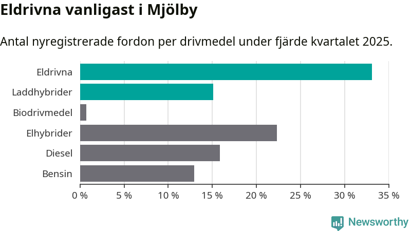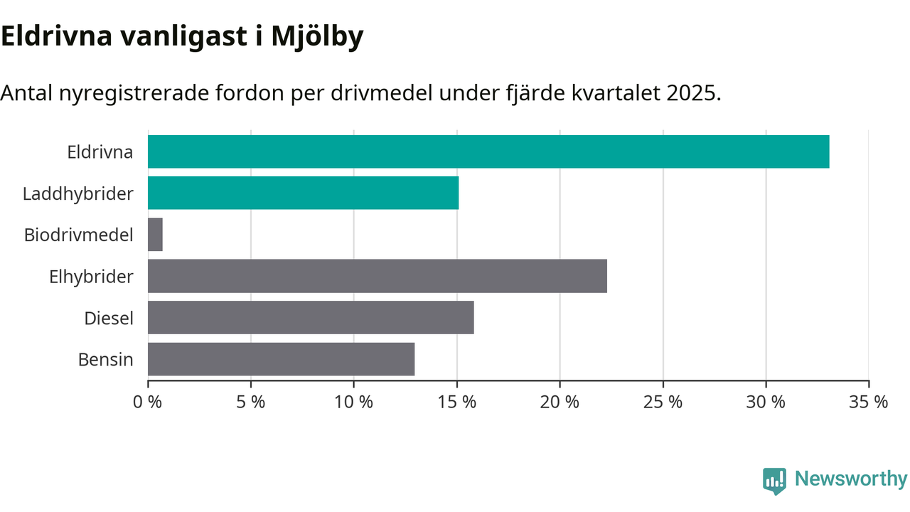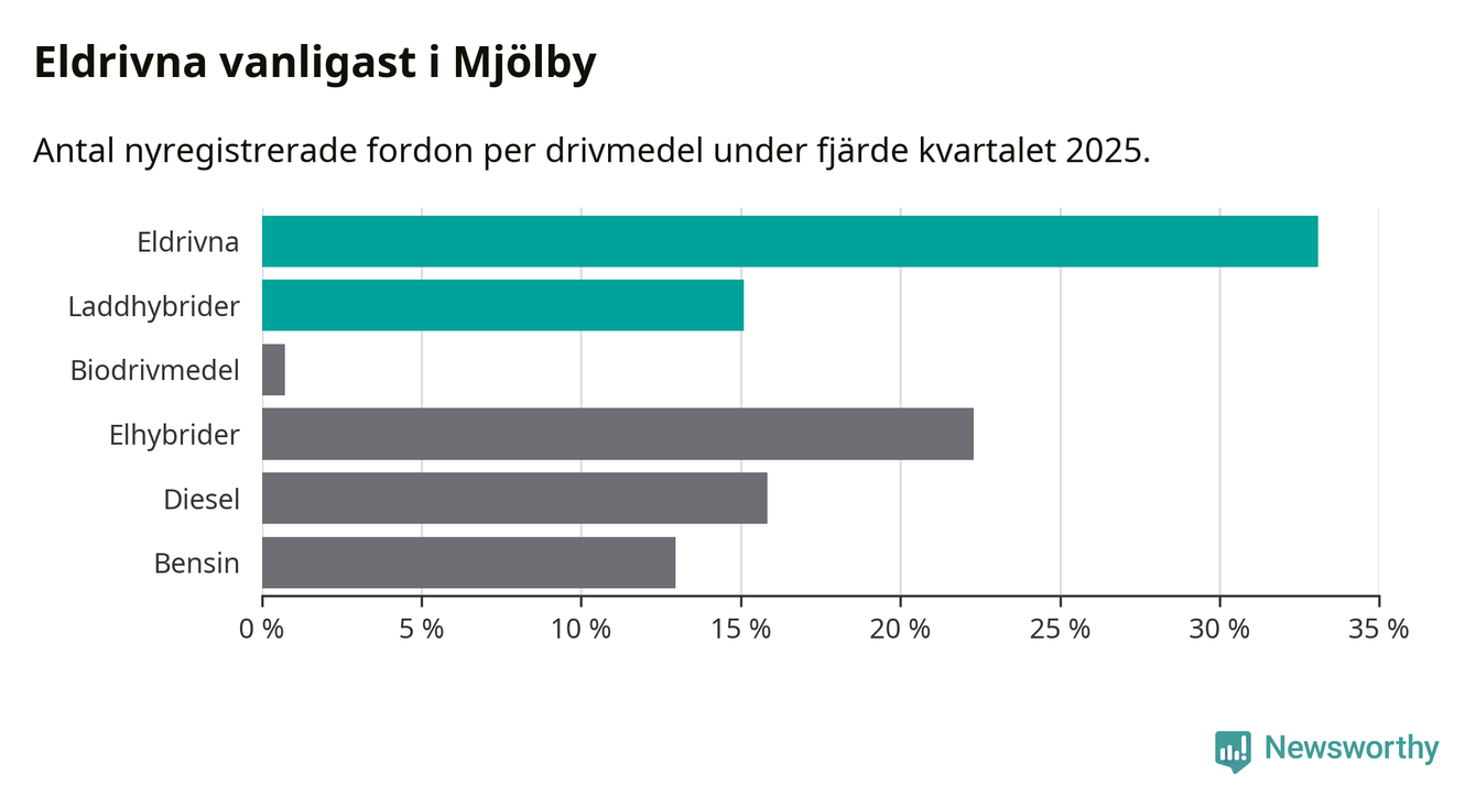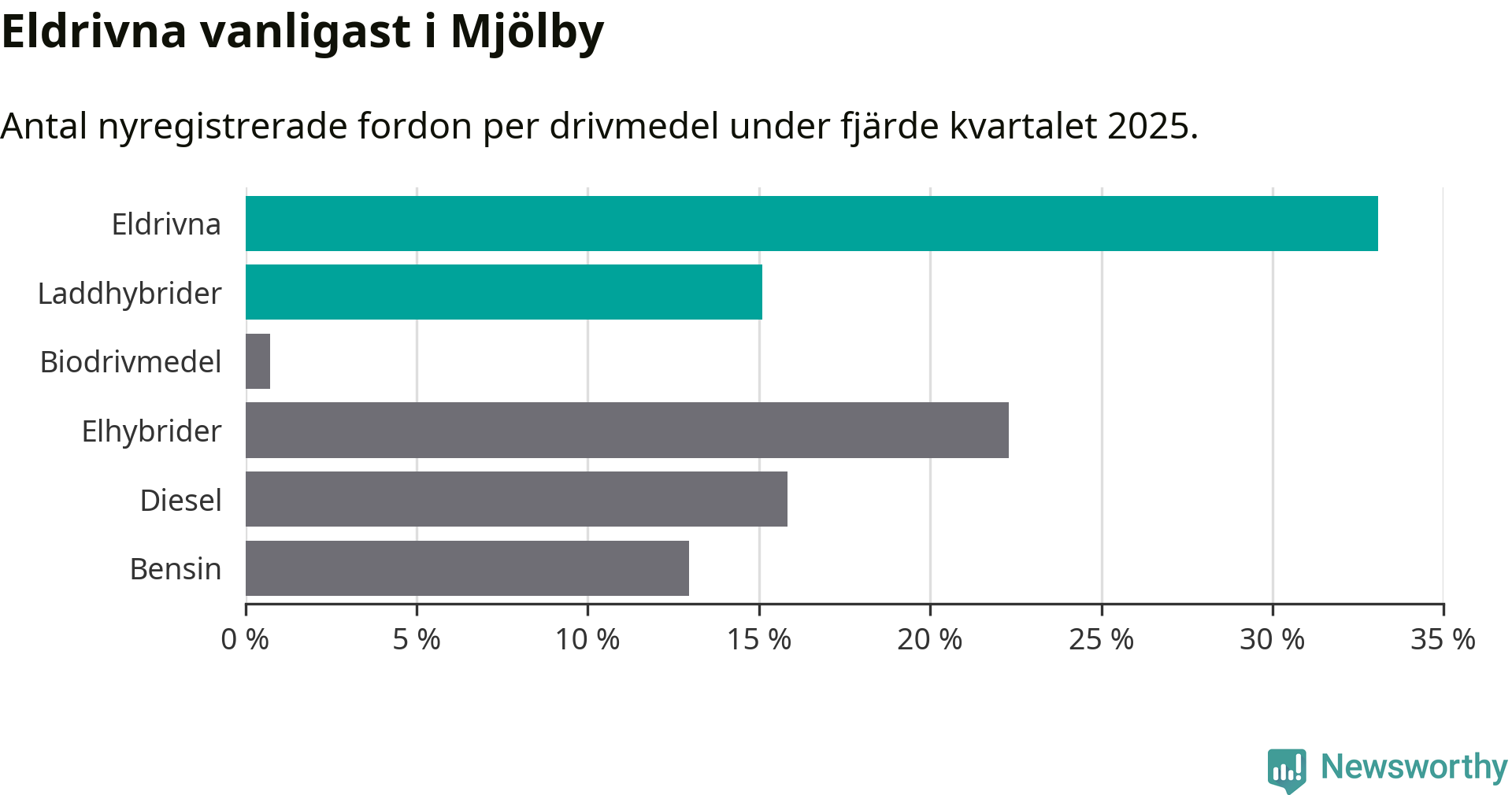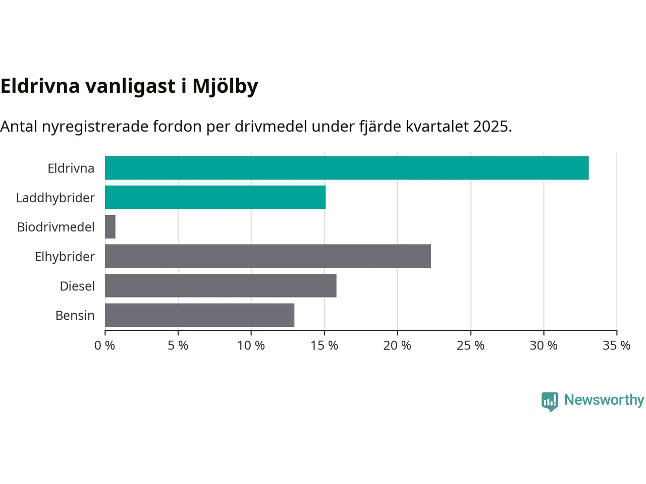 Under fjärde kvartalet 2025 var 48 procent av alla nyregistrerade personbilar i Mjölby laddbara (sammanlagt registrerades 139 nya bilar). Merparten av de laddbara bilarna var rena elbilar (33 procent av alla).