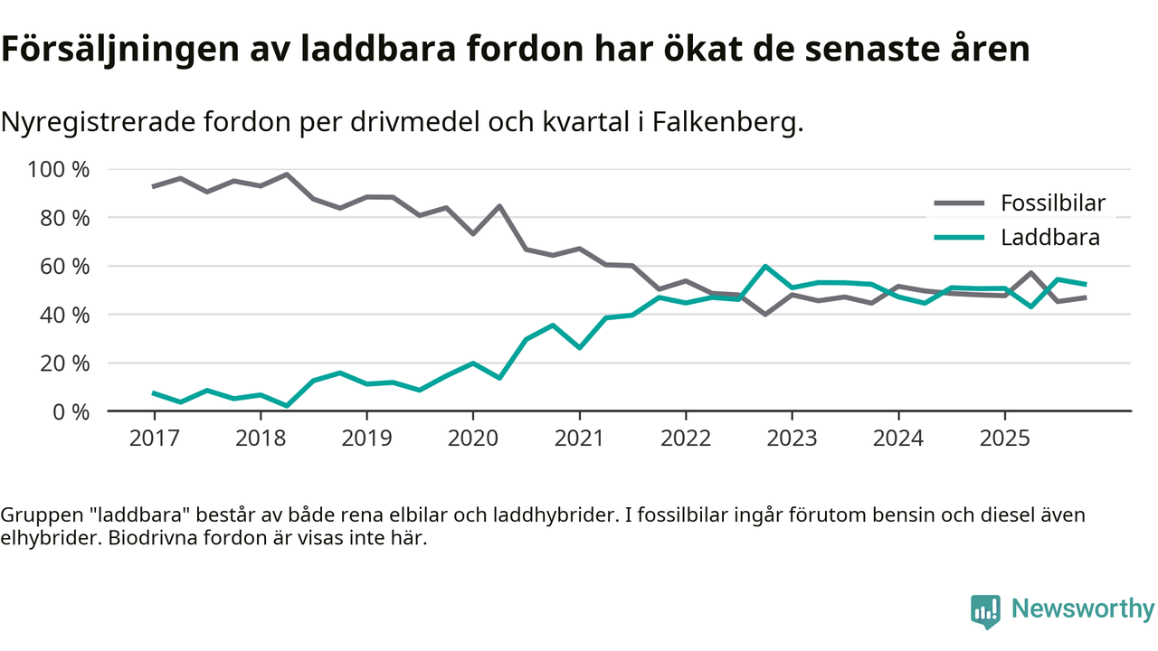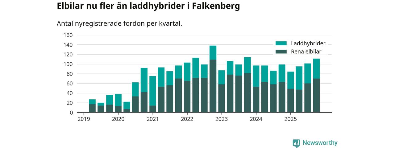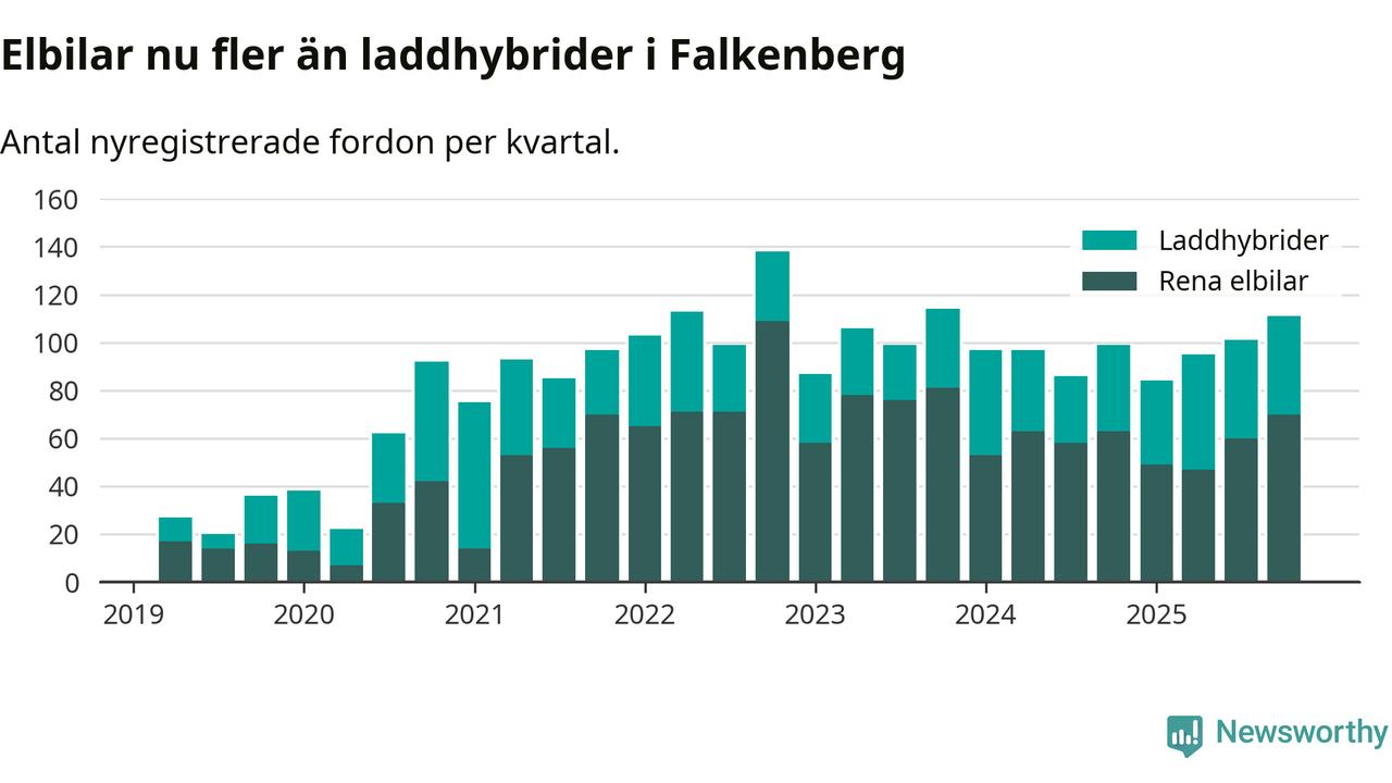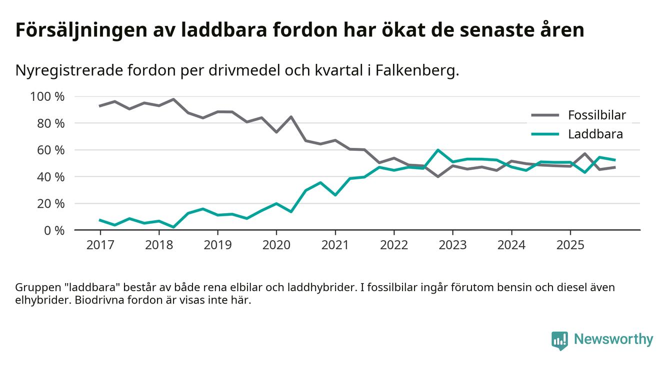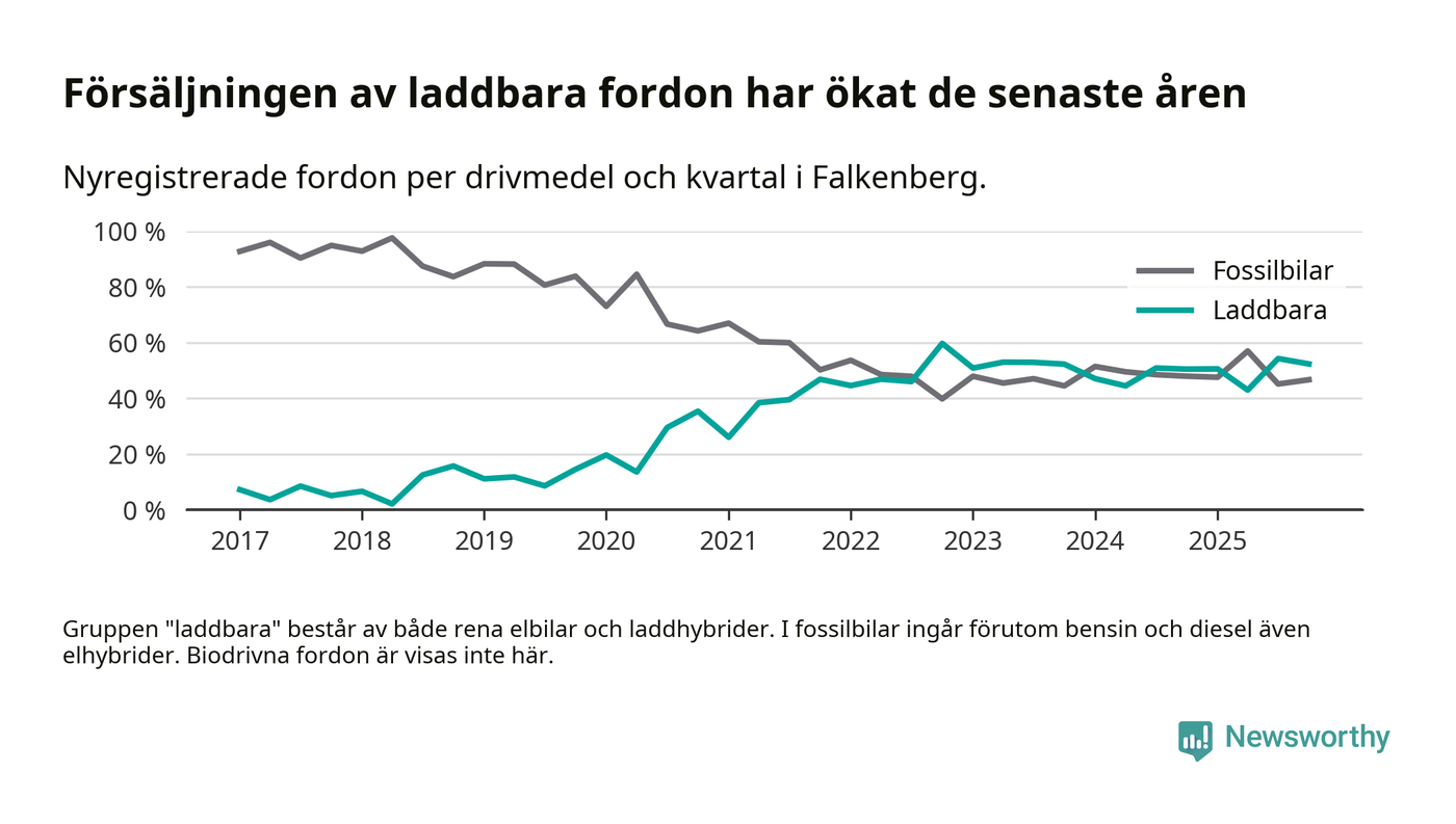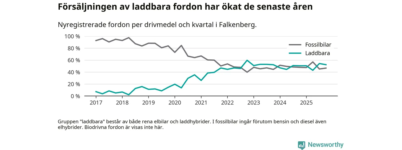 Under fjärde kvartalet 2025 var 52 procent av alla nyregistrerade personbilar i Falkenberg laddbara (sammanlagt registrerades 212 nya bilar). Merparten av de laddbara bilarna var rena elbilar (33 procent av alla).