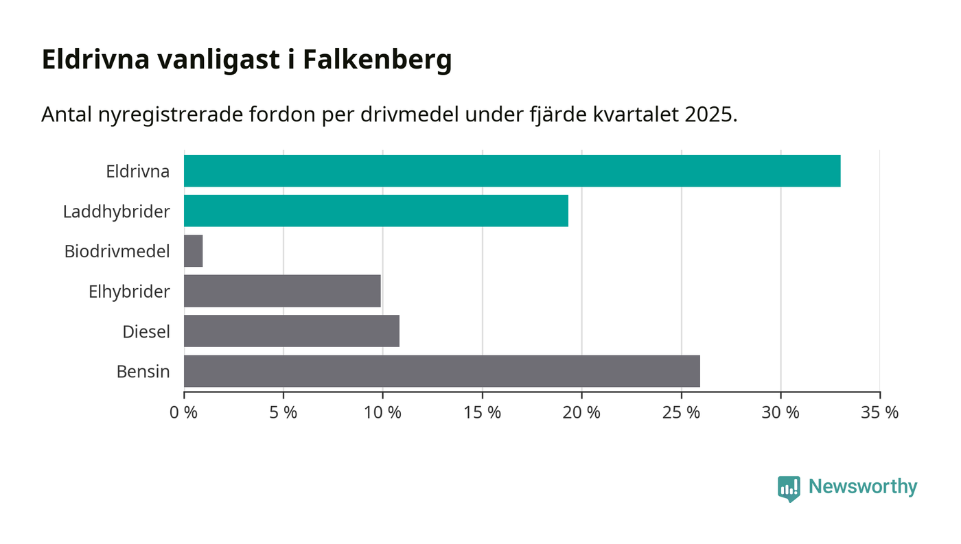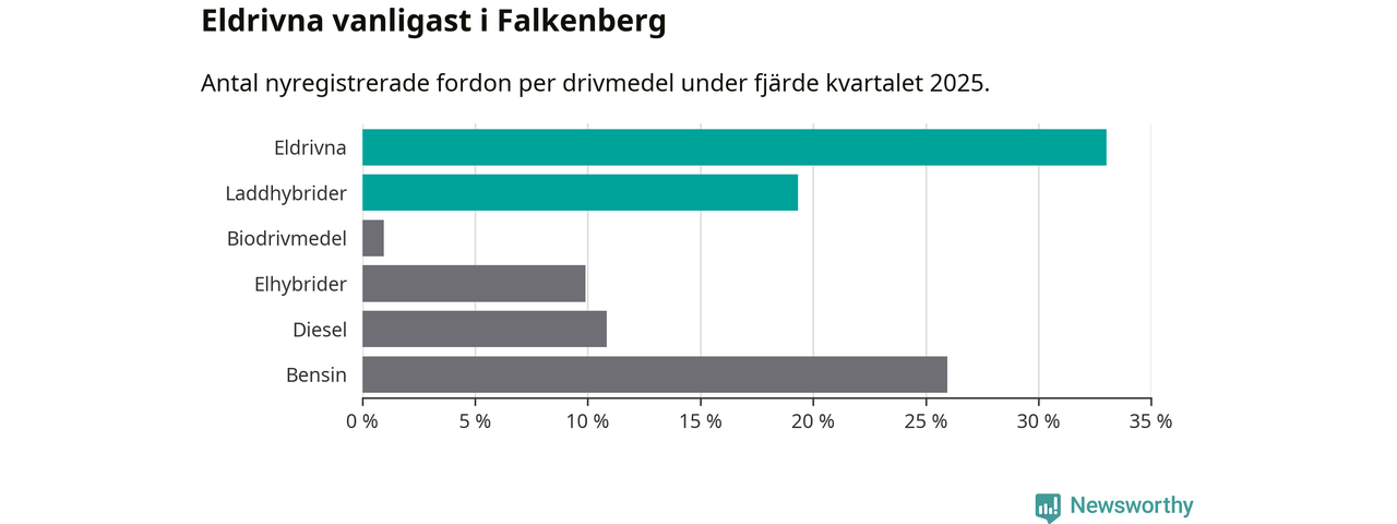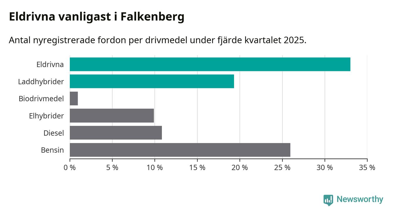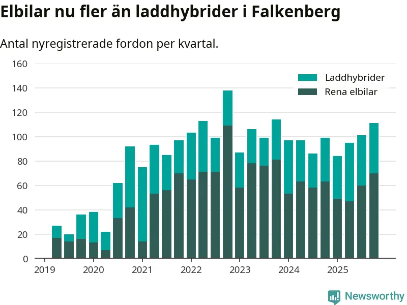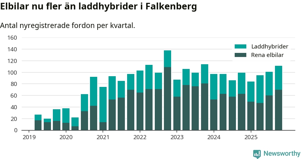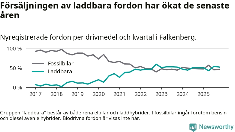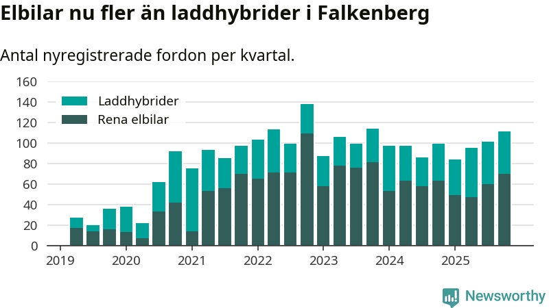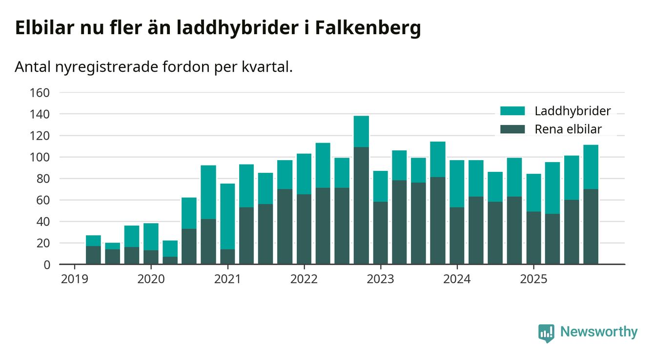 Under fjärde kvartalet 2025 var 52 procent av alla nyregistrerade personbilar i Falkenberg laddbara (sammanlagt registrerades 212 nya bilar). Merparten av de laddbara bilarna var rena elbilar (33 procent av alla).
