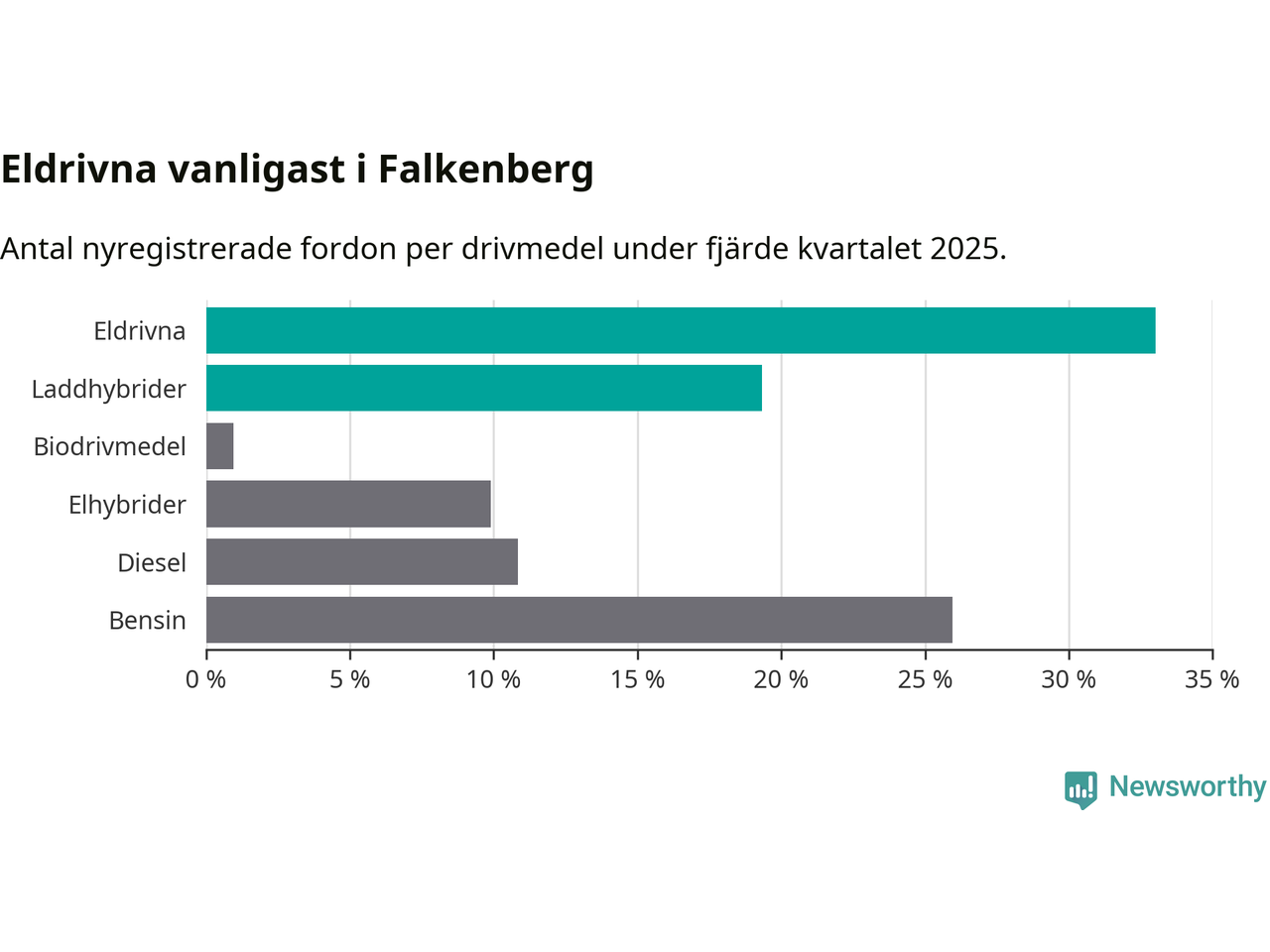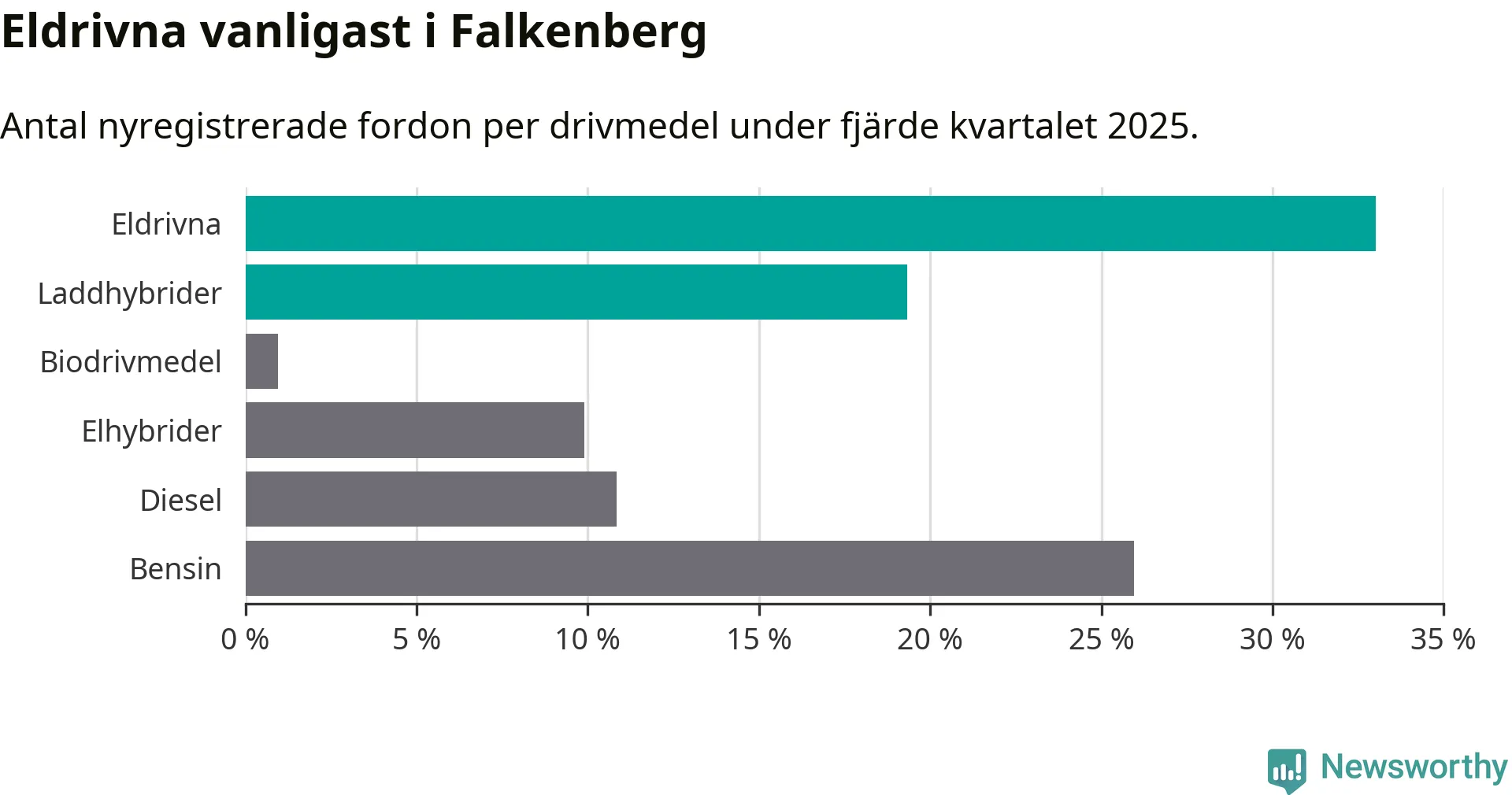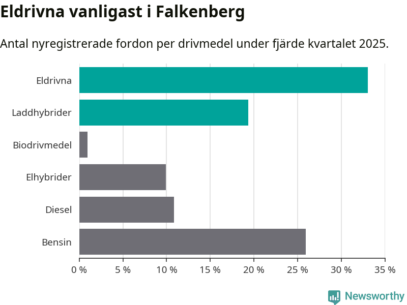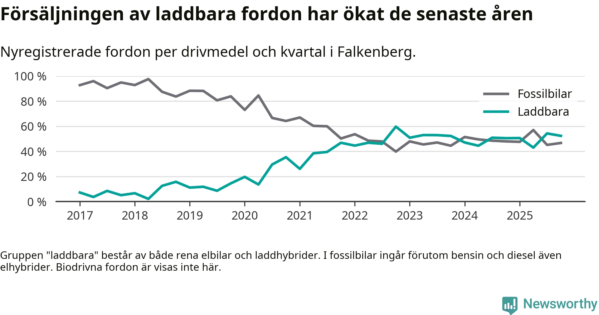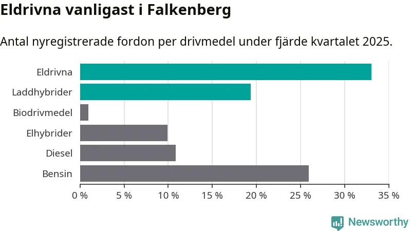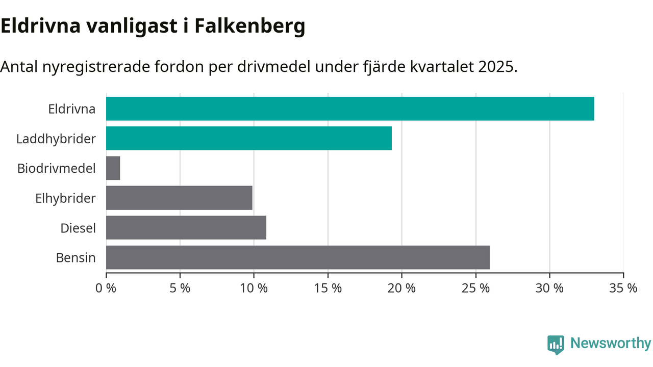 Under fjärde kvartalet 2025 var 52 procent av alla nyregistrerade personbilar i Falkenberg laddbara (sammanlagt registrerades 212 nya bilar). Merparten av de laddbara bilarna var rena elbilar (33 procent av alla).