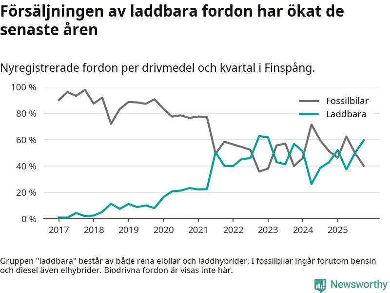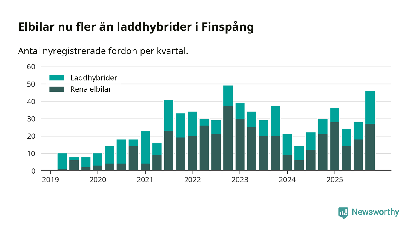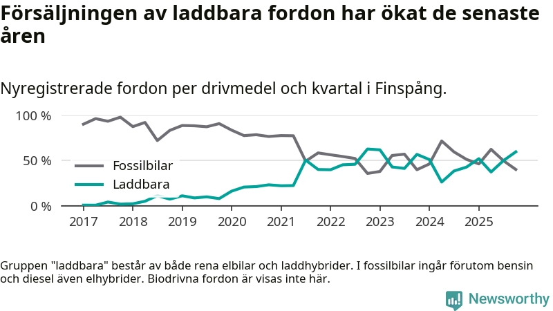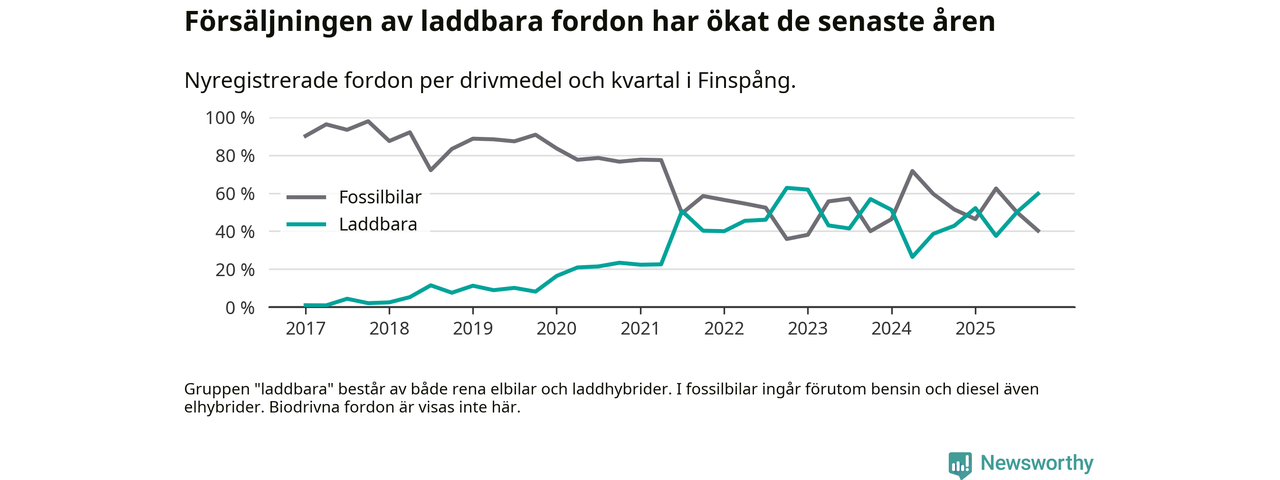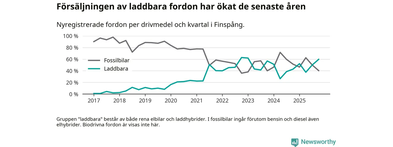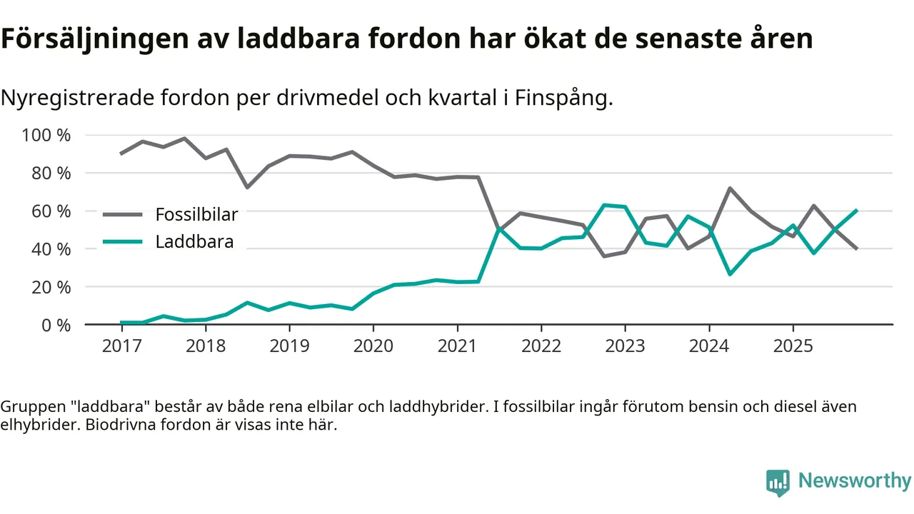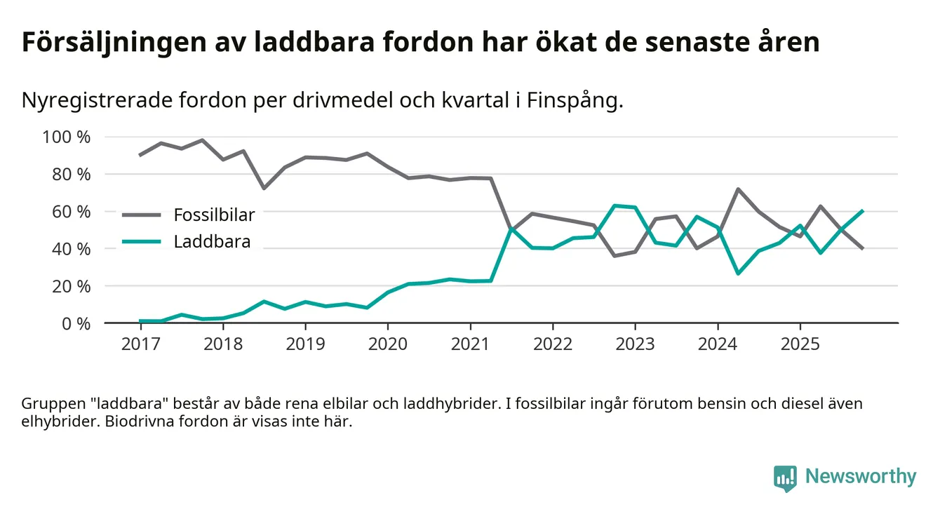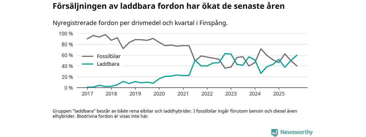 Under fjärde kvartalet 2025 var 60 procent av alla nyregistrerade personbilar i Finspång laddbara (sammanlagt registrerades 77 nya bilar). Merparten av de laddbara bilarna var rena elbilar (35 procent av alla).