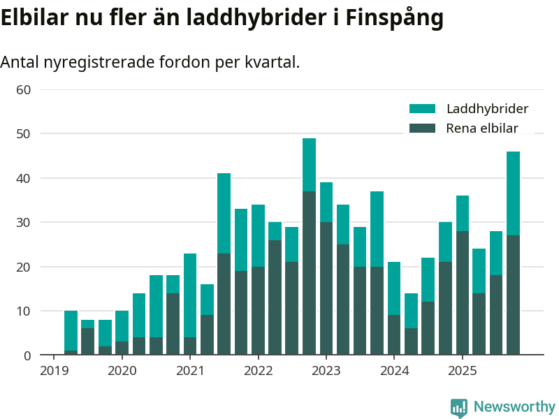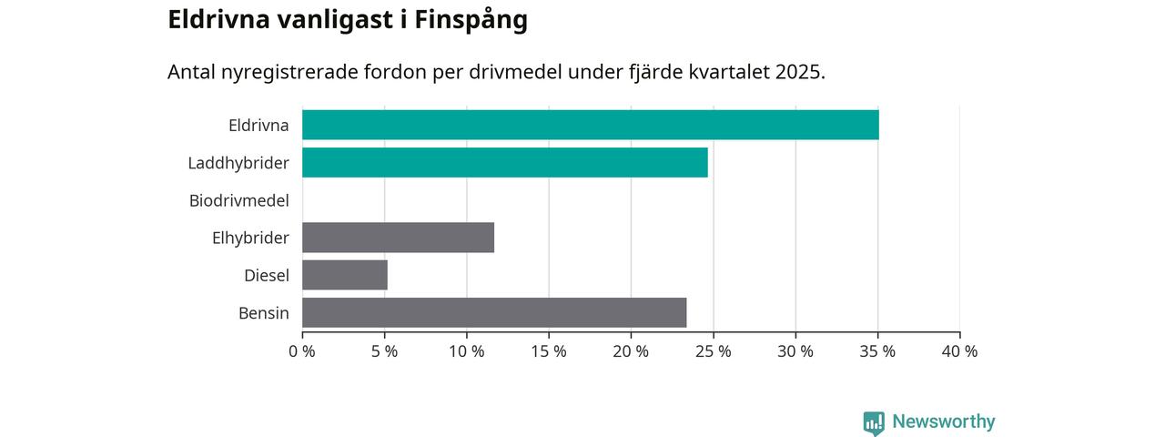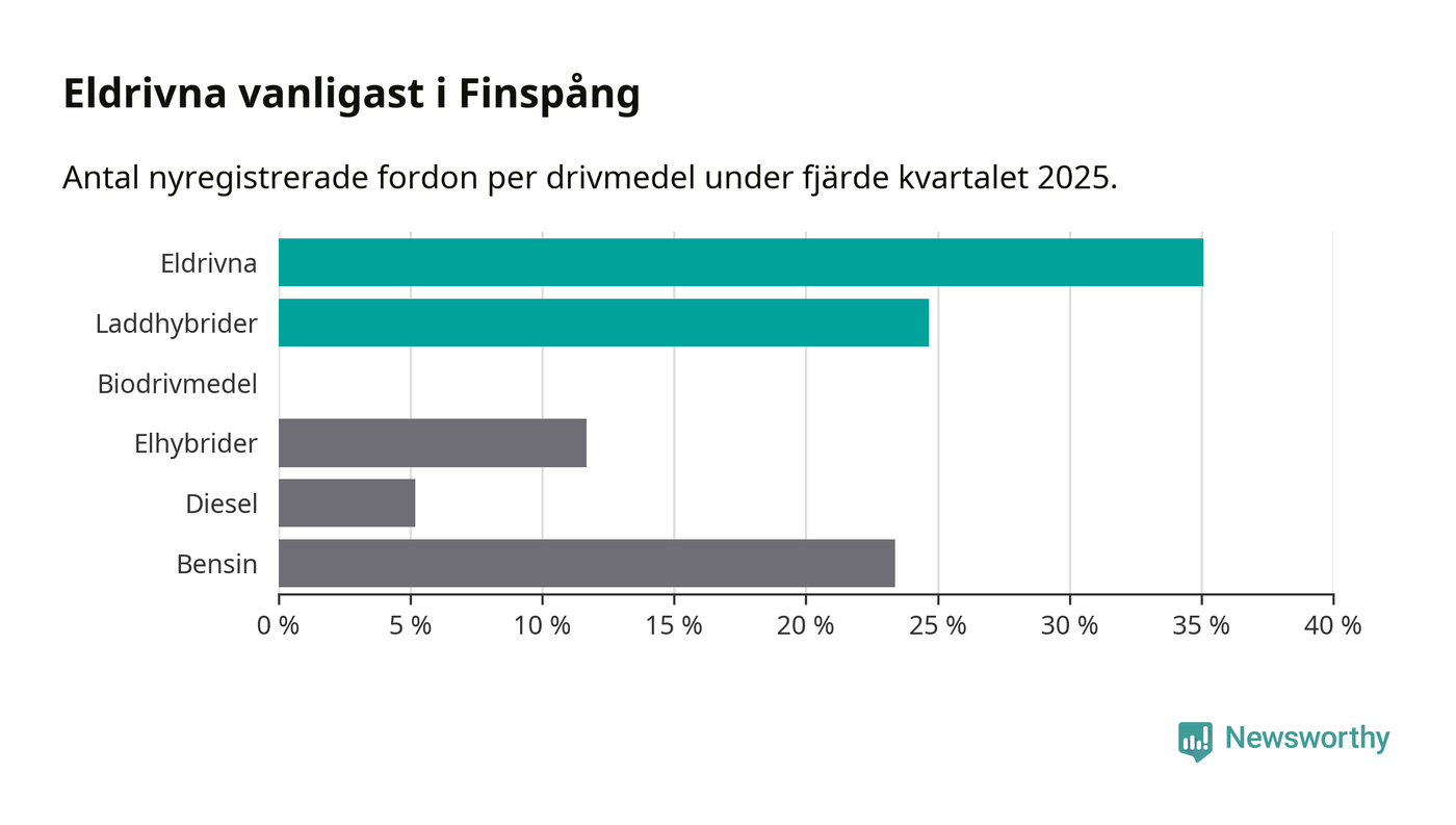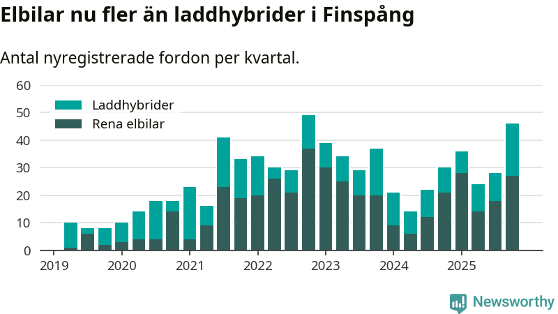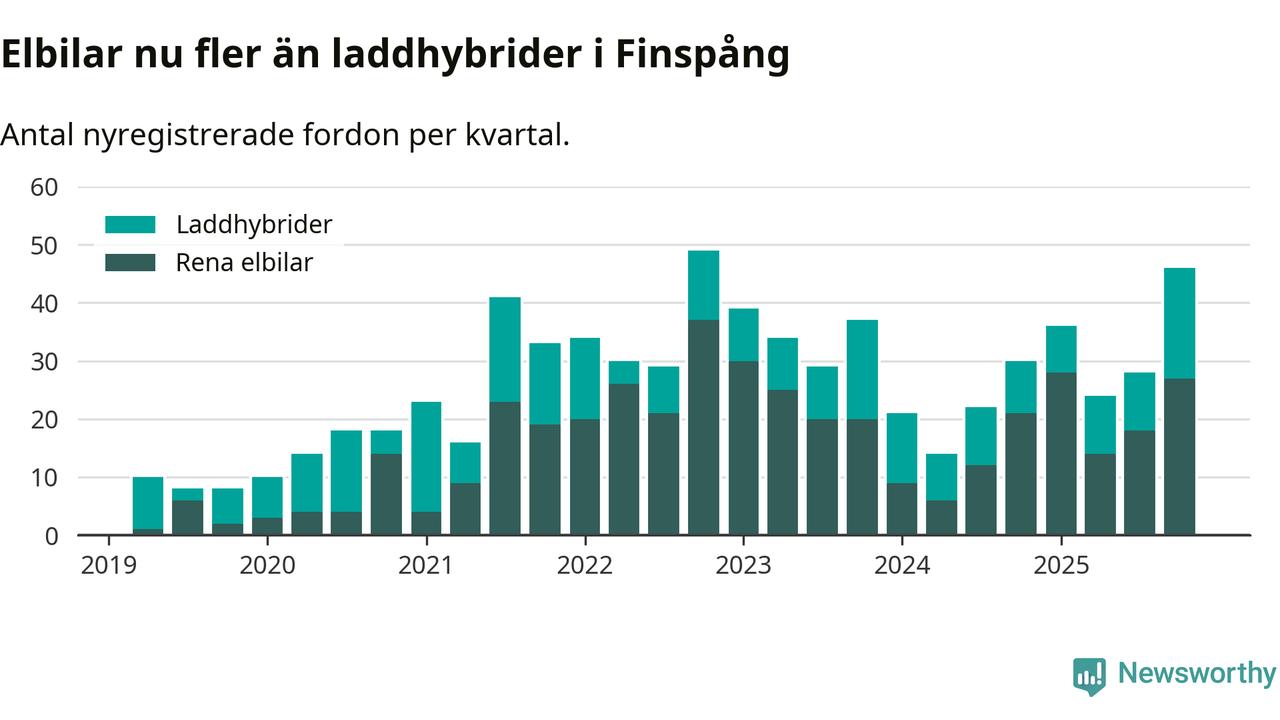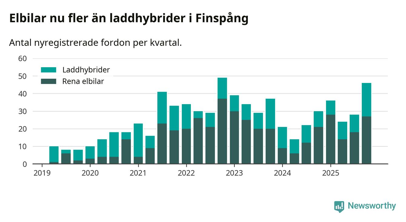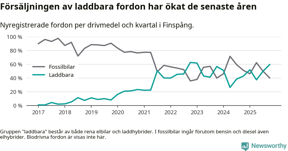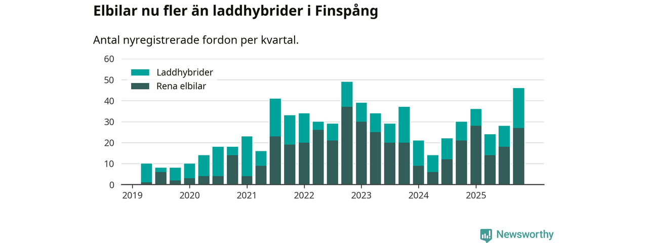 Under fjärde kvartalet 2025 var 60 procent av alla nyregistrerade personbilar i Finspång laddbara (sammanlagt registrerades 77 nya bilar). Merparten av de laddbara bilarna var rena elbilar (35 procent av alla).