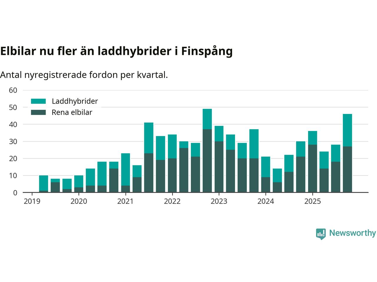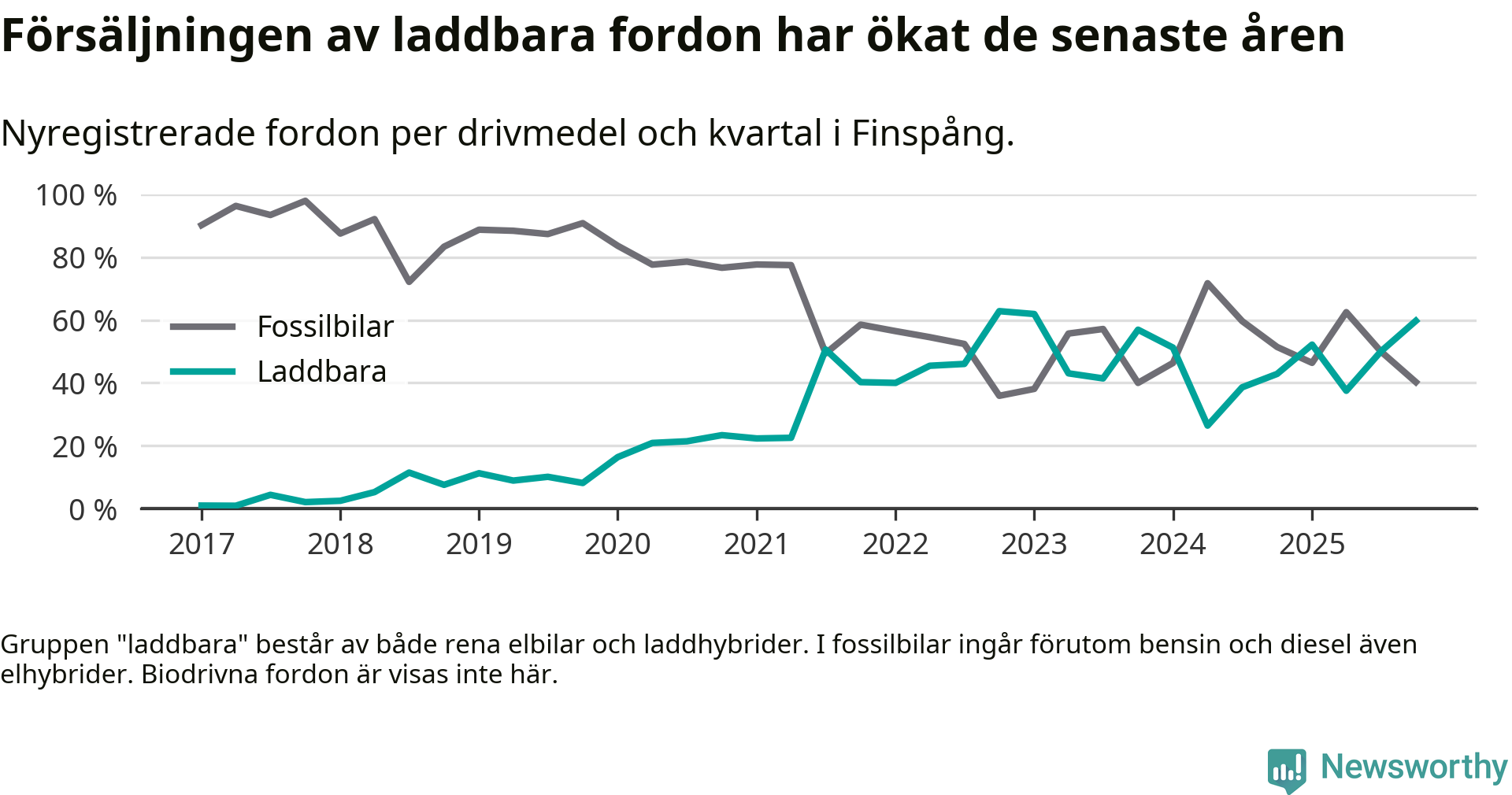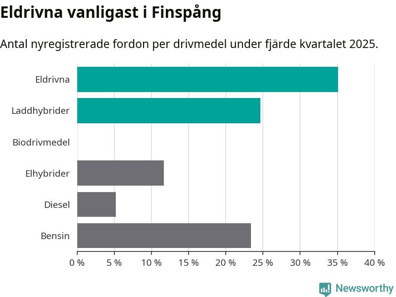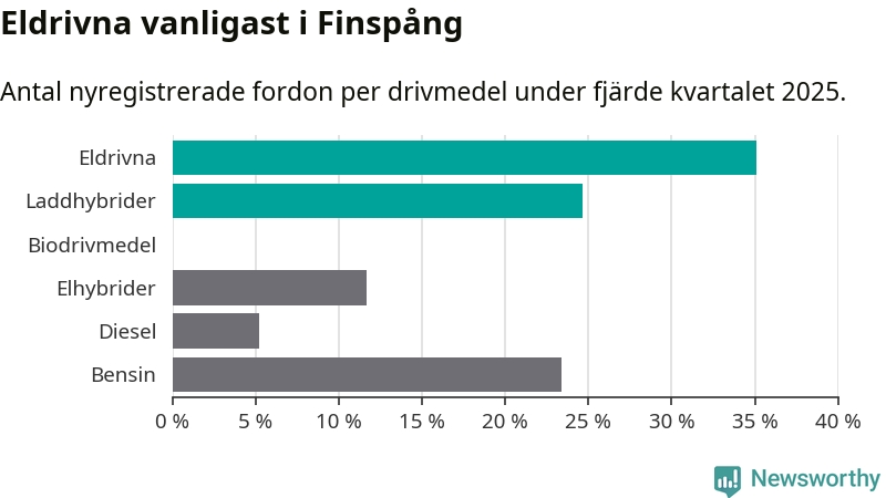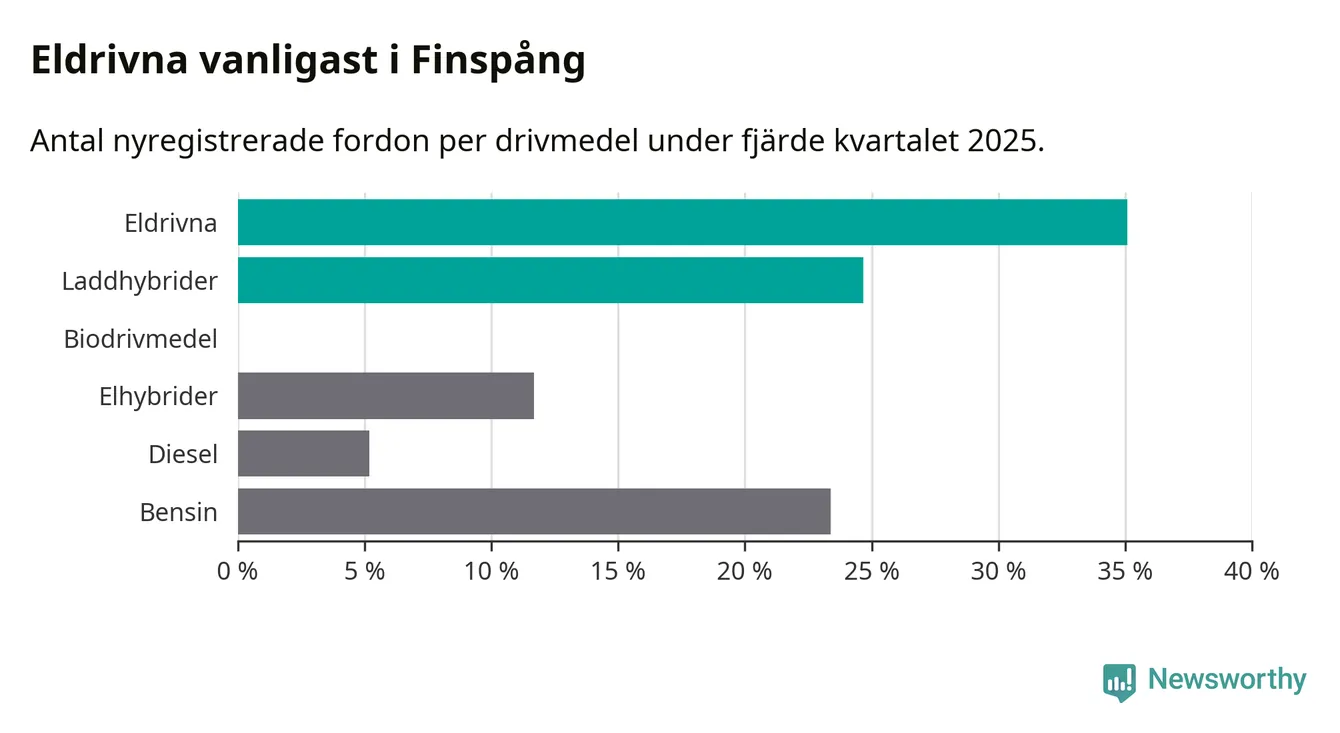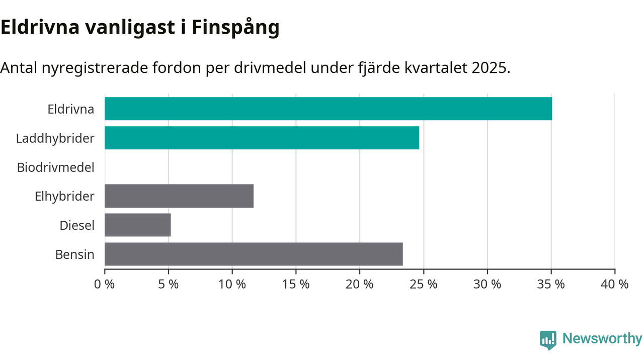Under fjärde kvartalet 2025 var 60 procent av alla nyregistrerade personbilar i Finspång laddbara (sammanlagt registrerades 77 nya bilar). Merparten av de laddbara bilarna var rena elbilar (35 procent av alla).