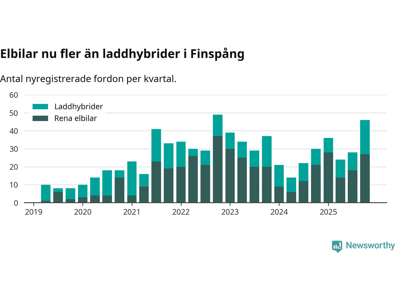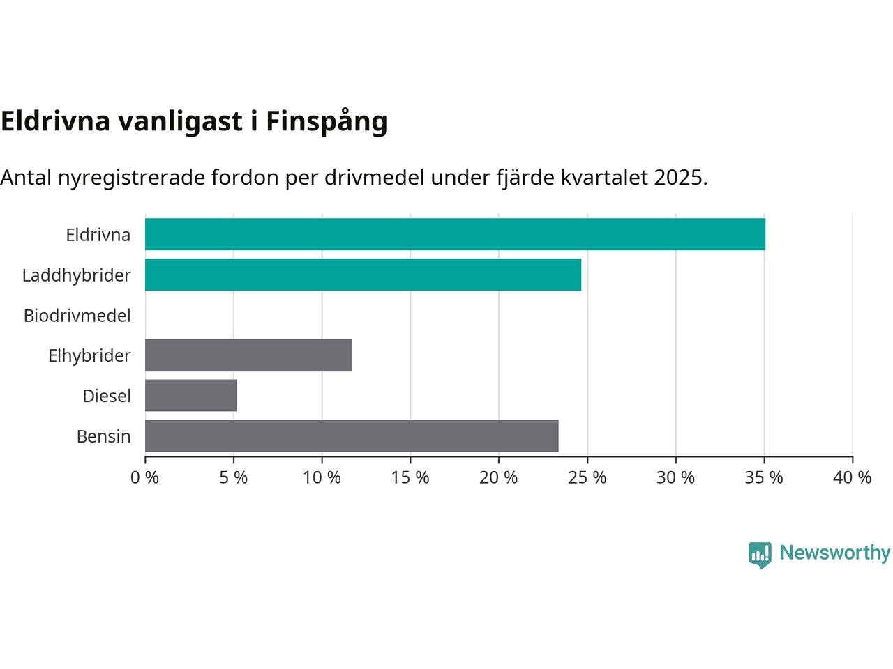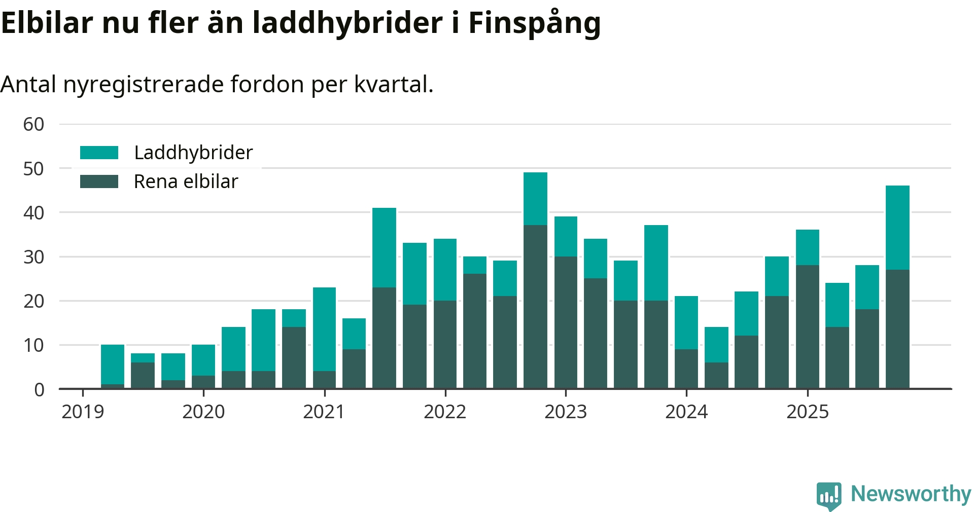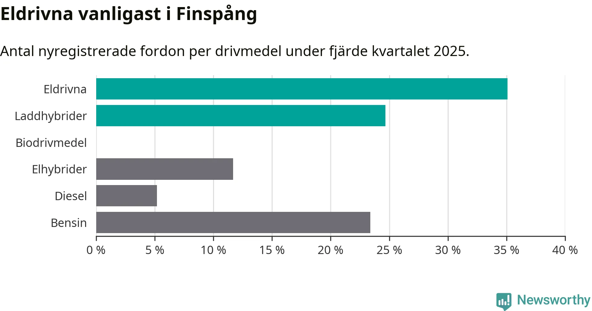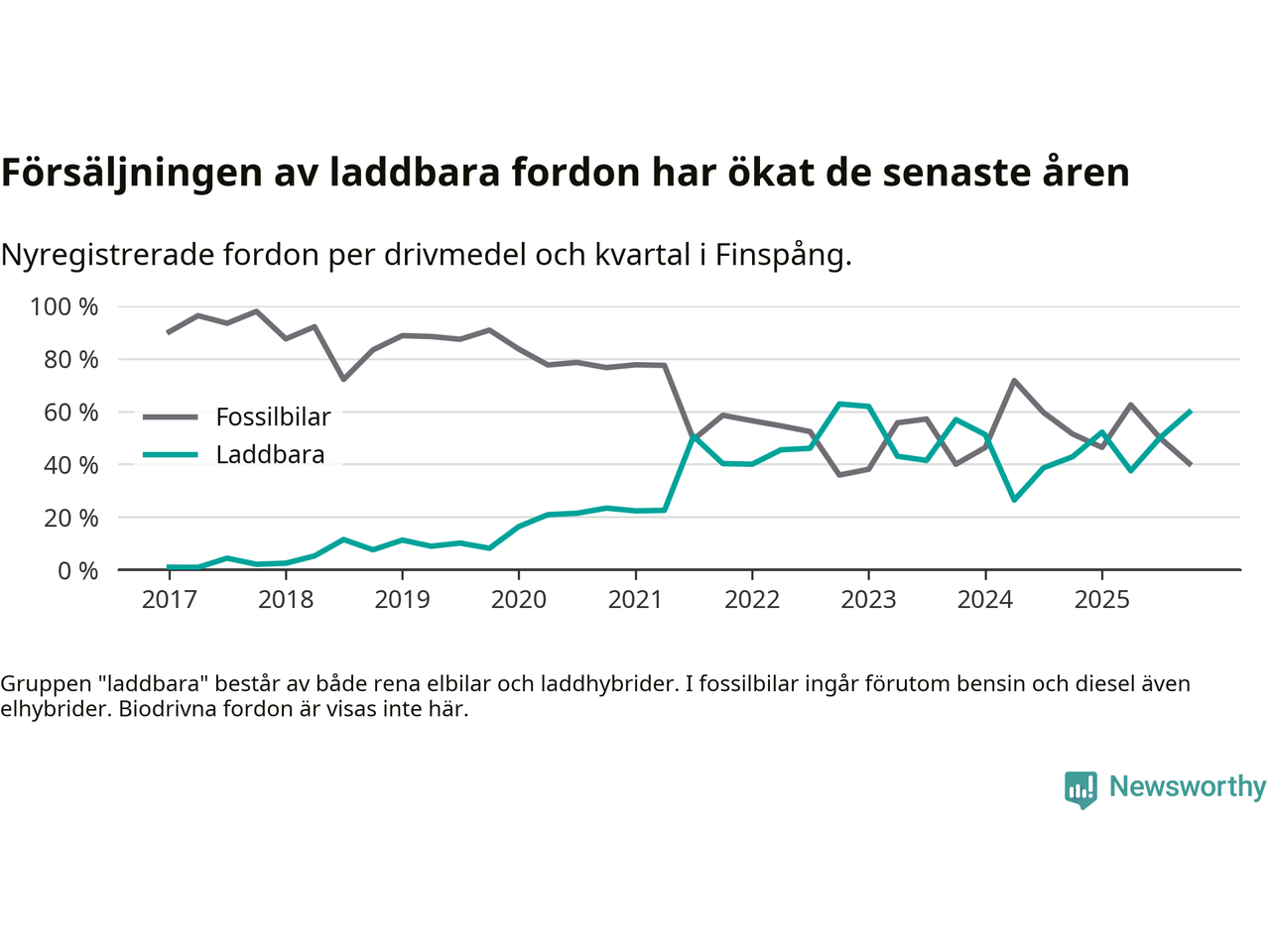 Under fjärde kvartalet 2025 var 60 procent av alla nyregistrerade personbilar i Finspång laddbara (sammanlagt registrerades 77 nya bilar). Merparten av de laddbara bilarna var rena elbilar (35 procent av alla).