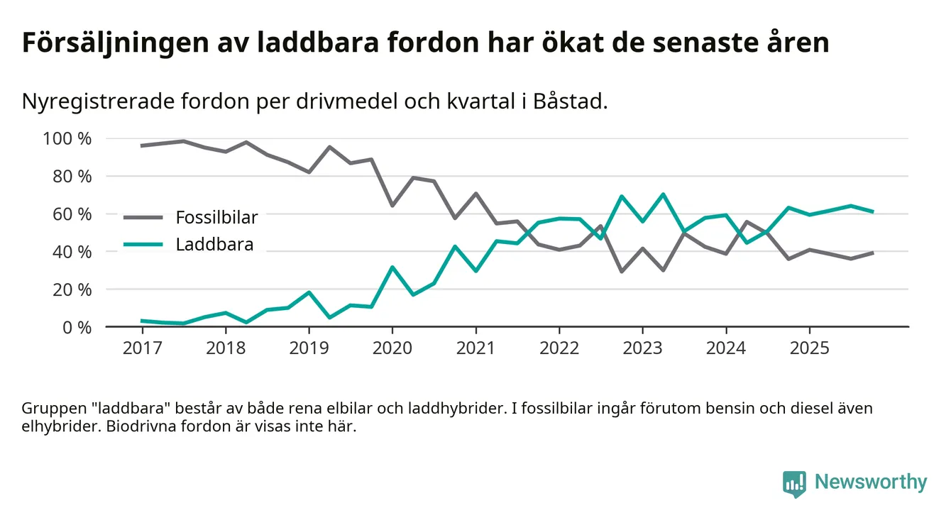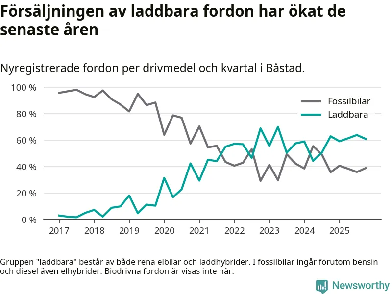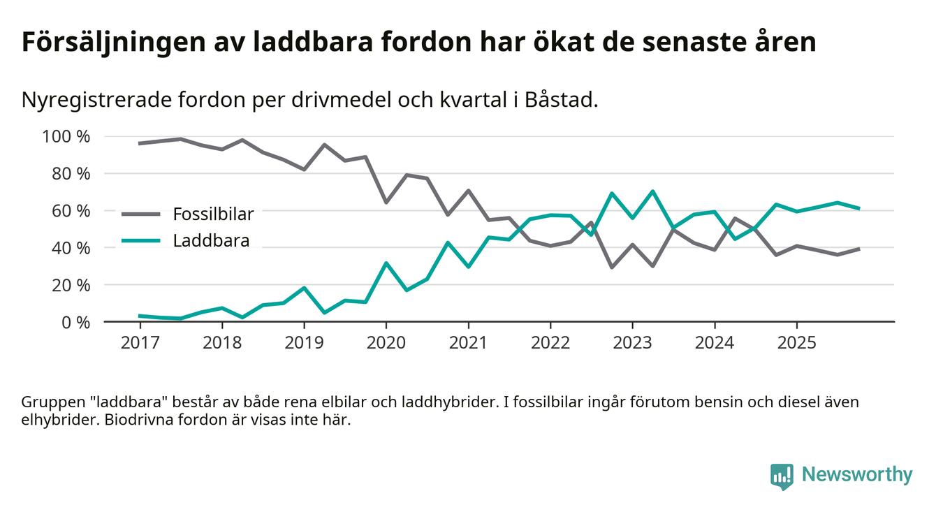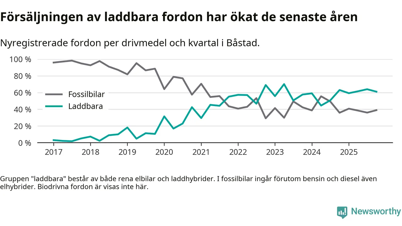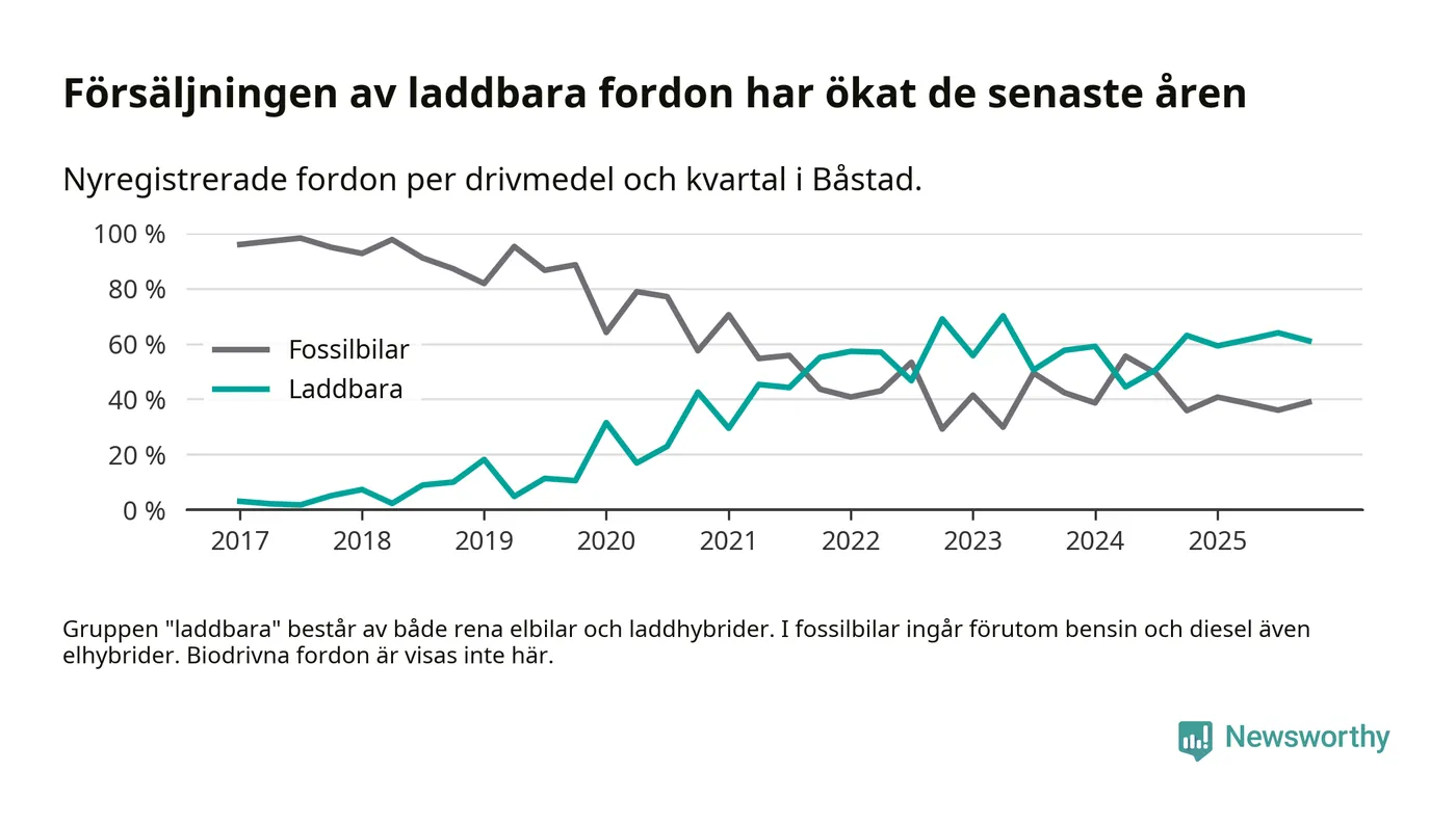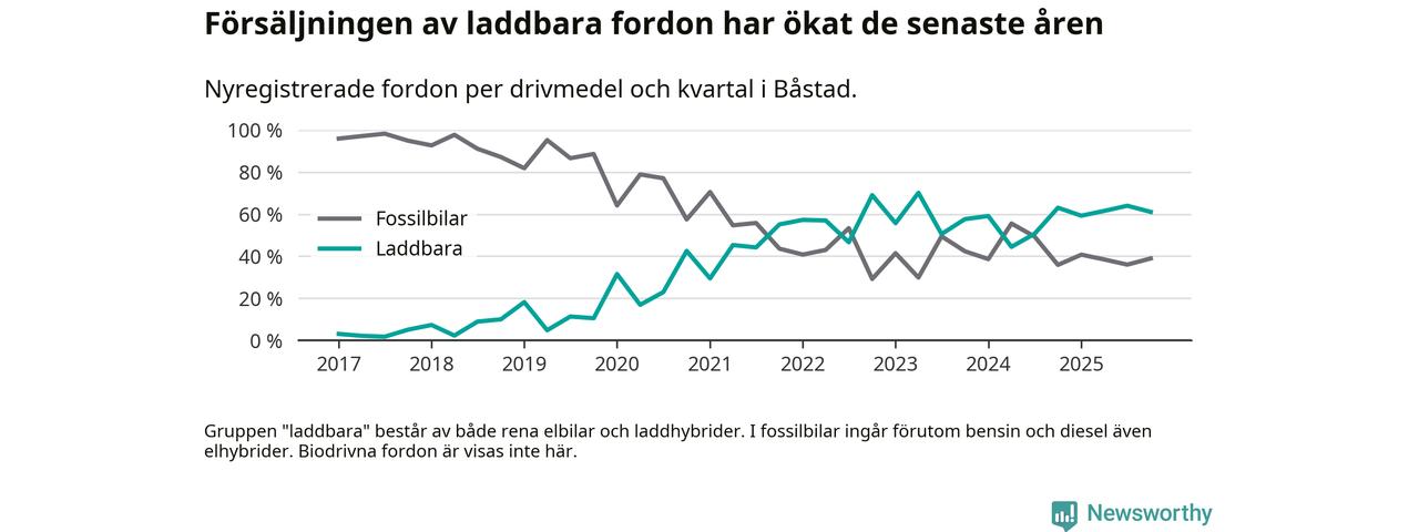Under fjärde kvartalet 2025 var 61 procent av alla nyregistrerade personbilar i Båstad laddbara (sammanlagt registrerades 95 nya bilar). Merparten av de laddbara bilarna var rena elbilar (38 procent av alla).