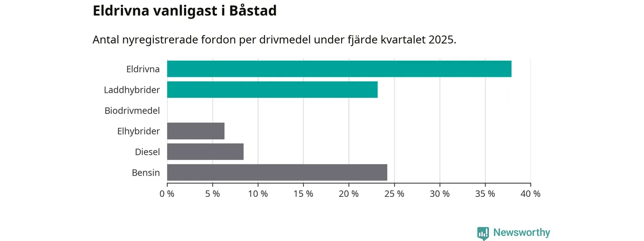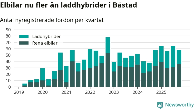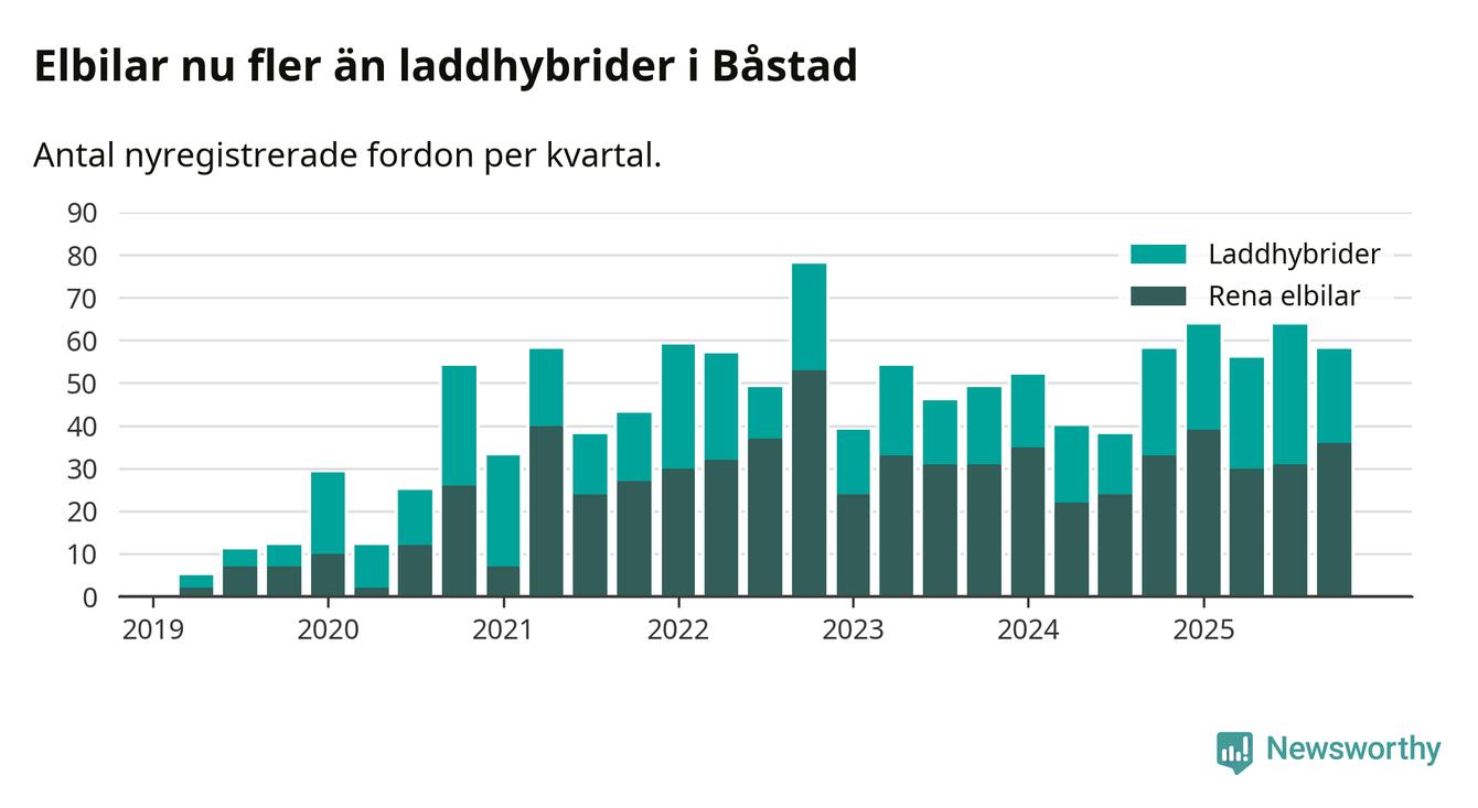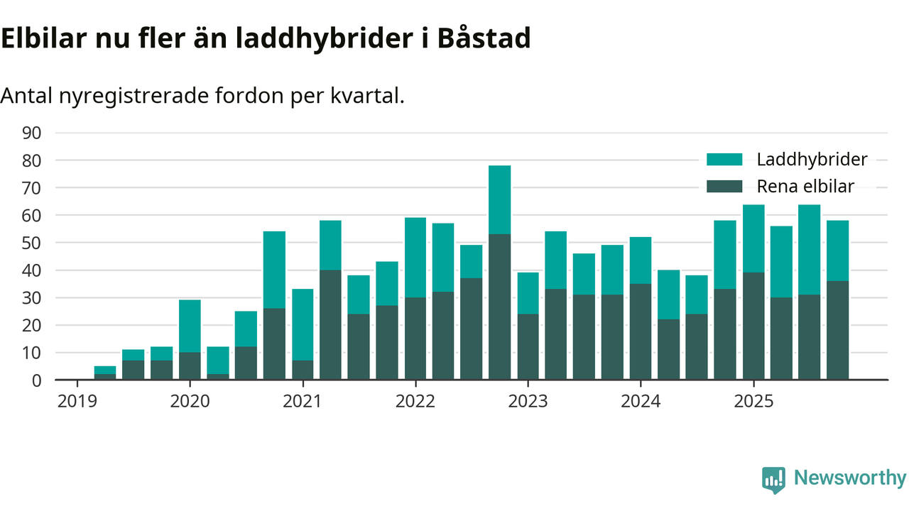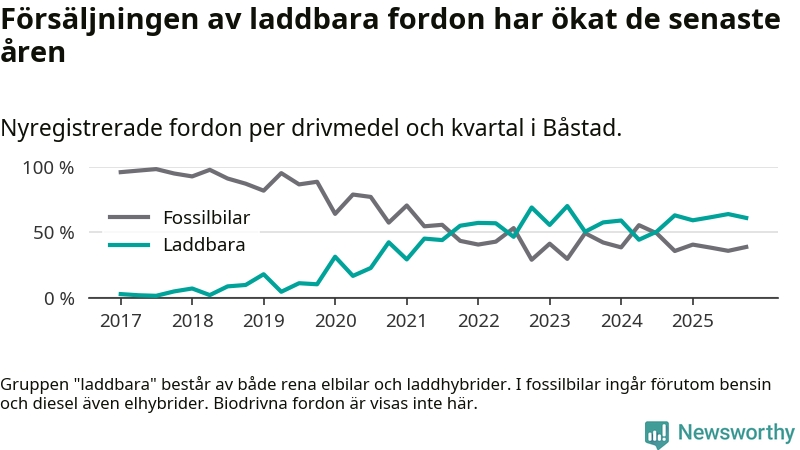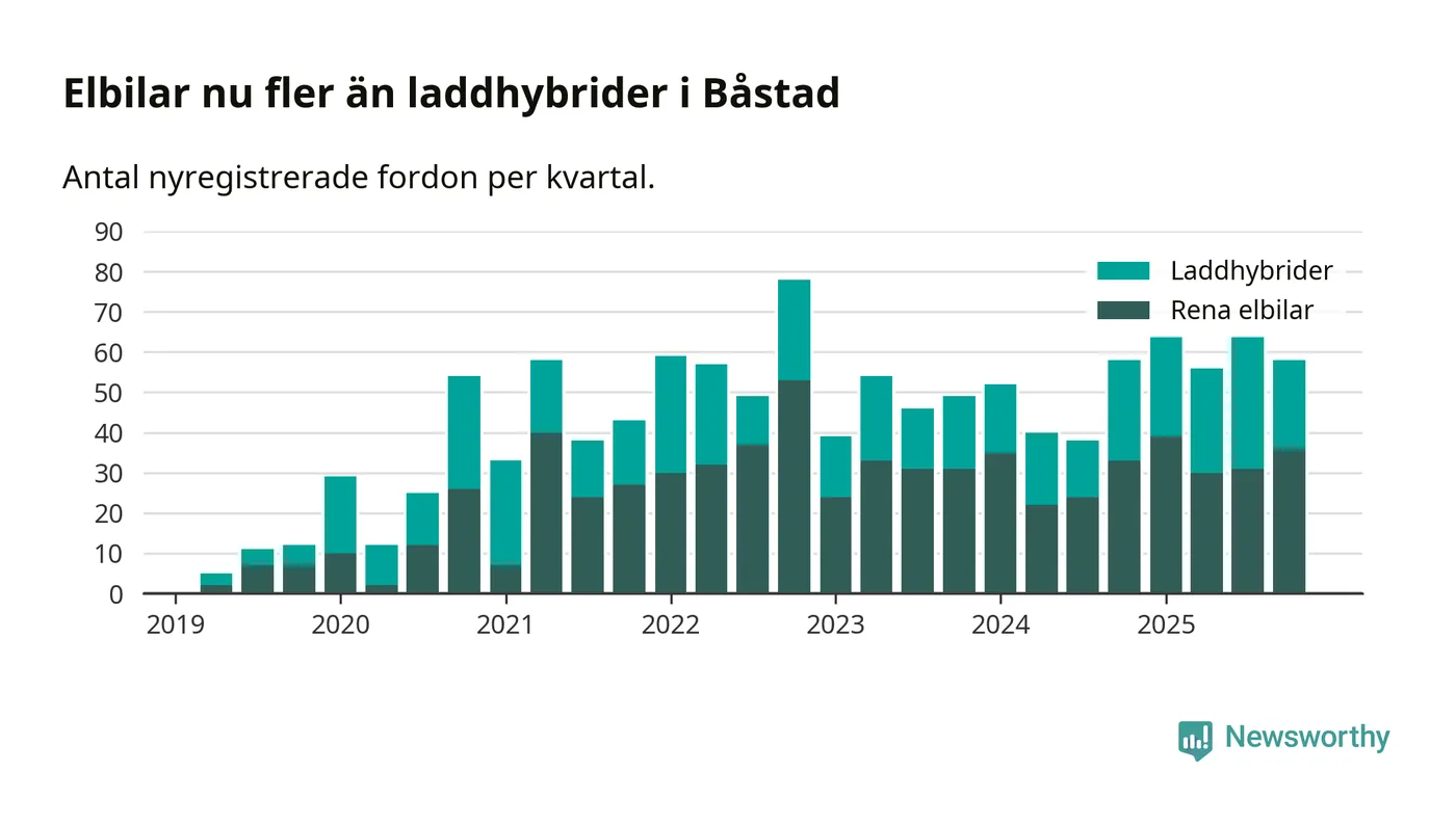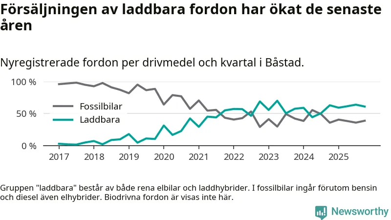 Under fjärde kvartalet 2025 var 61 procent av alla nyregistrerade personbilar i Båstad laddbara (sammanlagt registrerades 95 nya bilar). Merparten av de laddbara bilarna var rena elbilar (38 procent av alla).