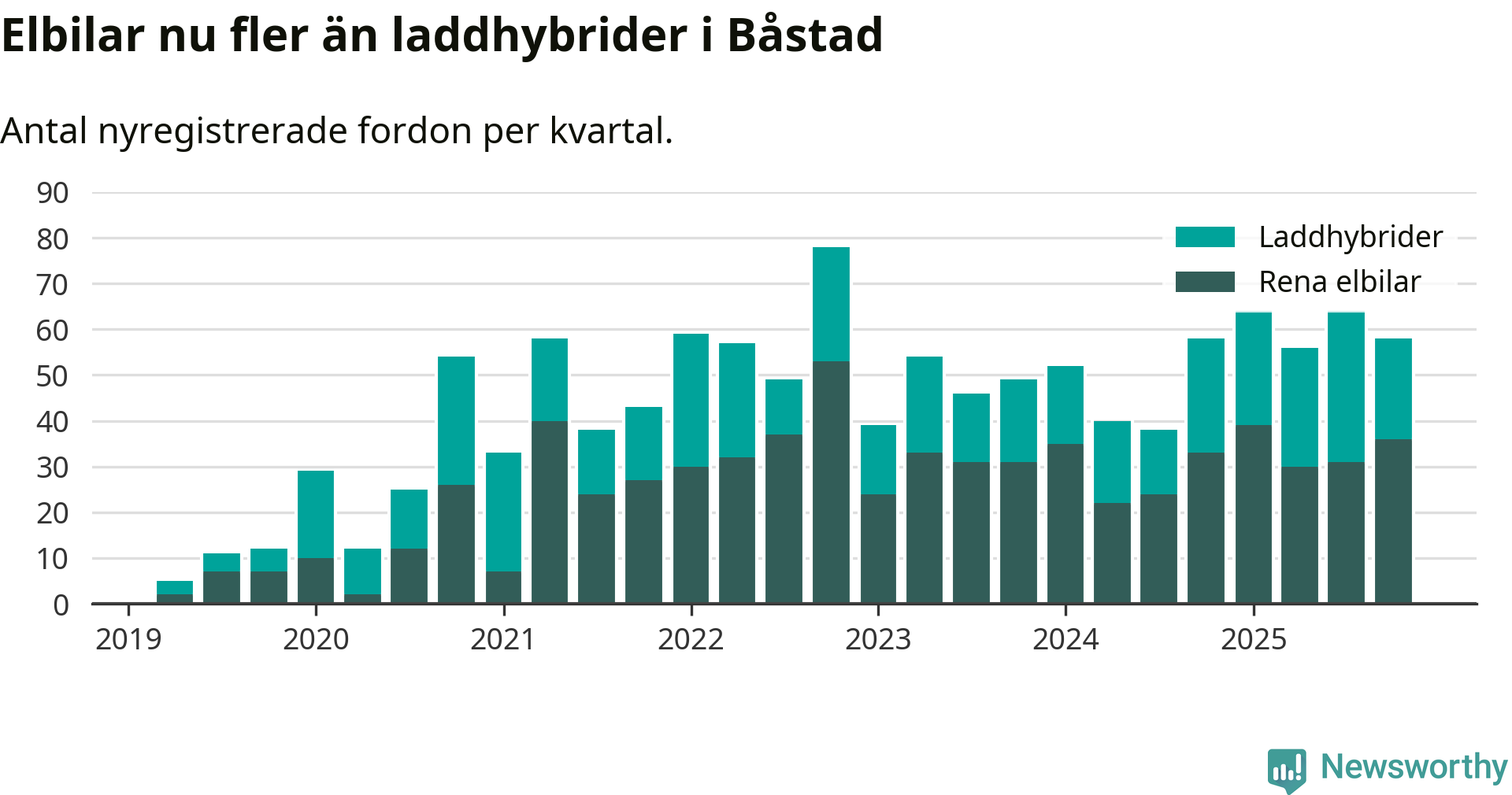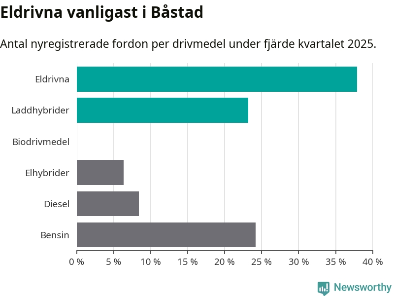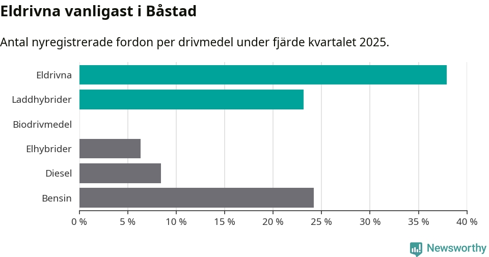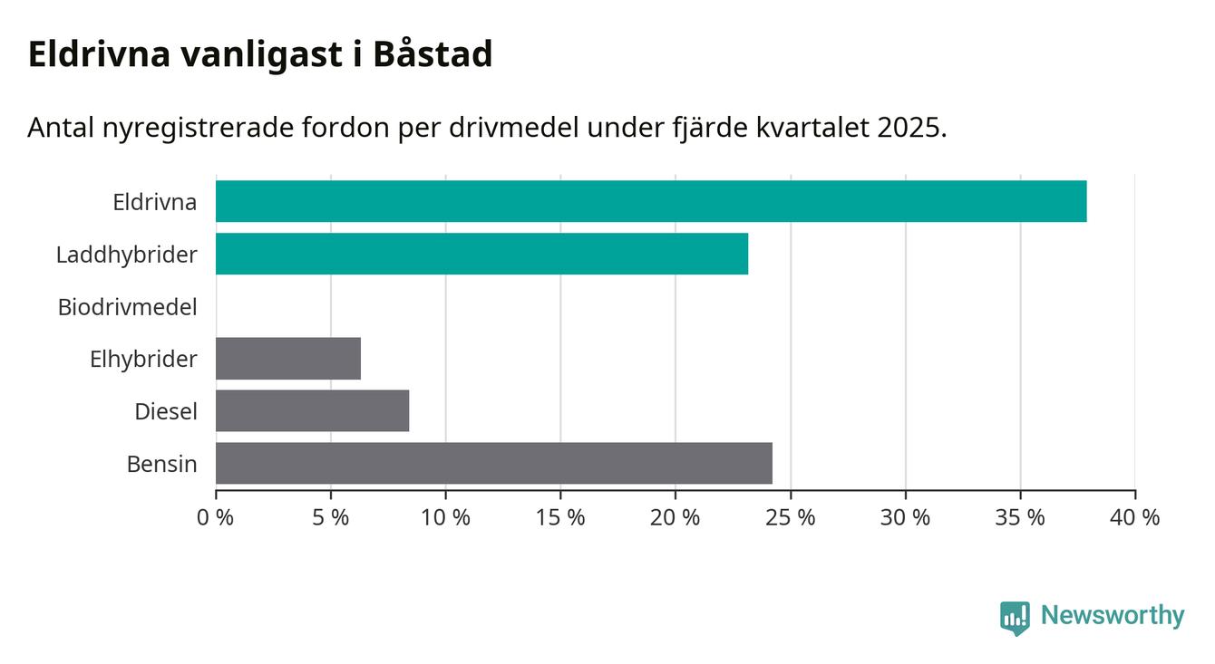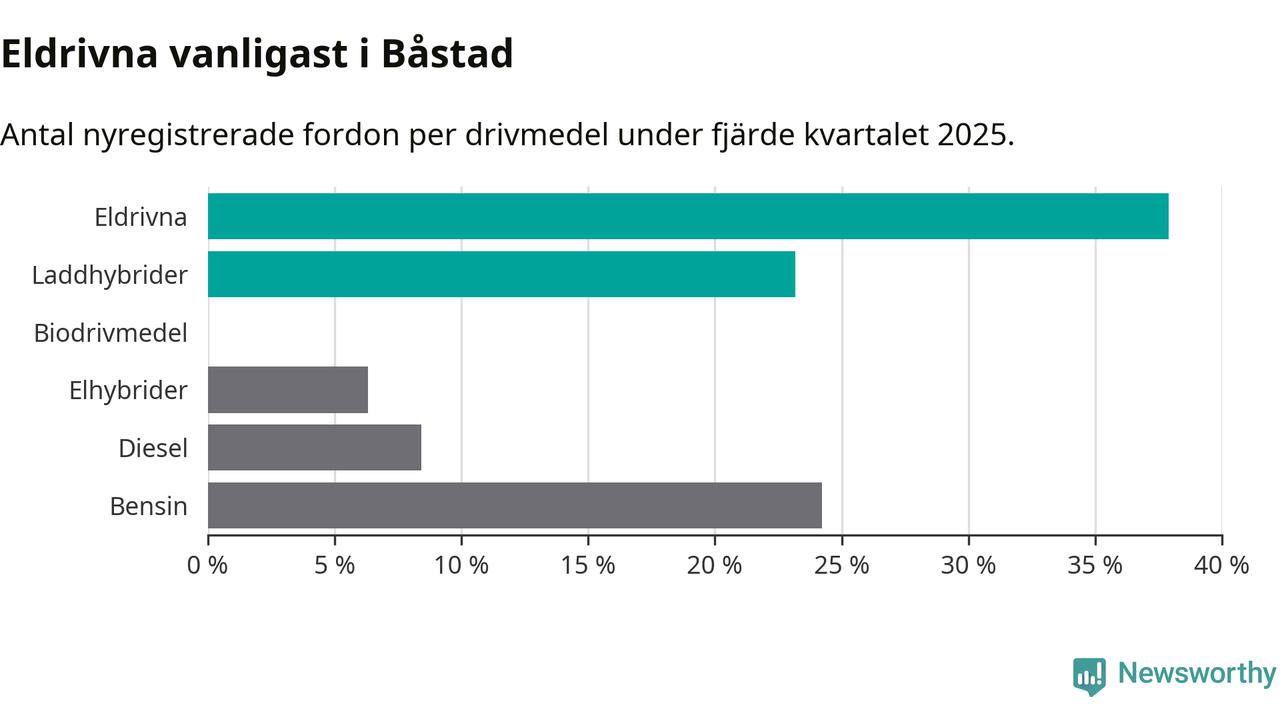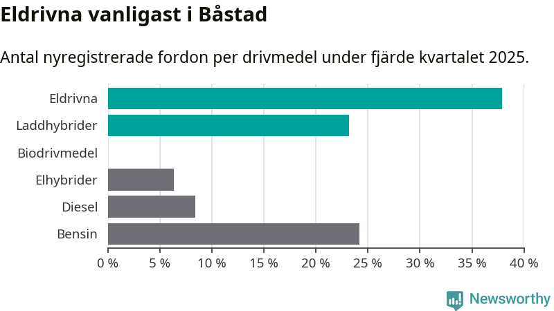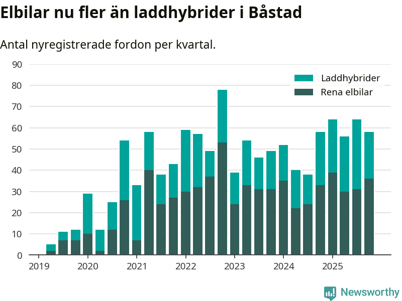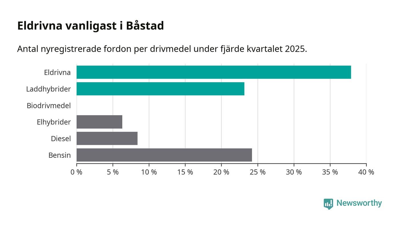 Under fjärde kvartalet 2025 var 61 procent av alla nyregistrerade personbilar i Båstad laddbara (sammanlagt registrerades 95 nya bilar). Merparten av de laddbara bilarna var rena elbilar (38 procent av alla).