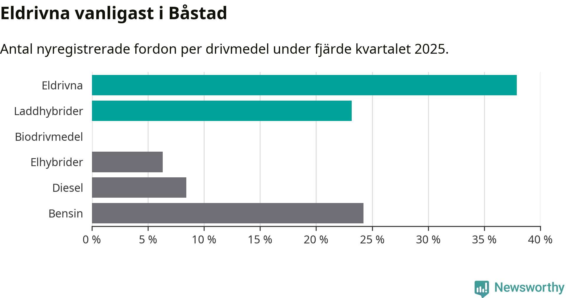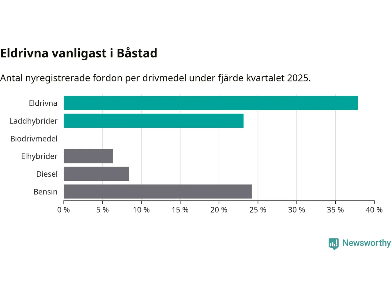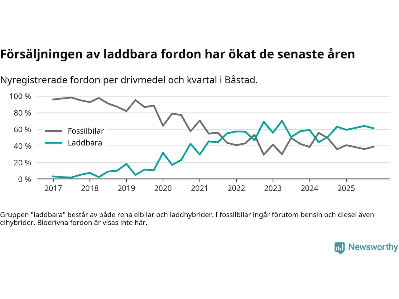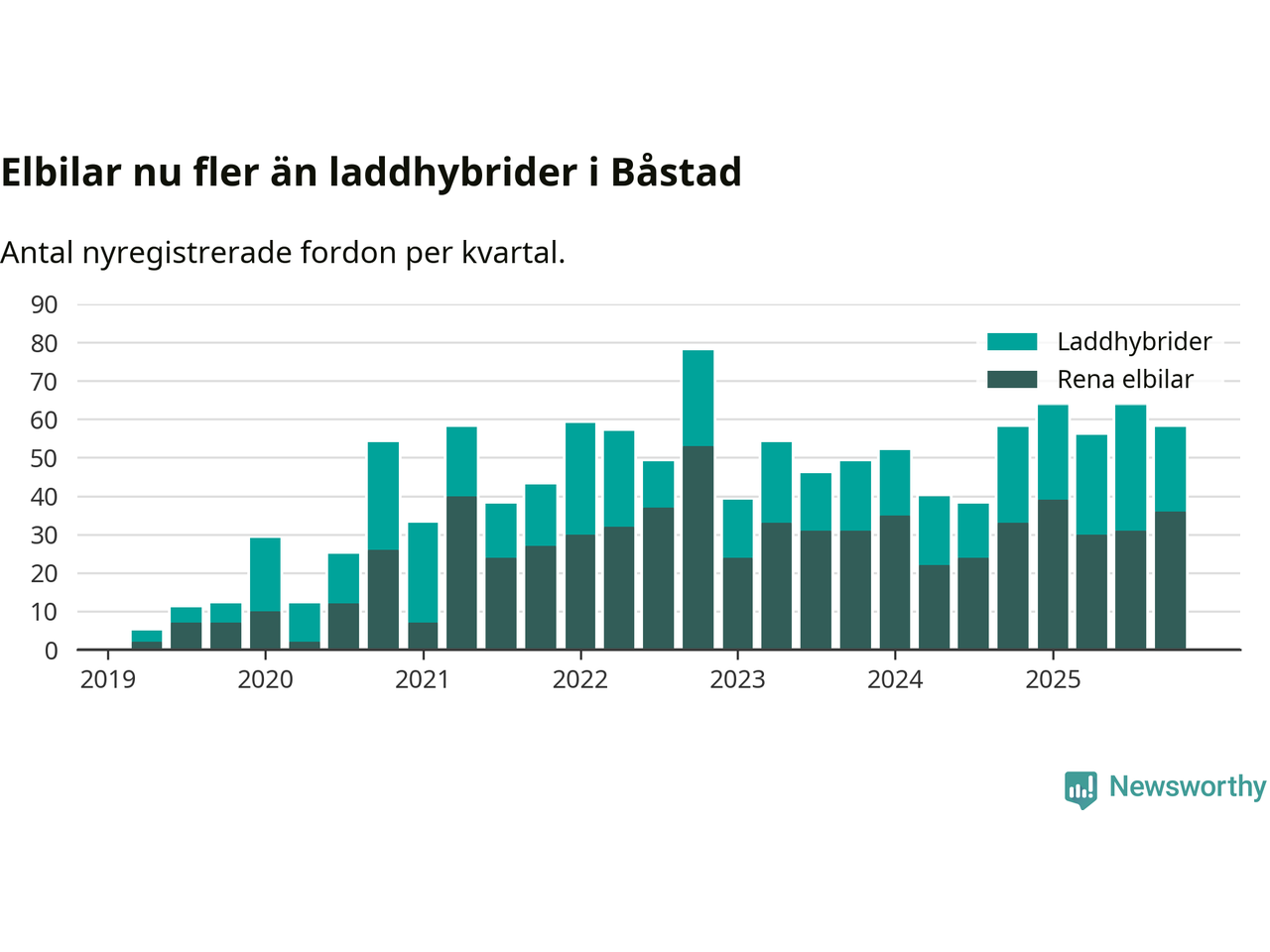 Under fjärde kvartalet 2025 var 61 procent av alla nyregistrerade personbilar i Båstad laddbara (sammanlagt registrerades 95 nya bilar). Merparten av de laddbara bilarna var rena elbilar (38 procent av alla).