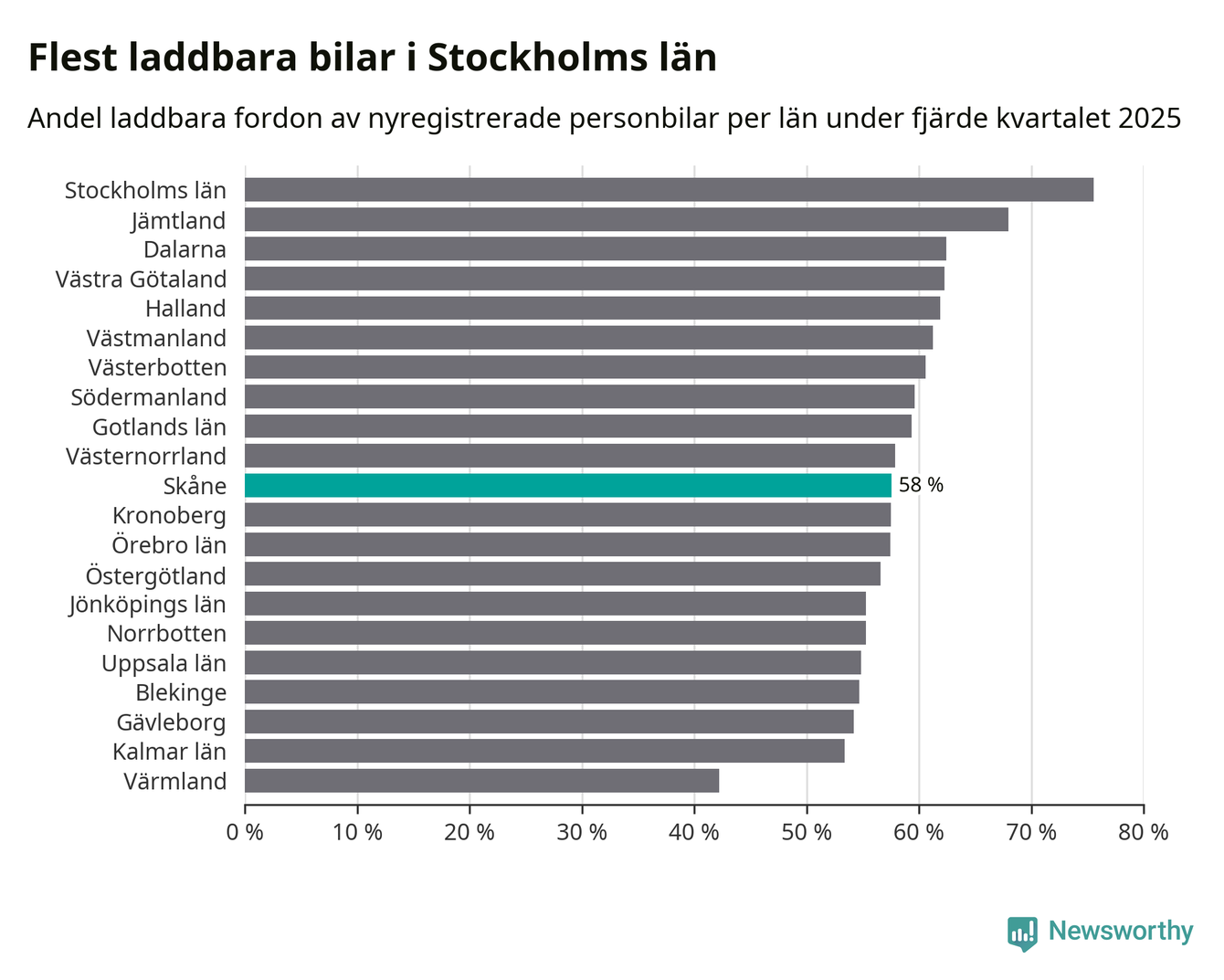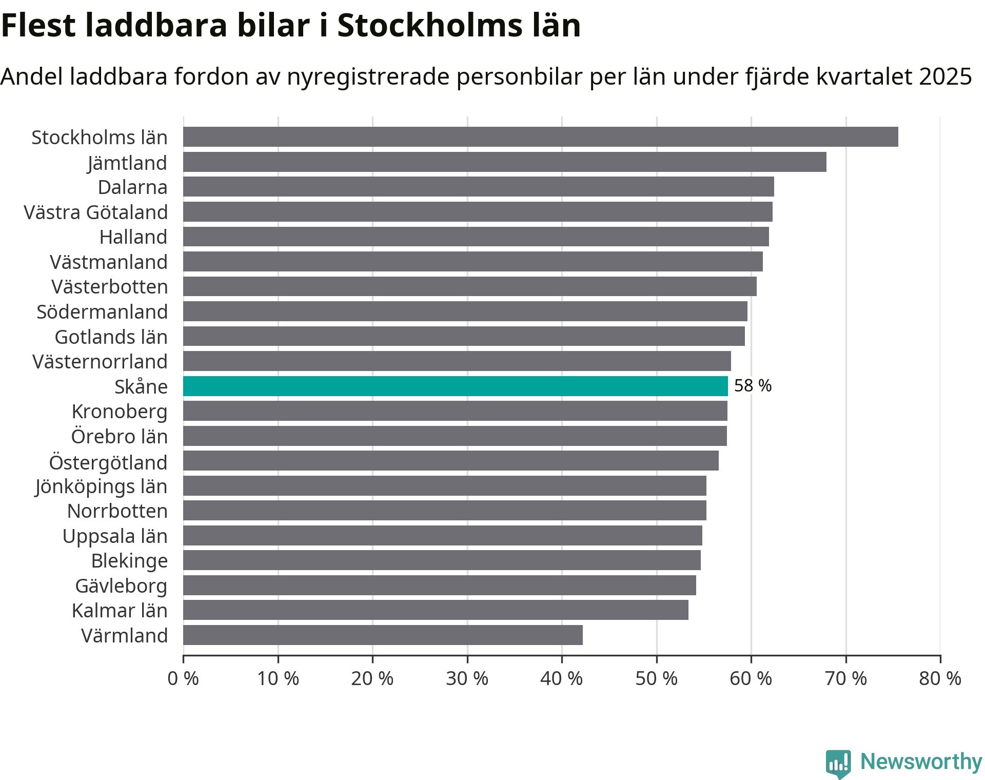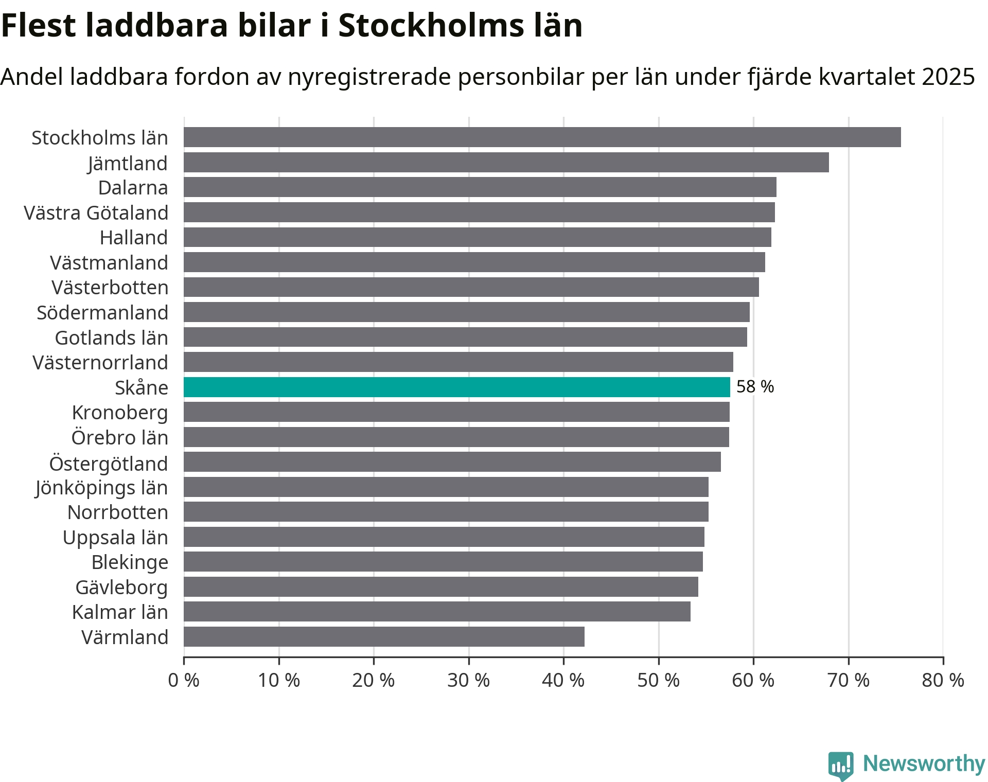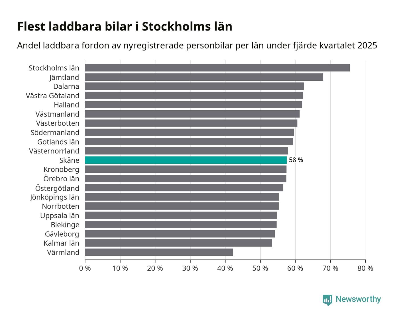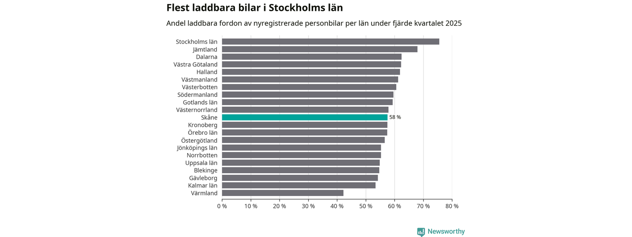 I hela landet var 64 procent av alla nya bilar laddbara under fjärde kvartalet. Det är något fler än föregående kvartal (+2,9 procentenheter). I Skåne län var 58 procent av de nya bilarna laddbara, vilket är fler än föregående kvartal (+4,4 procentenheter).