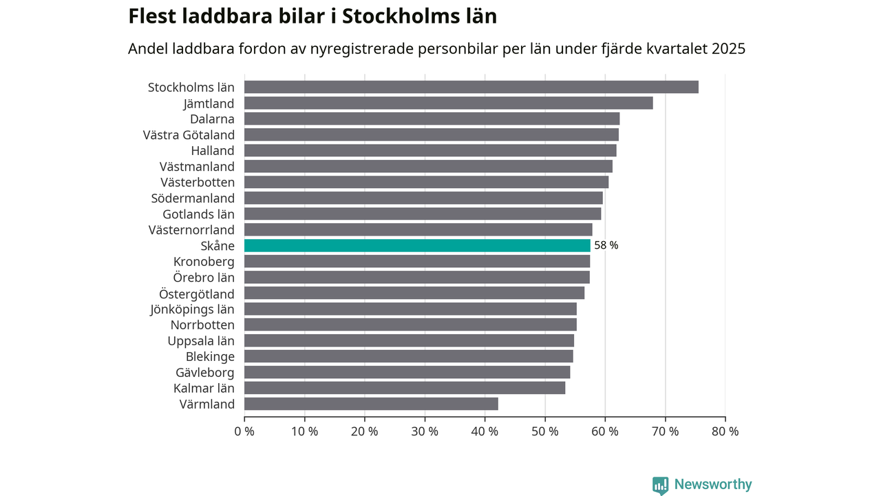 I landet som helhet var 63 procent av alla nyregistrerade personbilar laddbara år 2025. Det är en ökning jämfört med året innan, men samtidigt betydligt färre än de prognoser som gjordes för några år sedan.