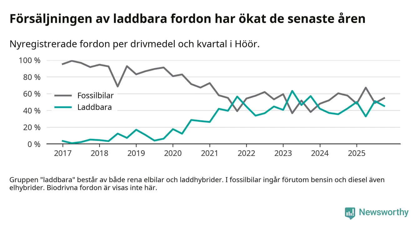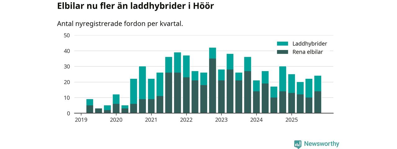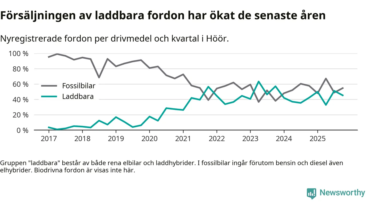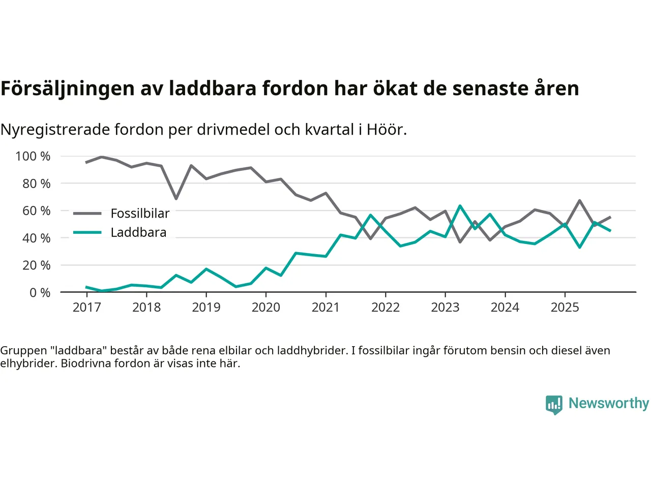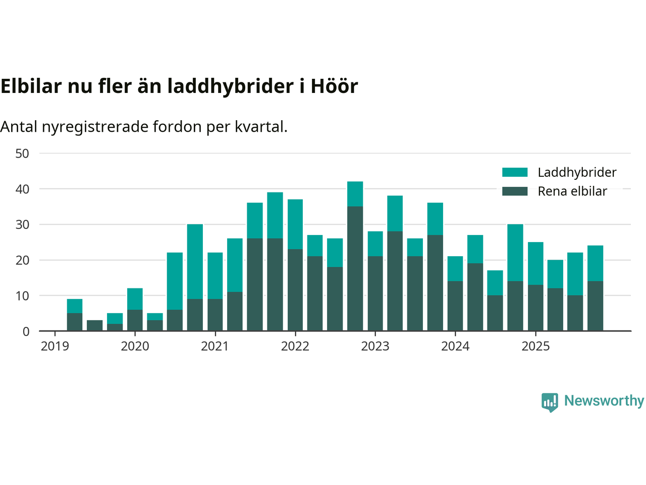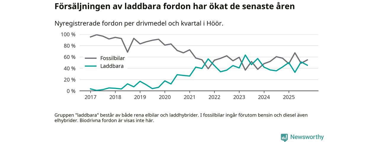 Under fjärde kvartalet 2025 var 45 procent av alla nyregistrerade personbilar i Höör laddbara (sammanlagt registrerades 53 nya bilar). Merparten av de laddbara bilarna var rena elbilar (26 procent av alla).