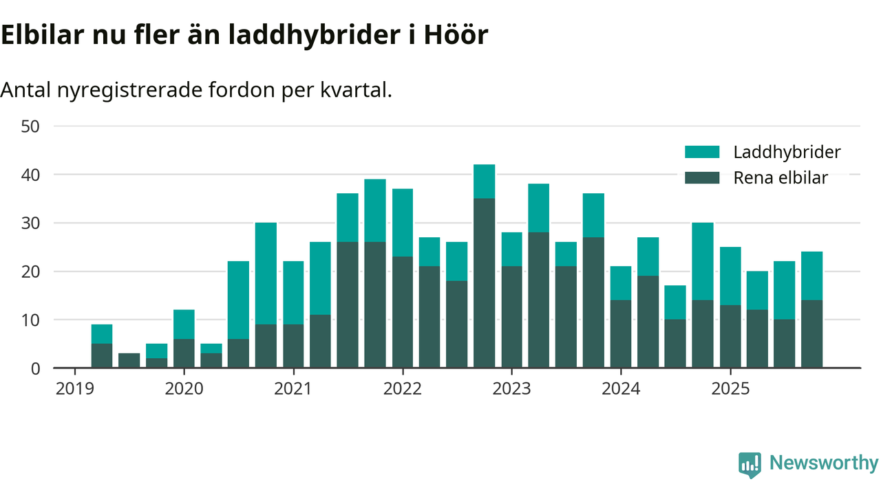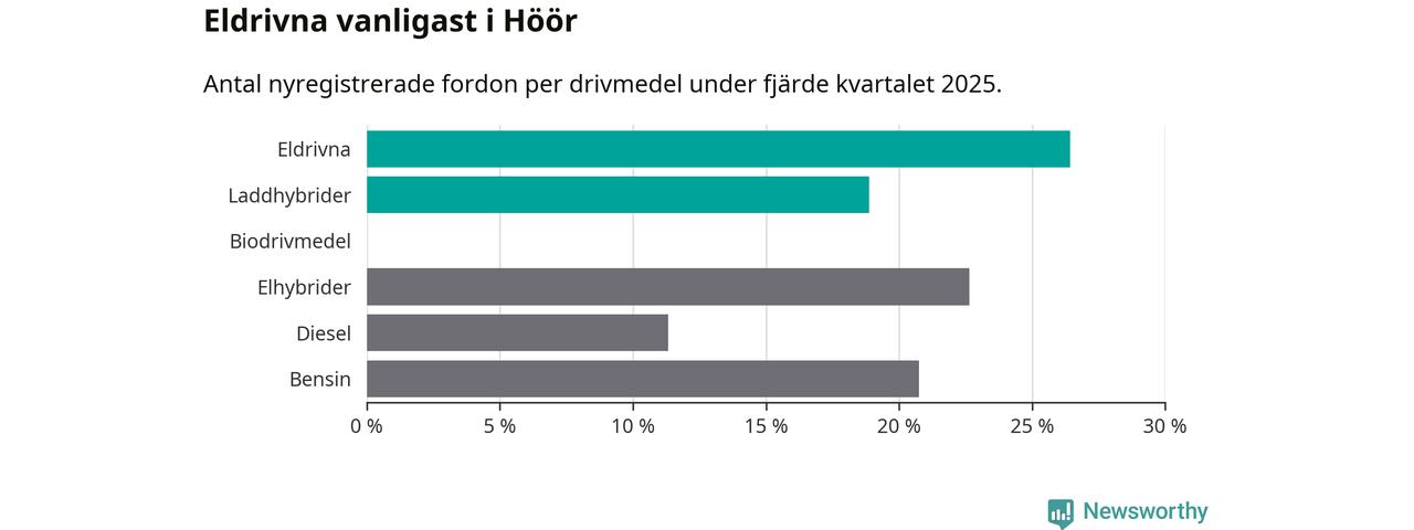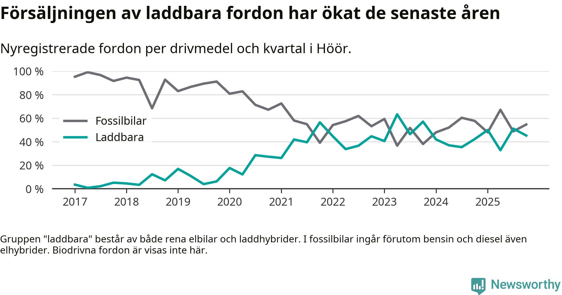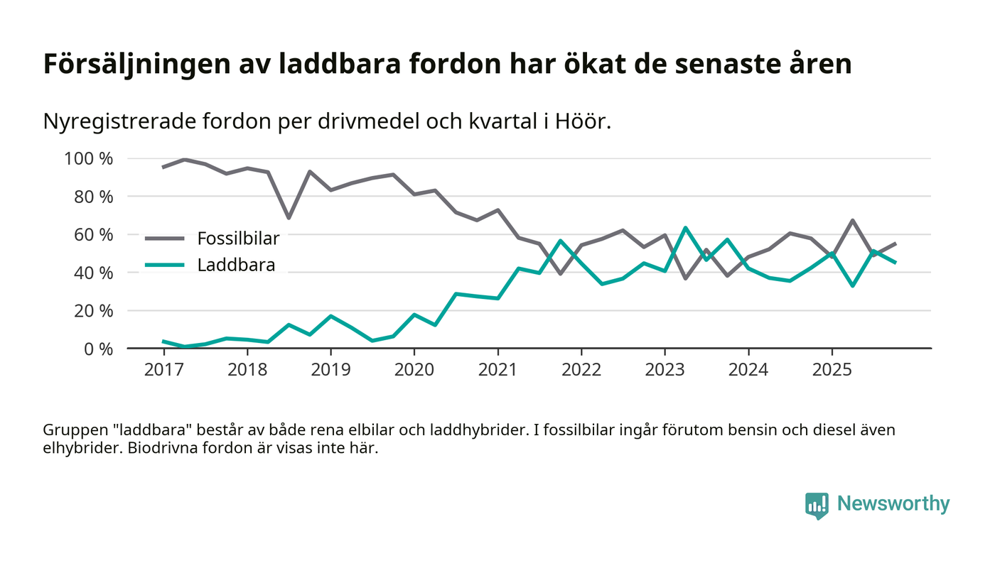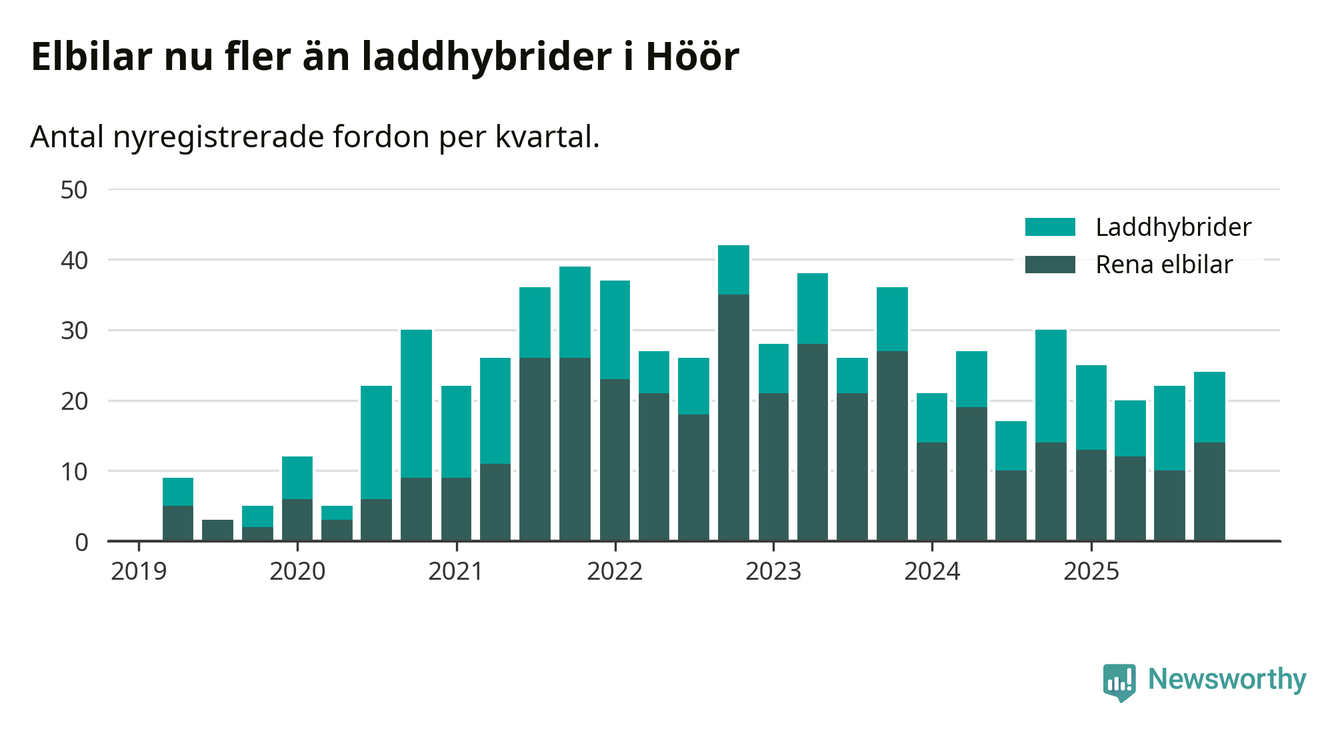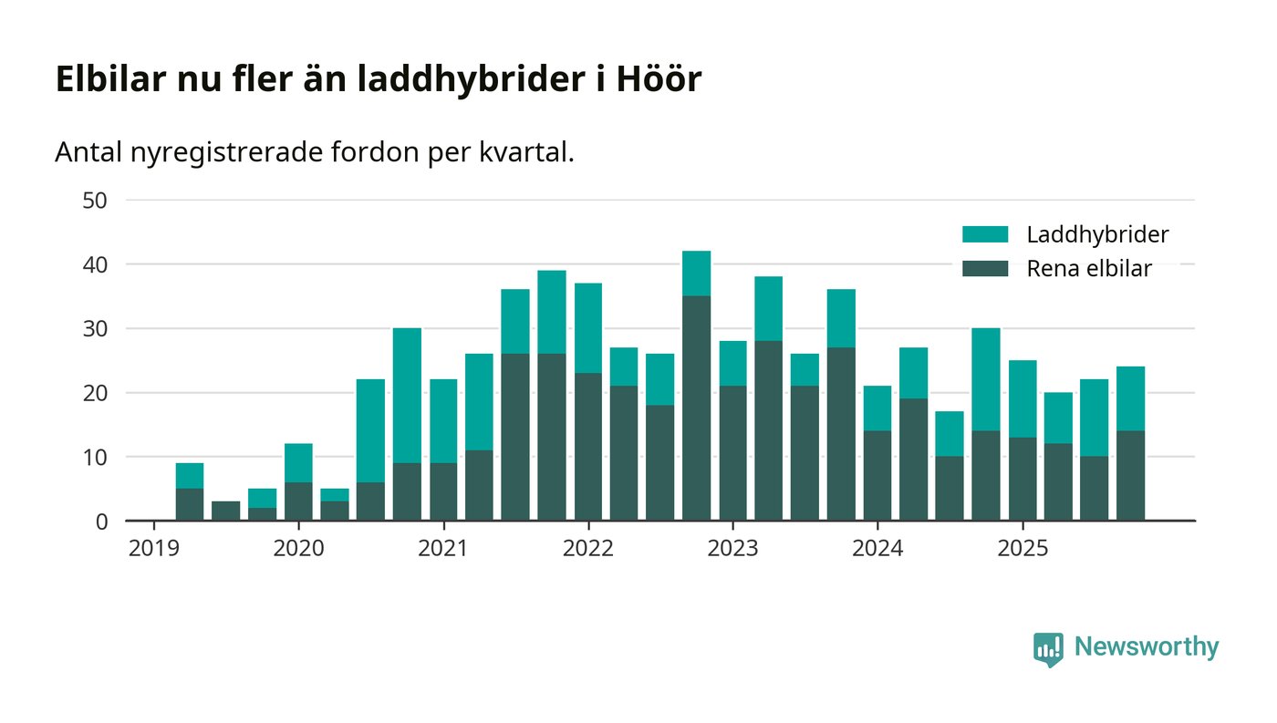 Under fjärde kvartalet 2025 var 45 procent av alla nyregistrerade personbilar i Höör laddbara (sammanlagt registrerades 53 nya bilar). Merparten av de laddbara bilarna var rena elbilar (26 procent av alla).