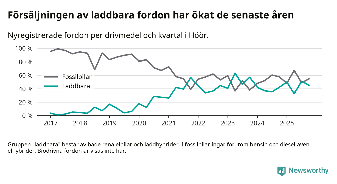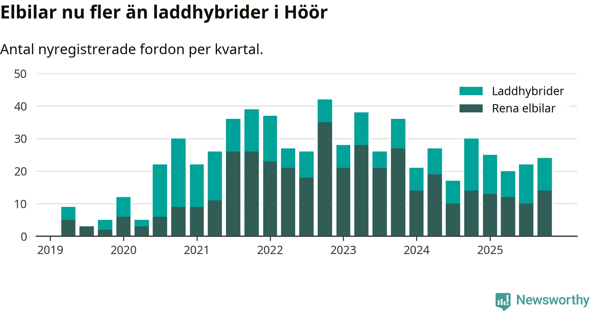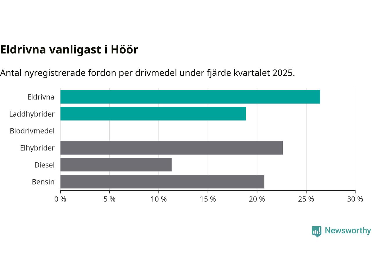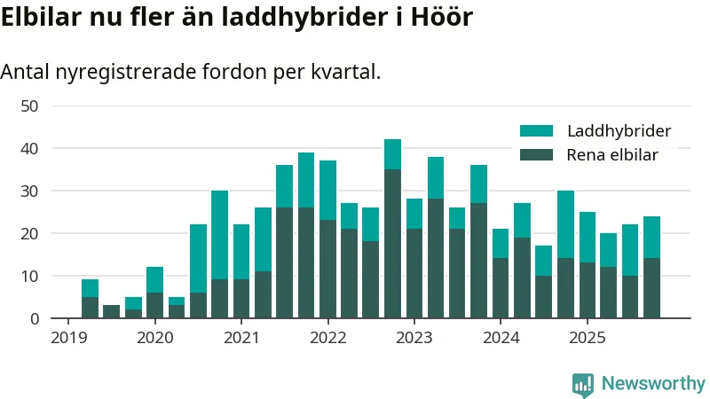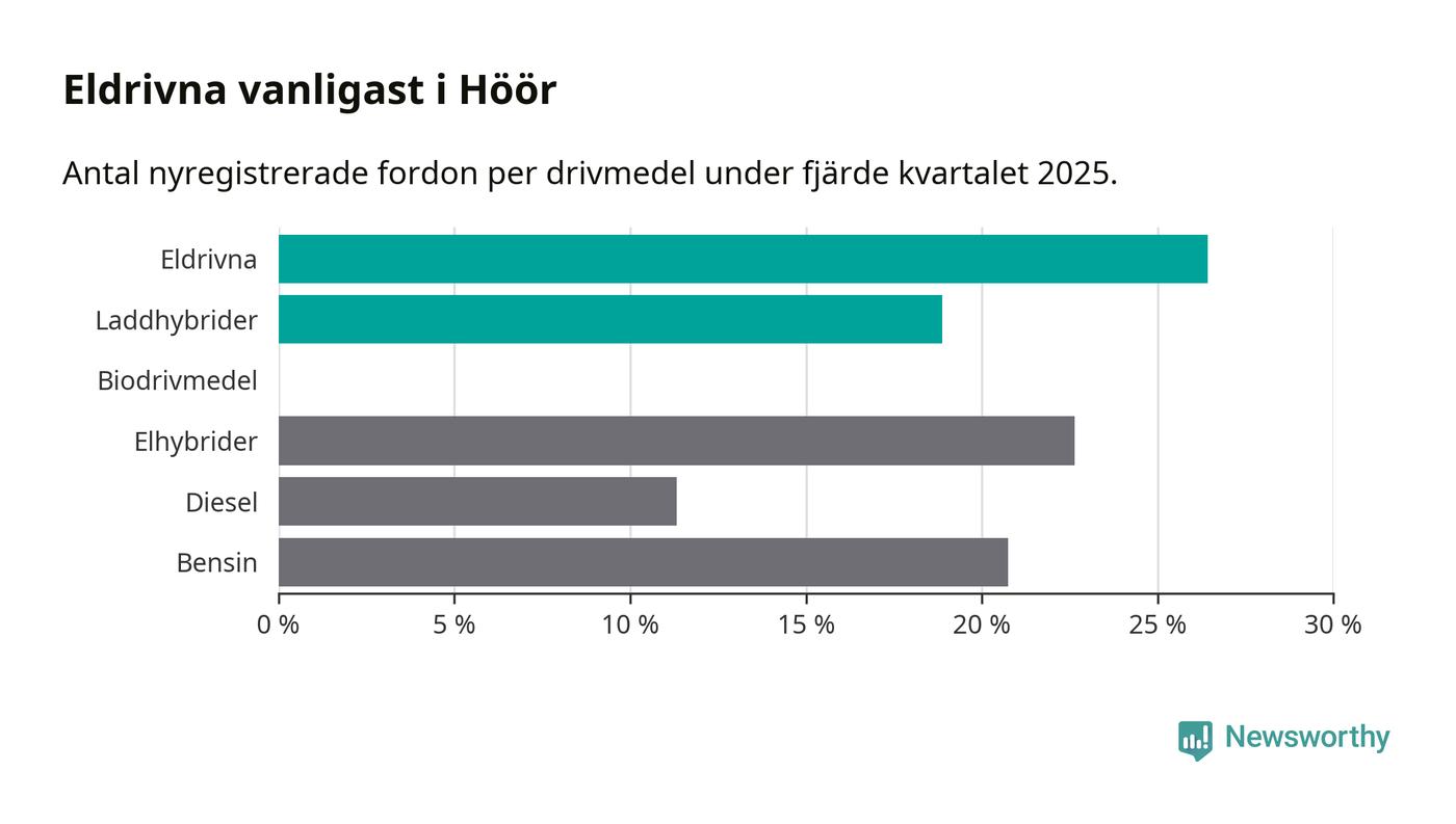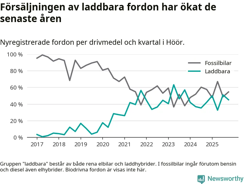 Under fjärde kvartalet 2025 var 45 procent av alla nyregistrerade personbilar i Höör laddbara (sammanlagt registrerades 53 nya bilar). Merparten av de laddbara bilarna var rena elbilar (26 procent av alla).