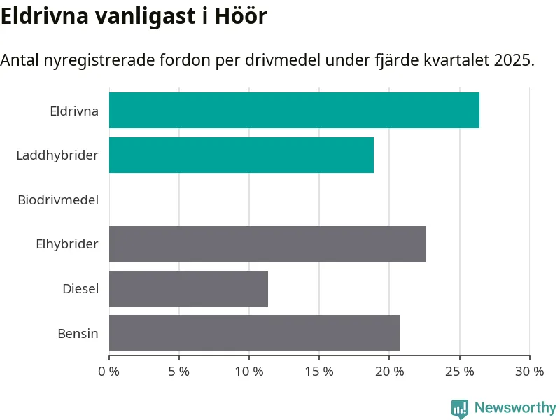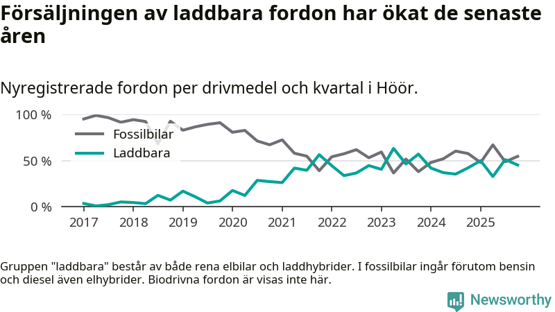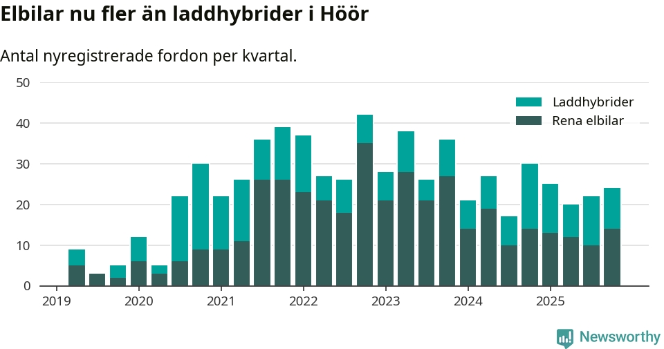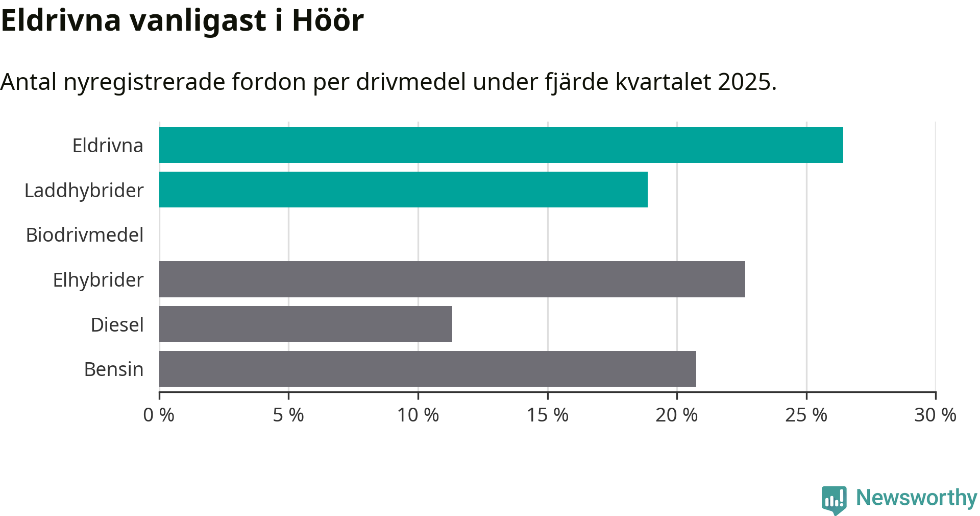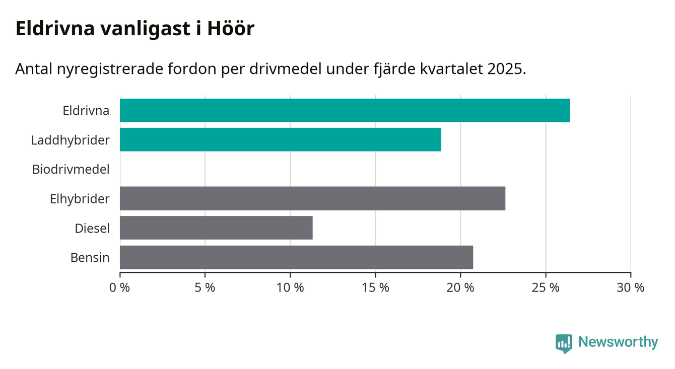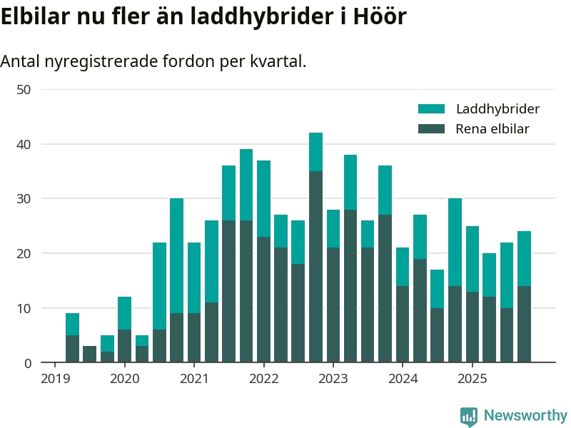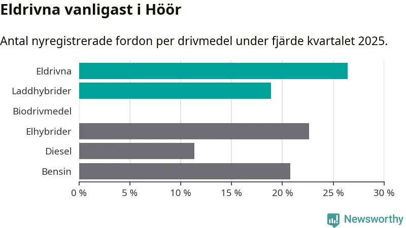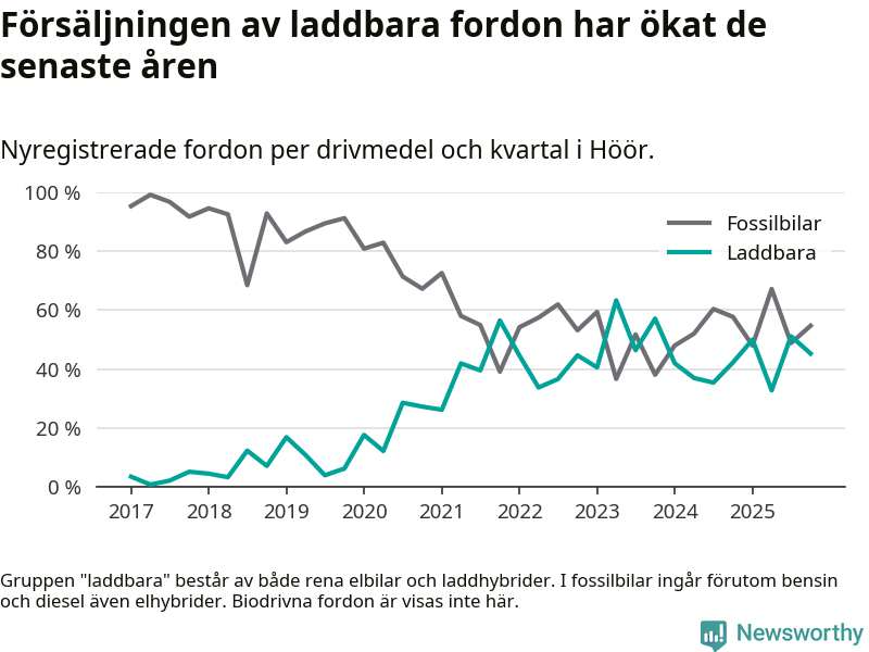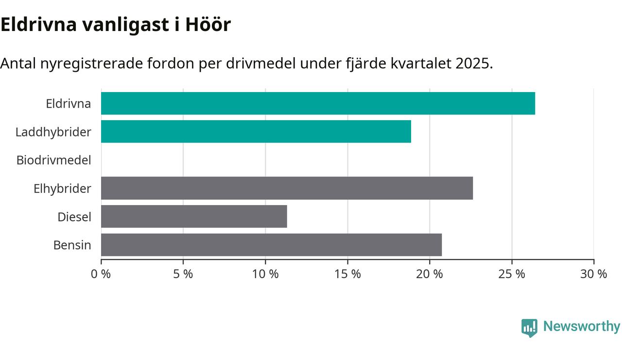Under fjärde kvartalet 2025 var 45 procent av alla nyregistrerade personbilar i Höör laddbara (sammanlagt registrerades 53 nya bilar). Merparten av de laddbara bilarna var rena elbilar (26 procent av alla).