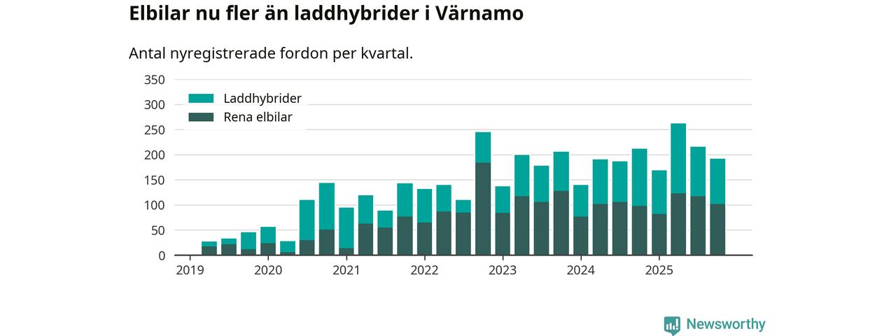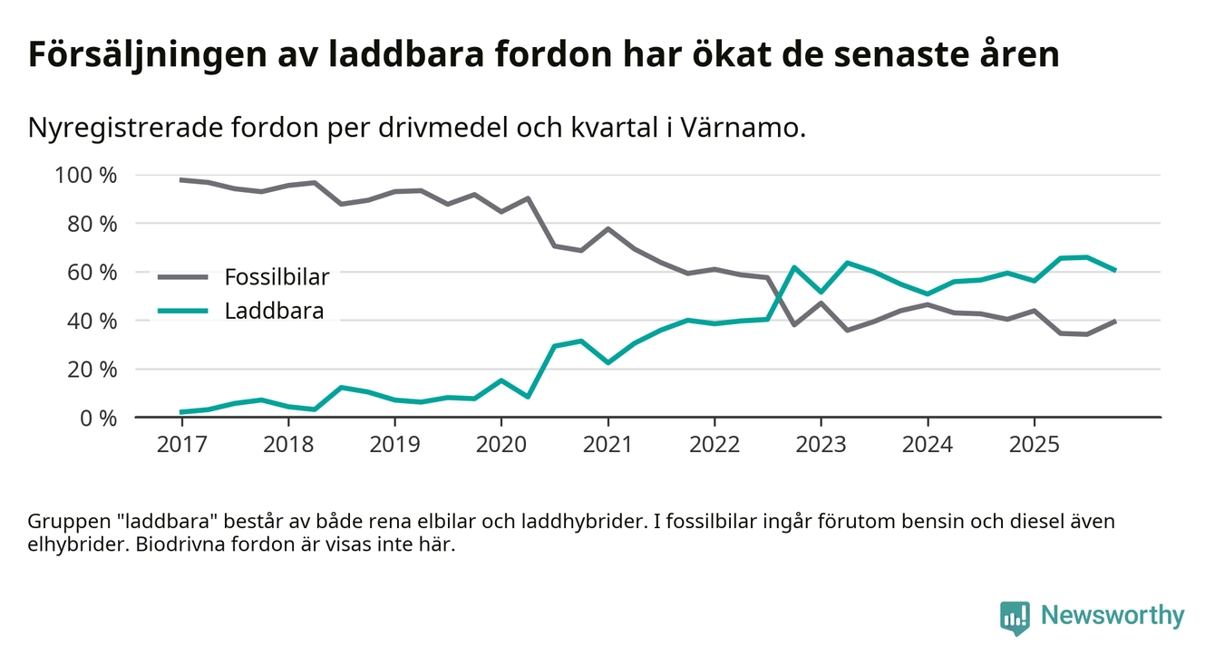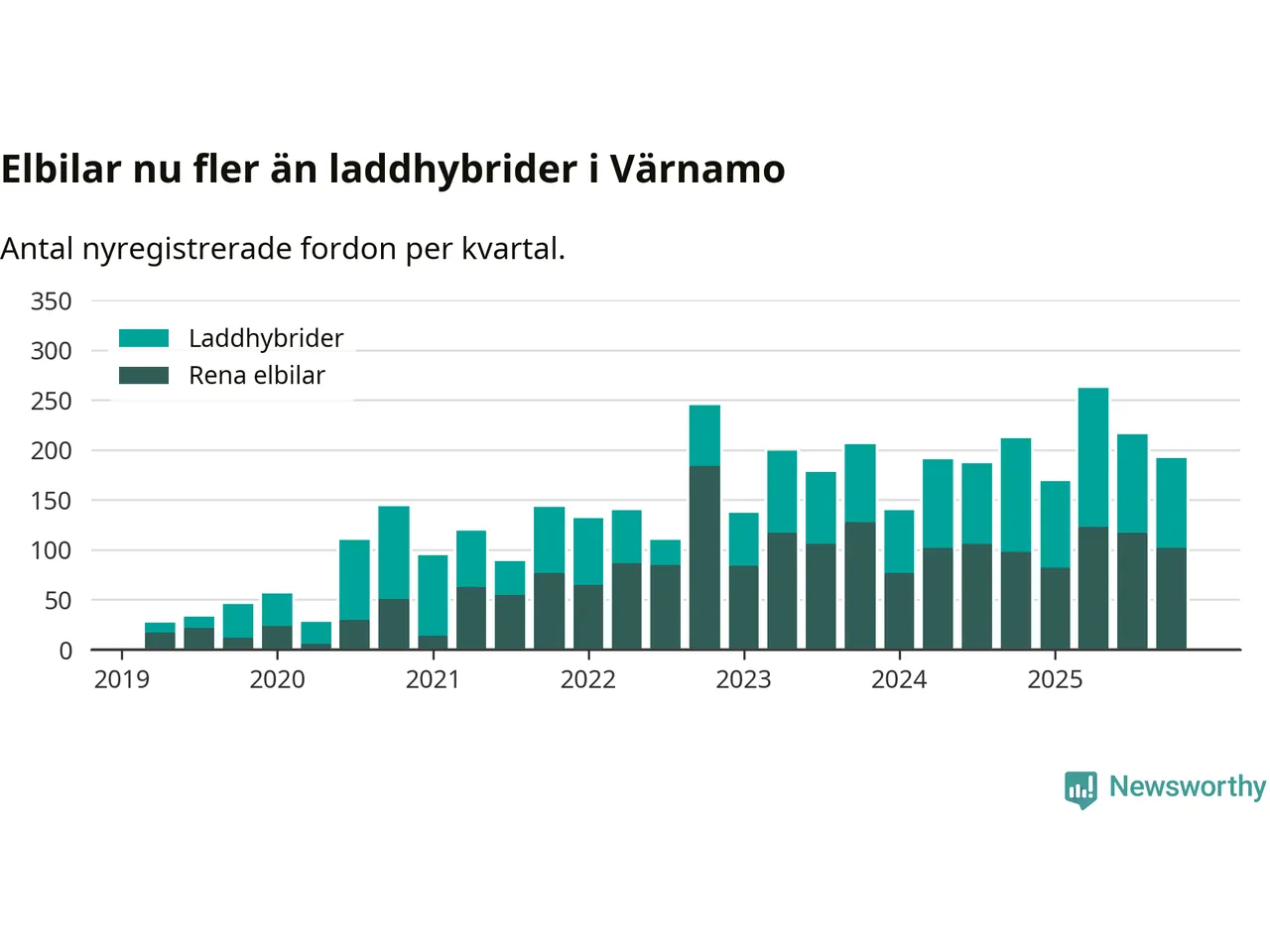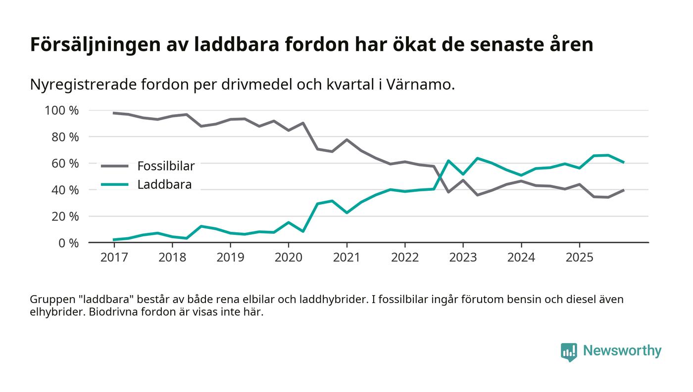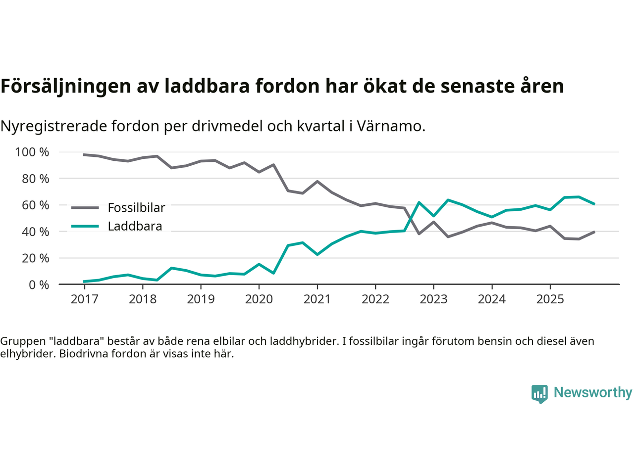 Under fjärde kvartalet 2025 var 61 procent av alla nyregistrerade personbilar i Värnamo laddbara (sammanlagt registrerades 316 nya bilar). Merparten av de laddbara bilarna var rena elbilar (32 procent av alla).