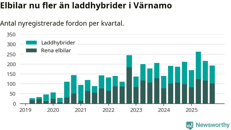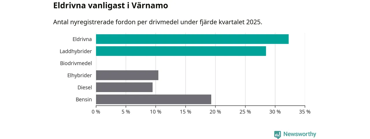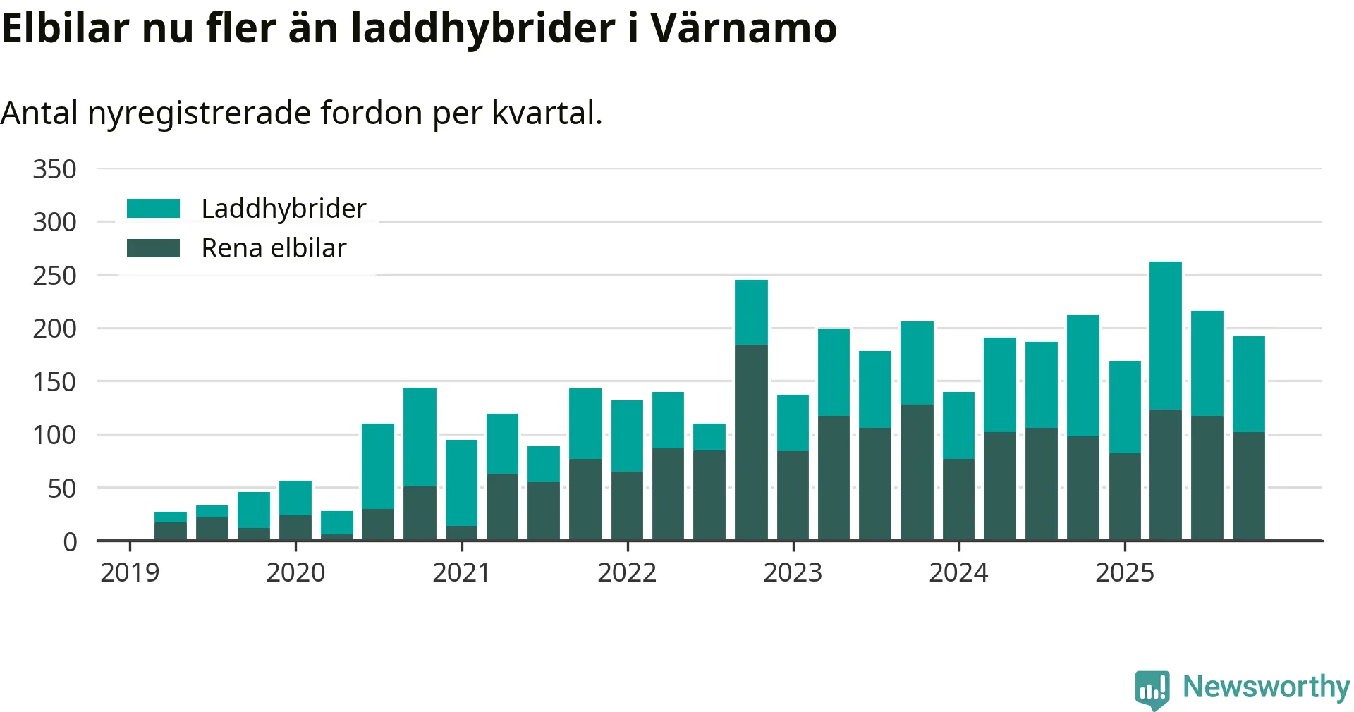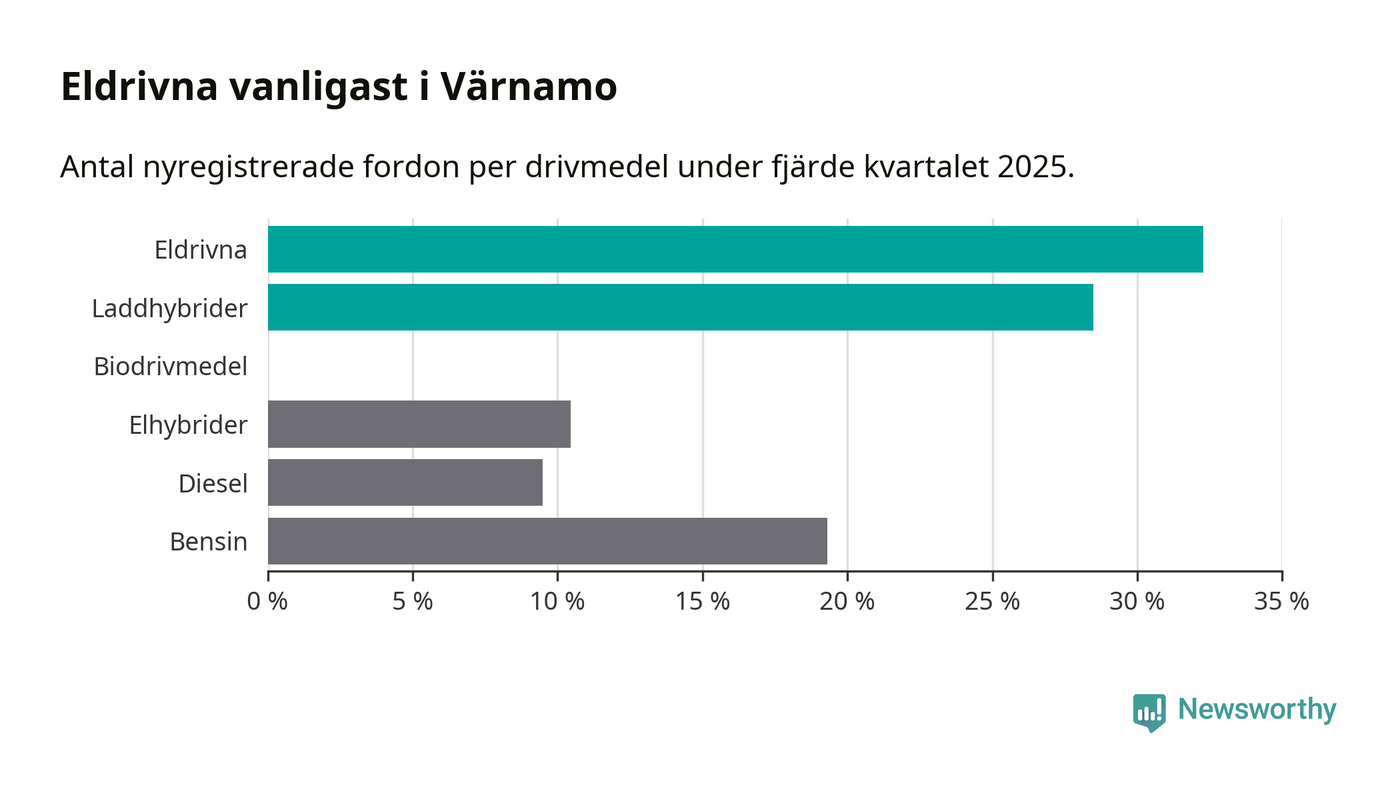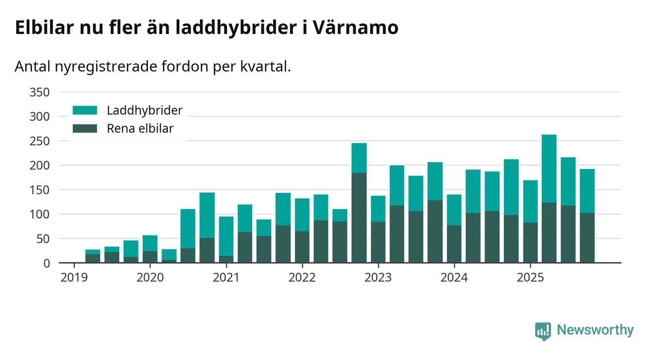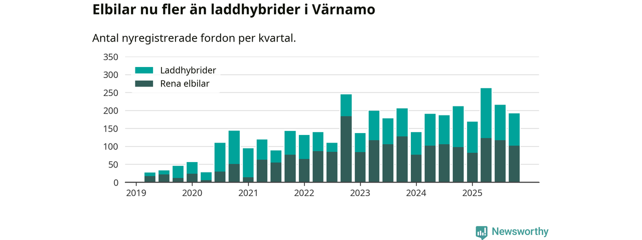 Under fjärde kvartalet 2025 var 61 procent av alla nyregistrerade personbilar i Värnamo laddbara (sammanlagt registrerades 316 nya bilar). Merparten av de laddbara bilarna var rena elbilar (32 procent av alla).