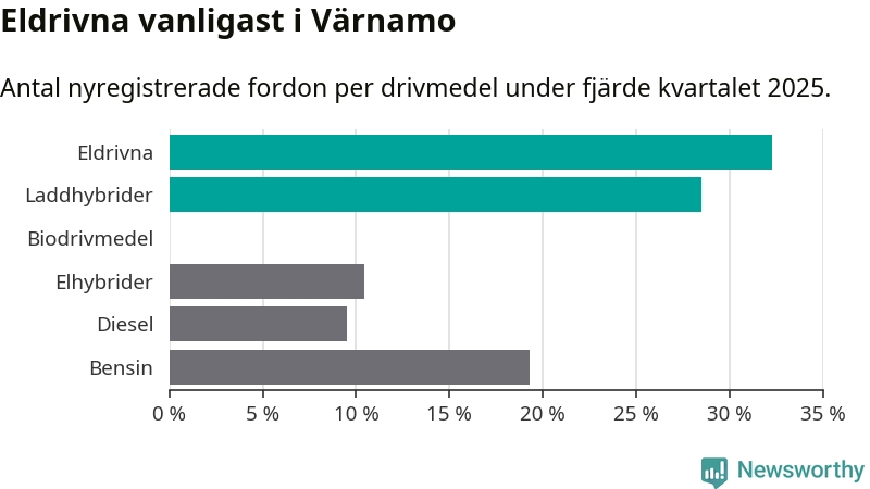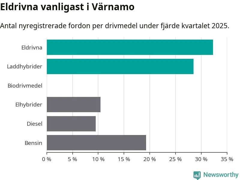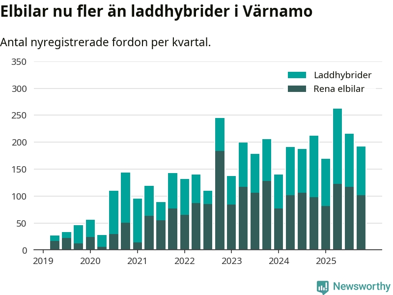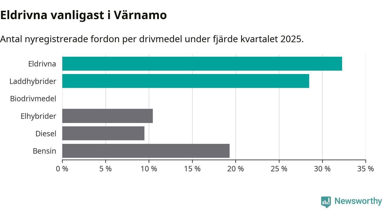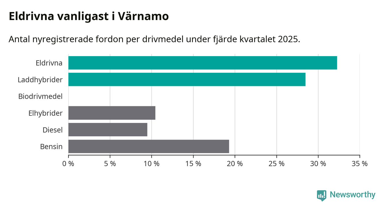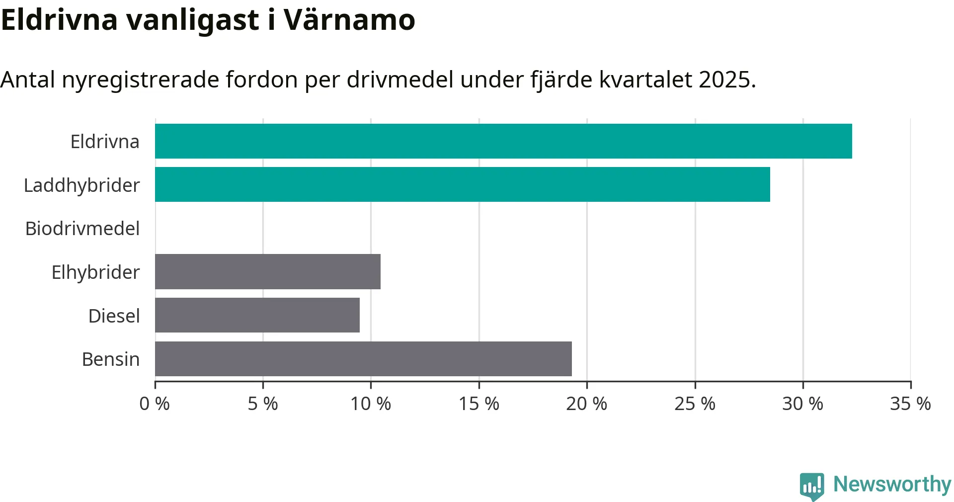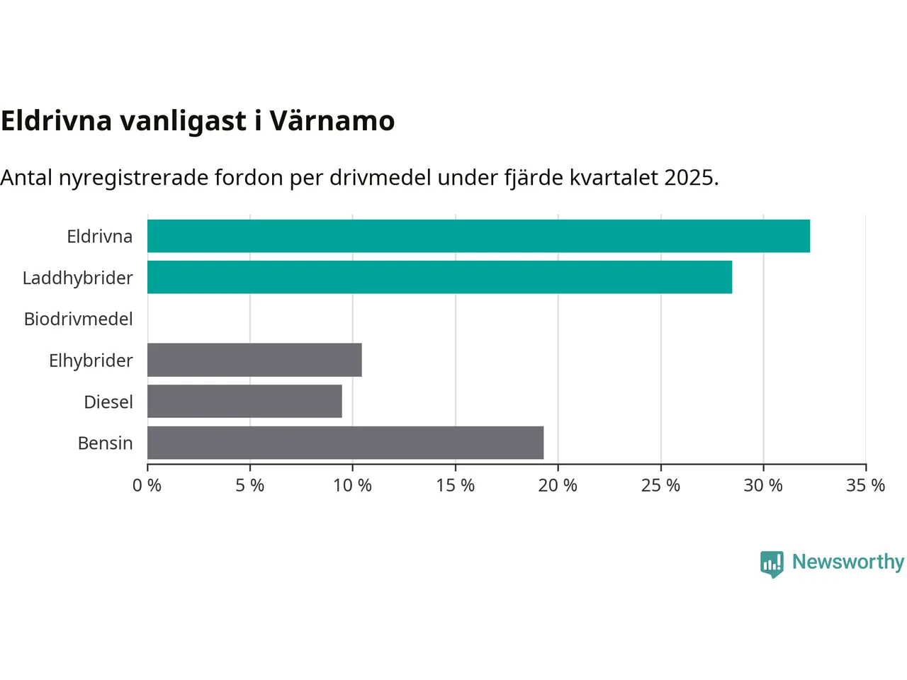 Under fjärde kvartalet 2025 var 61 procent av alla nyregistrerade personbilar i Värnamo laddbara (sammanlagt registrerades 316 nya bilar). Merparten av de laddbara bilarna var rena elbilar (32 procent av alla).