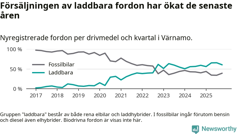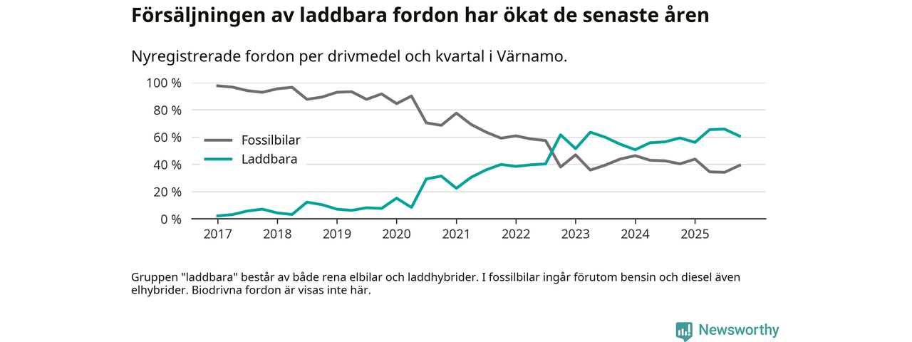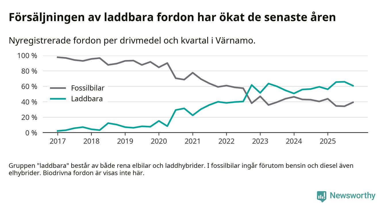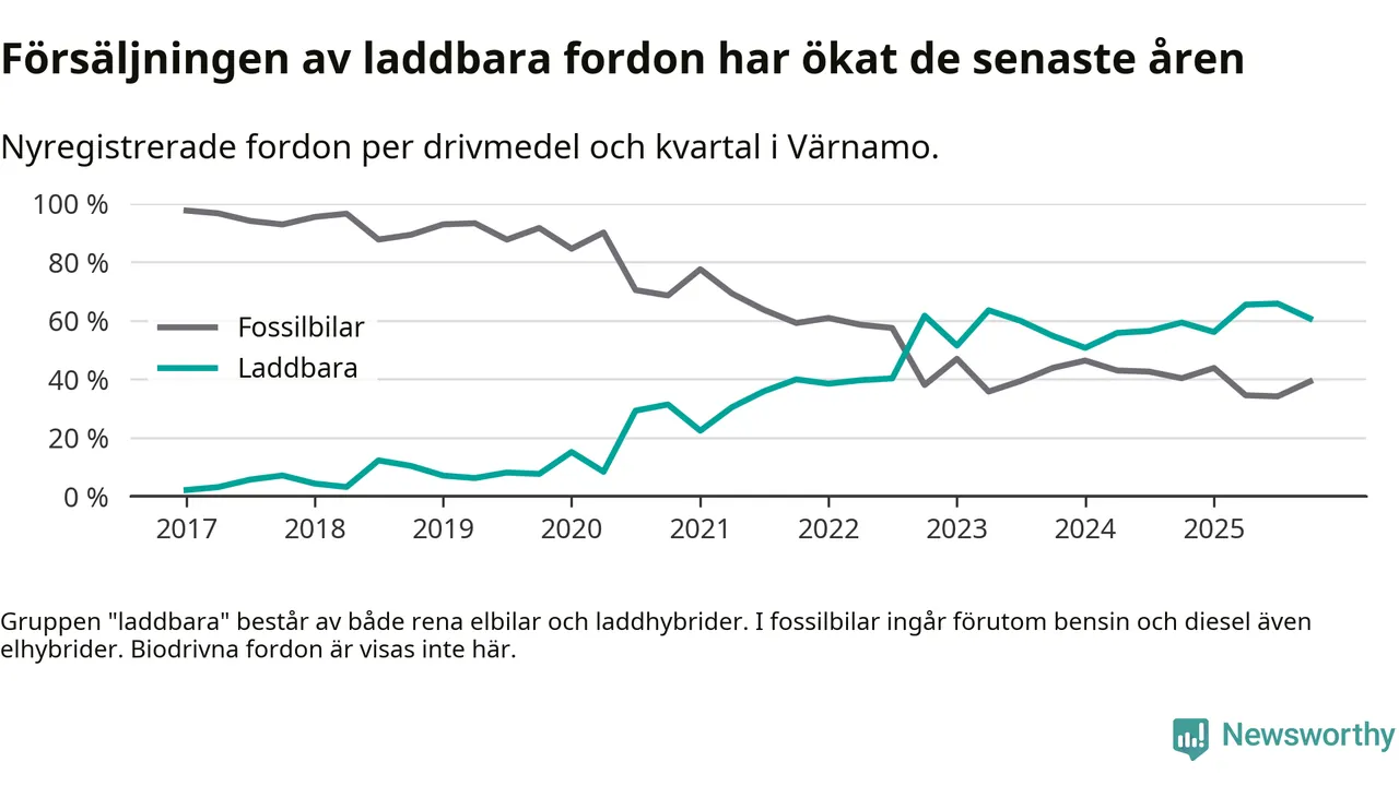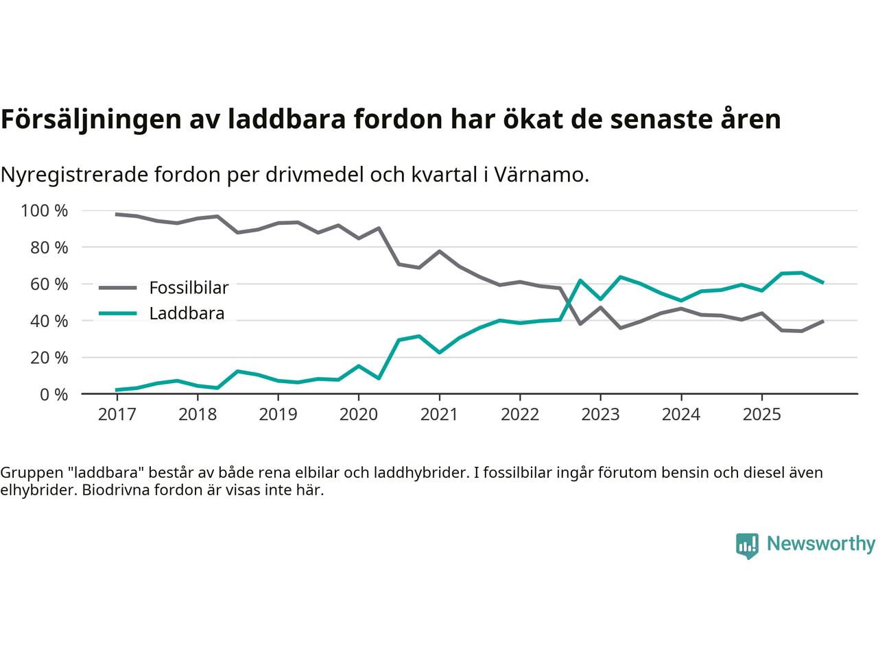 I Värnamo minskade andelen laddbara bilar under fjärde kvartalet jämfört med kvartalet innan (−5,1 procentenheter). Nyregistreringen peakade under tredje kvartalet 2025 då 66 procent av de nya bilarna var laddbara.