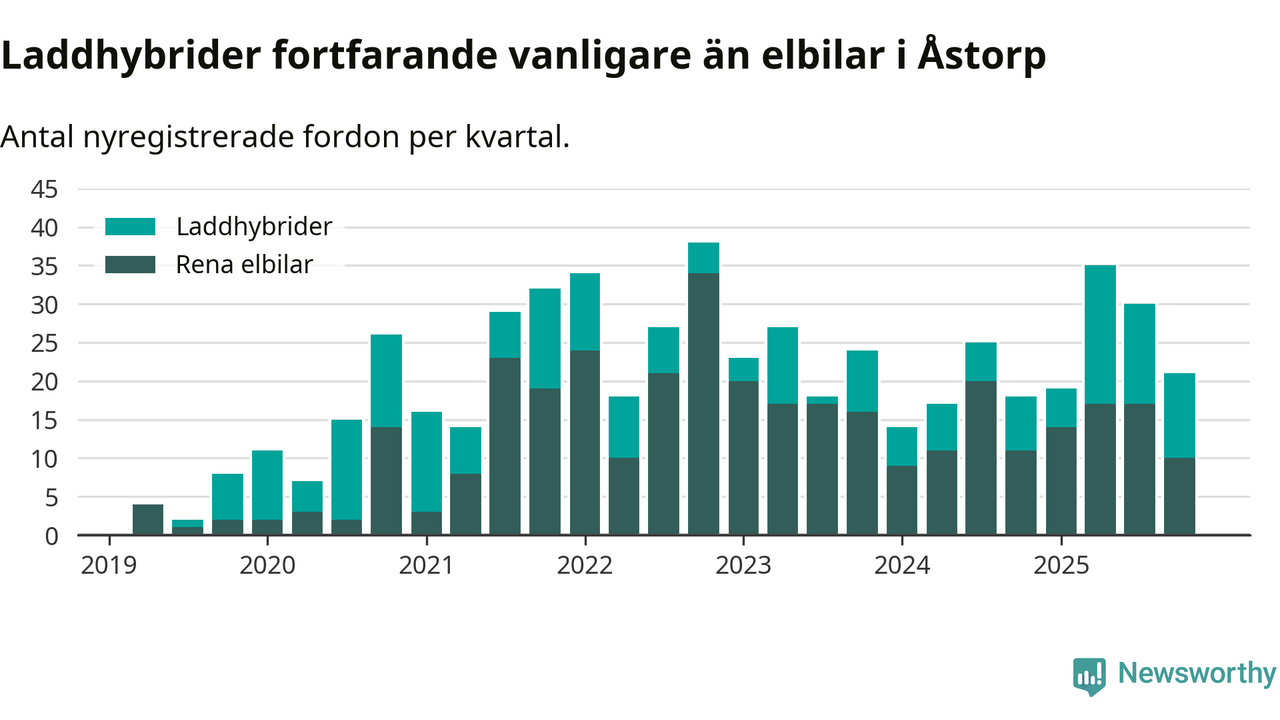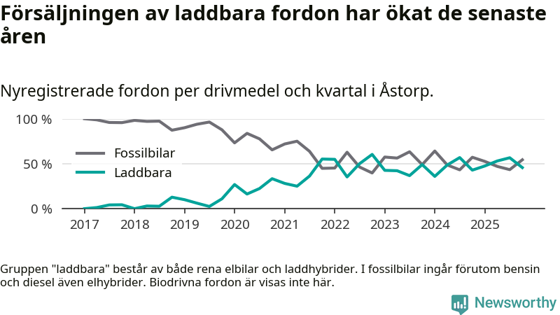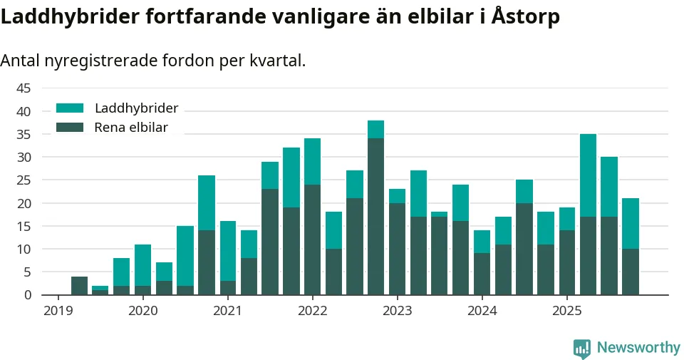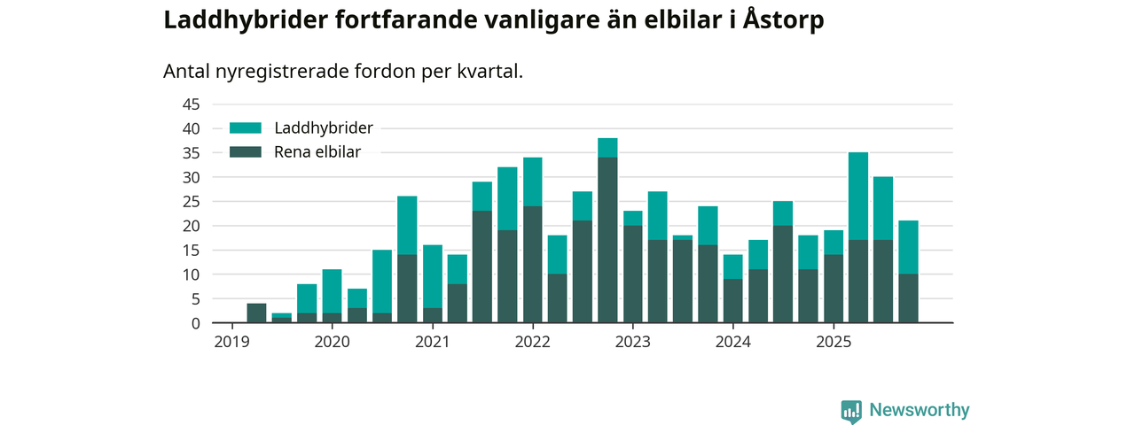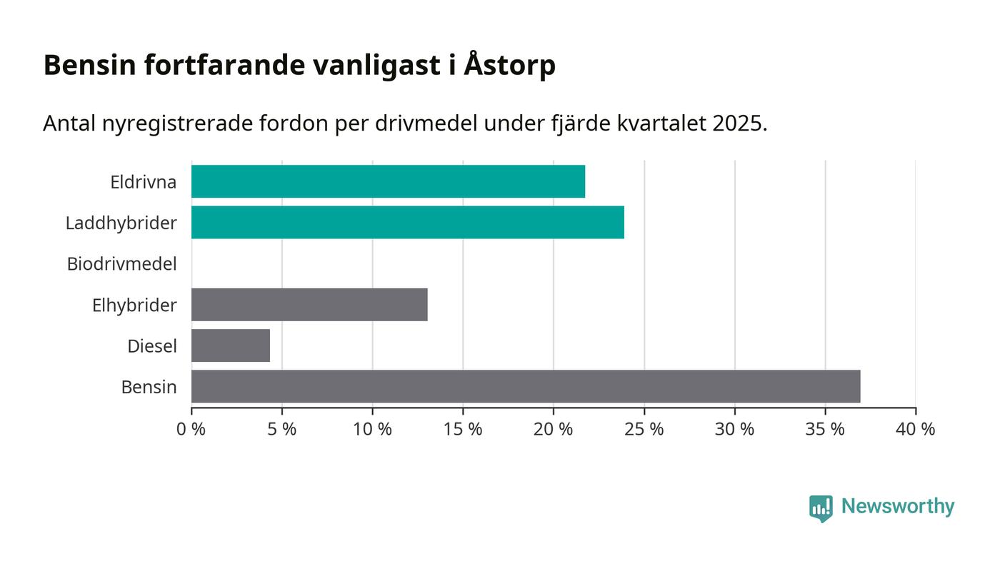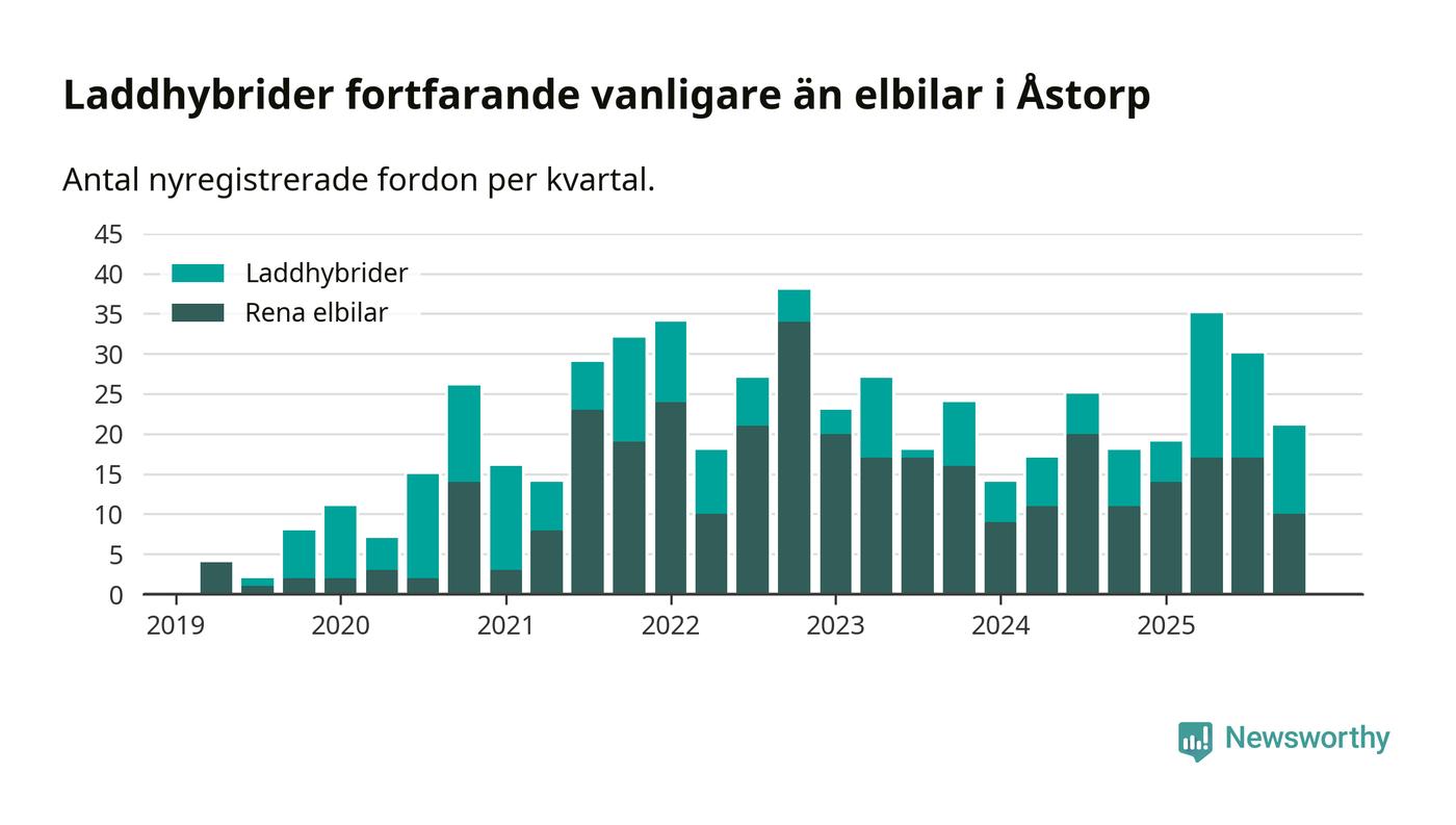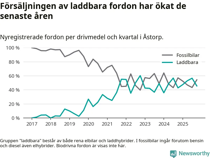 Under fjärde kvartalet 2025 var 46 procent av alla nyregistrerade personbilar i Åstorp laddbara (sammanlagt registrerades 46 nya bilar). Merparten av de laddbara bilarna var så kallade laddhybrider, det vill säga fordon som går att ladda och köra på el, men som även har en förbränningsmotor. 22 procent av alla nya bilar var rena elbilar.