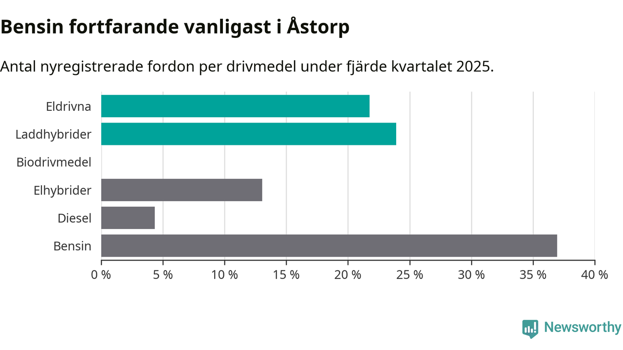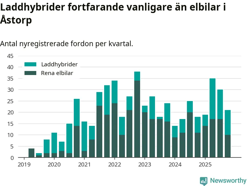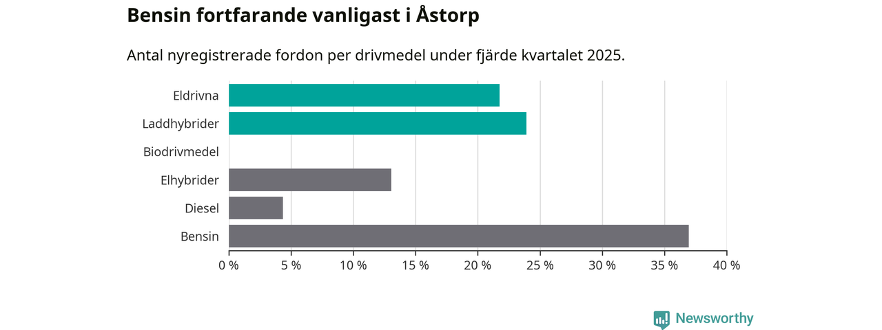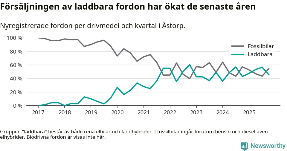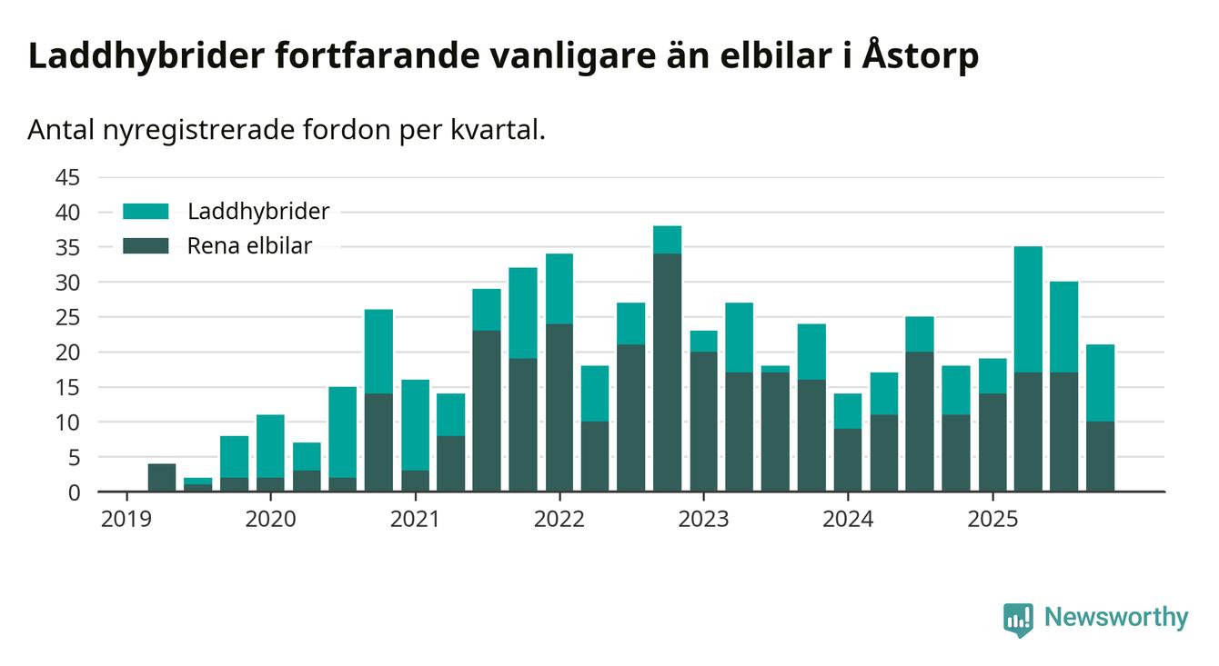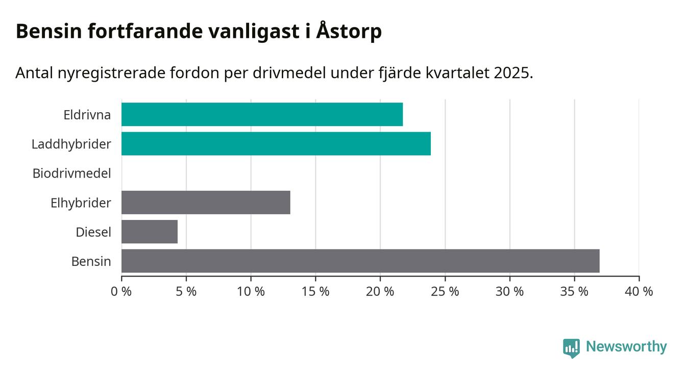 Under fjärde kvartalet 2025 var 46 procent av alla nyregistrerade personbilar i Åstorp laddbara (sammanlagt registrerades 46 nya bilar). Merparten av de laddbara bilarna var så kallade laddhybrider, det vill säga fordon som går att ladda och köra på el, men som även har en förbränningsmotor. 22 procent av alla nya bilar var rena elbilar.