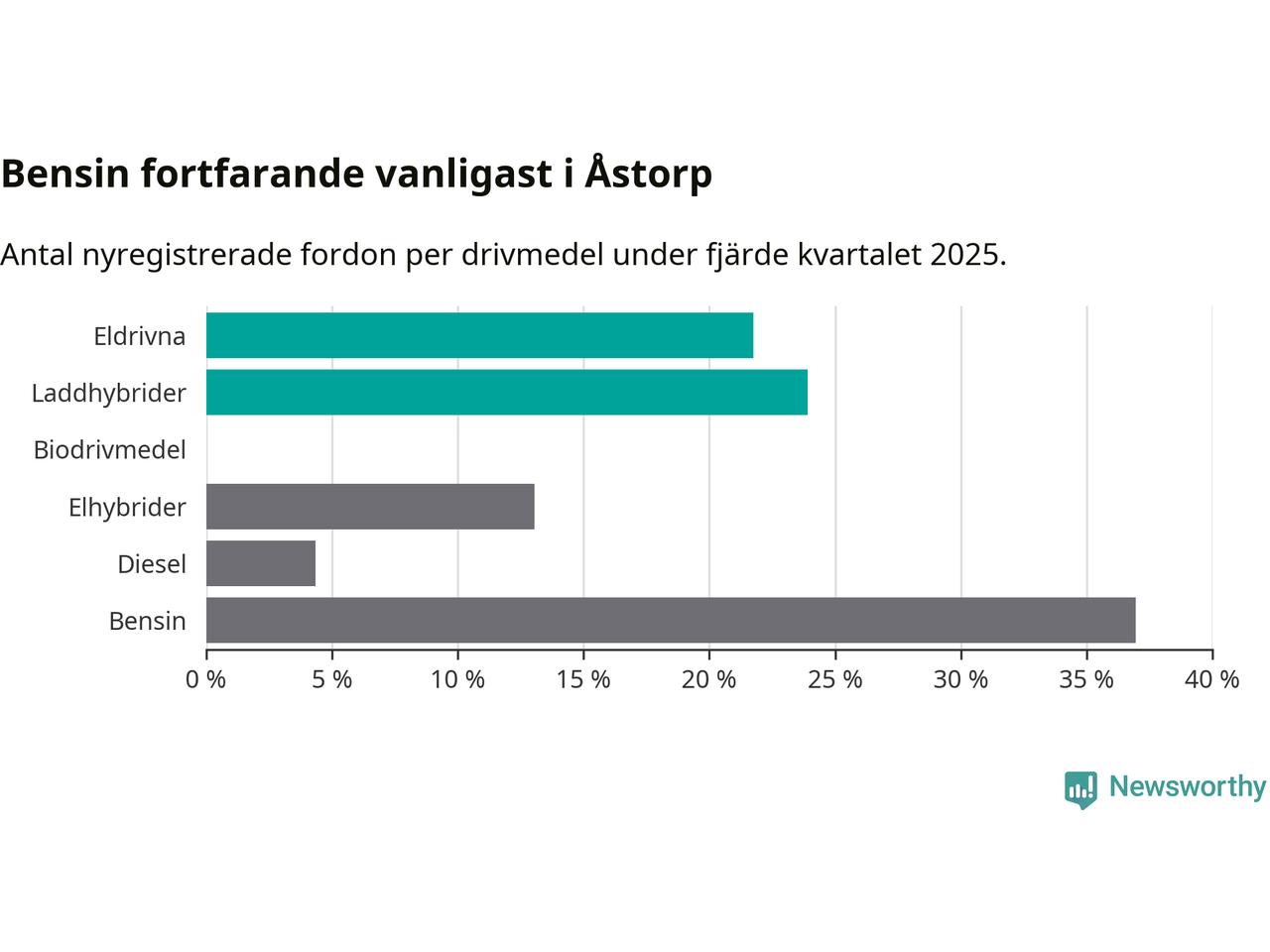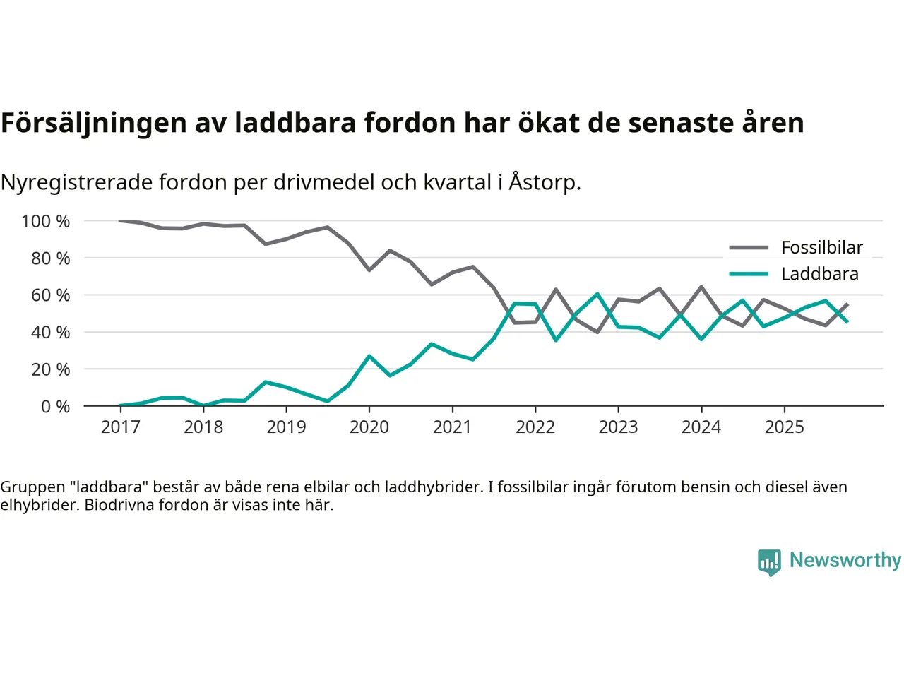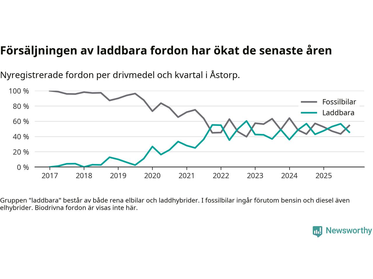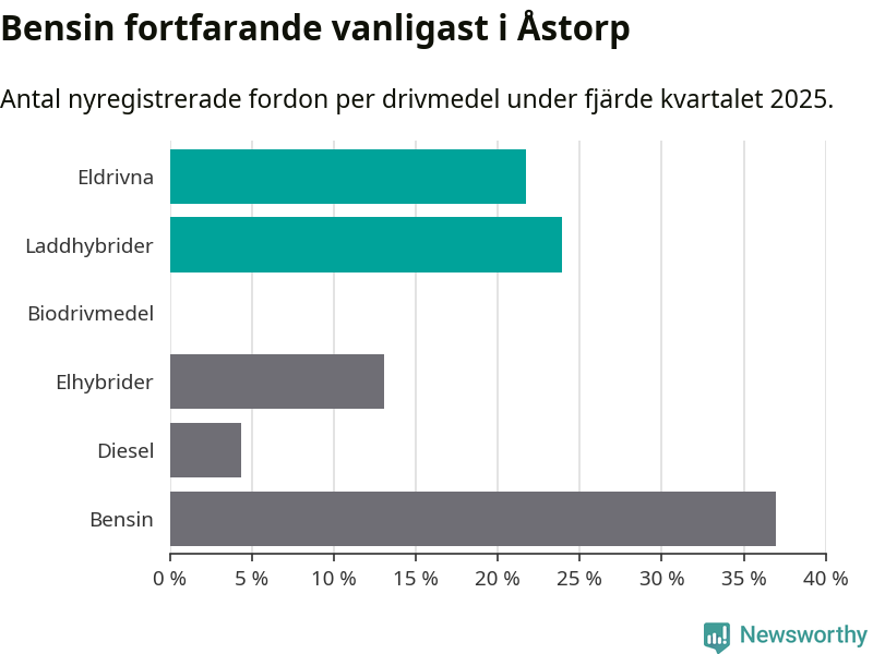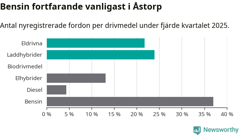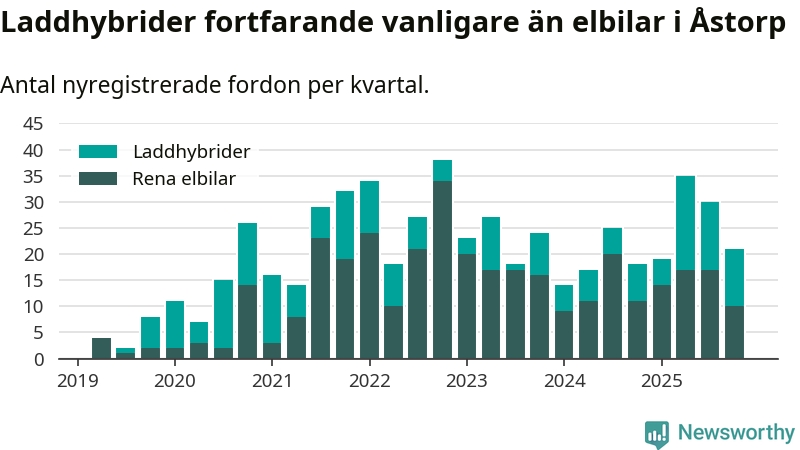 Under fjärde kvartalet 2025 var 46 procent av alla nyregistrerade personbilar i Åstorp laddbara (sammanlagt registrerades 46 nya bilar). Merparten av de laddbara bilarna var så kallade laddhybrider, det vill säga fordon som går att ladda och köra på el, men som även har en förbränningsmotor. 22 procent av alla nya bilar var rena elbilar.