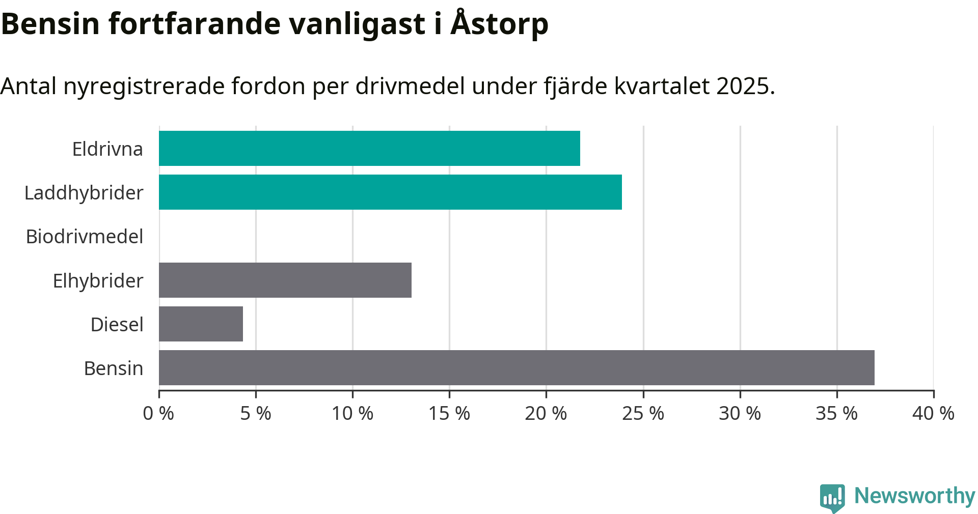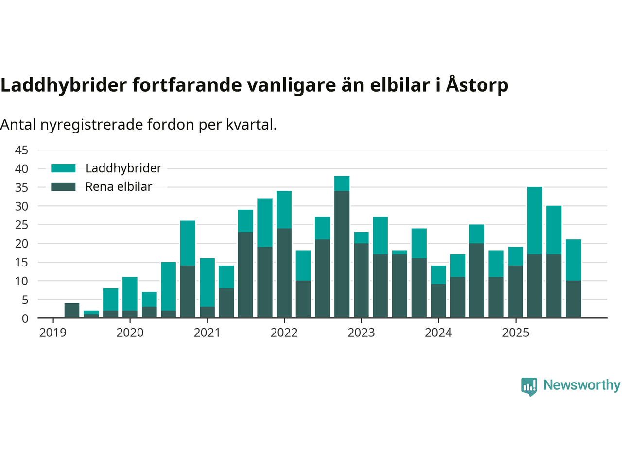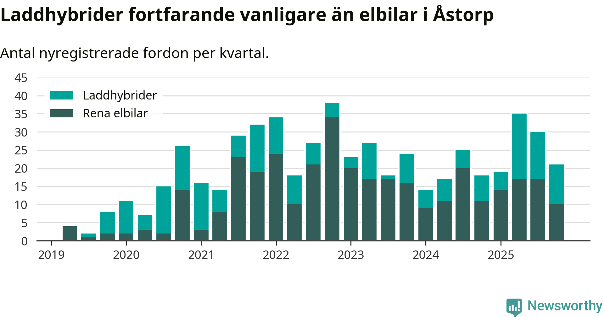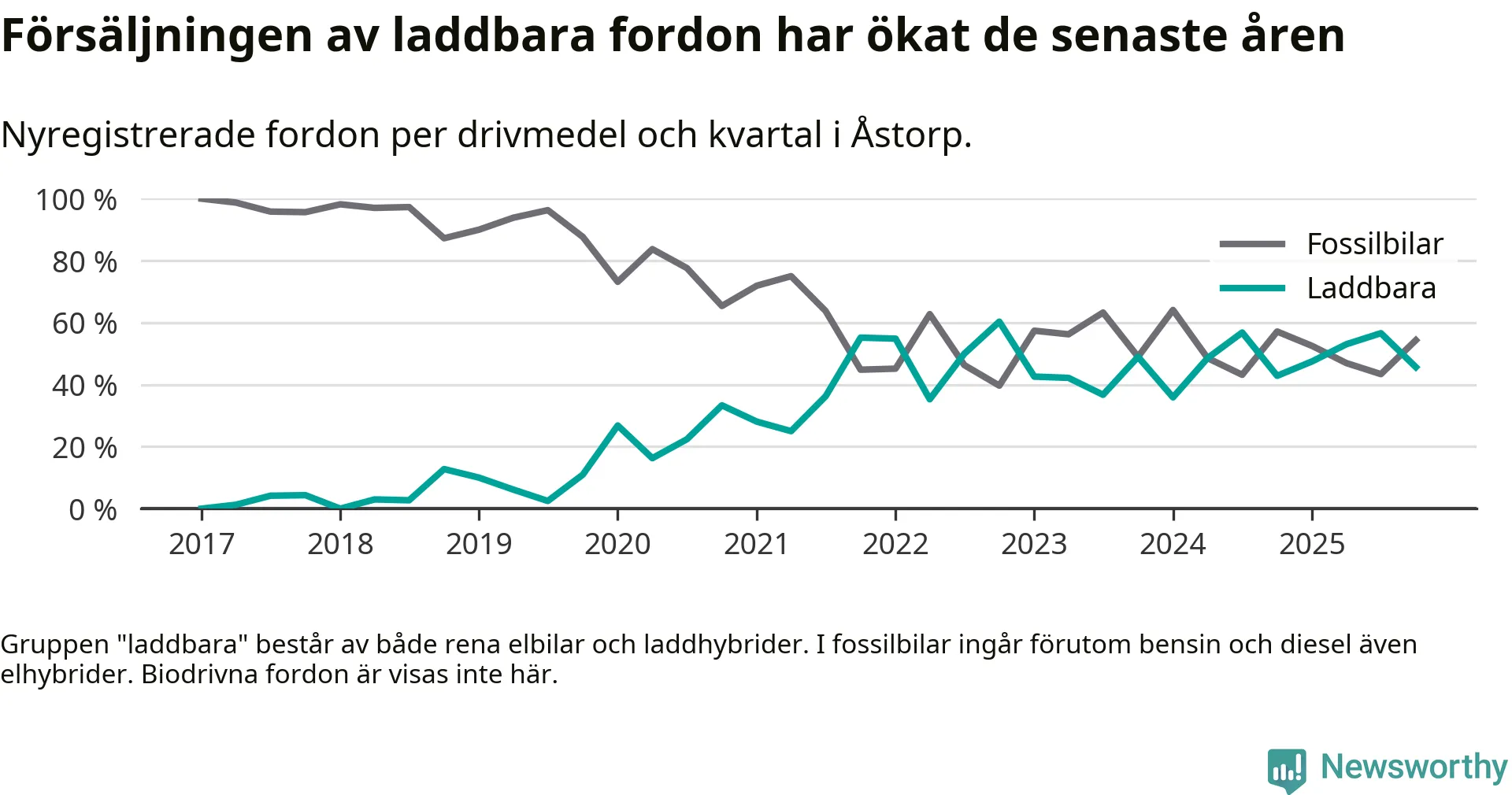 Under fjärde kvartalet 2025 var 46 procent av alla nyregistrerade personbilar i Åstorp laddbara (sammanlagt registrerades 46 nya bilar). Merparten av de laddbara bilarna var så kallade laddhybrider, det vill säga fordon som går att ladda och köra på el, men som även har en förbränningsmotor. 22 procent av alla nya bilar var rena elbilar.