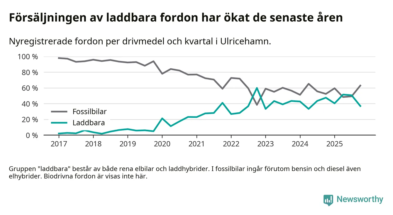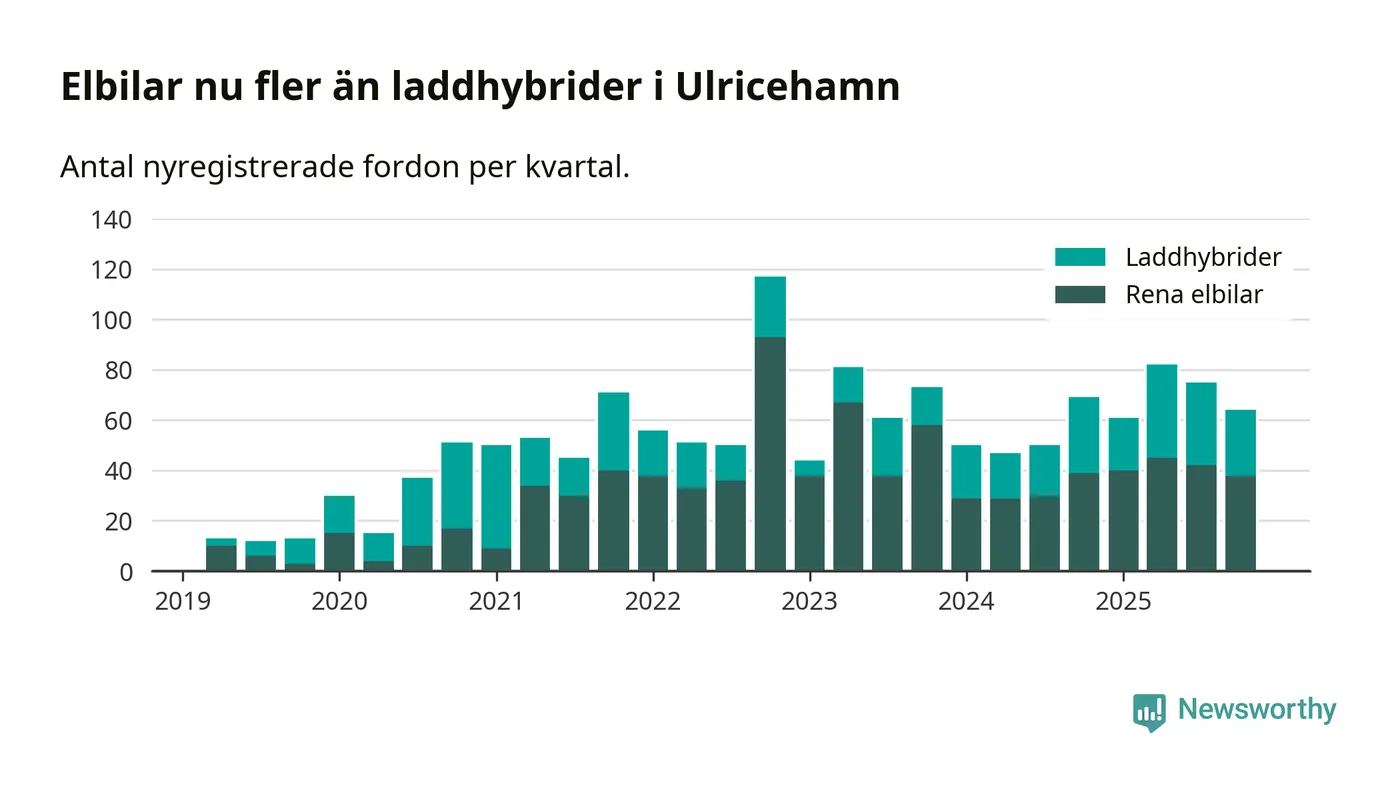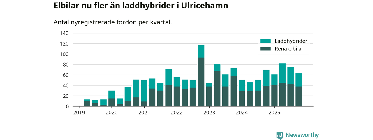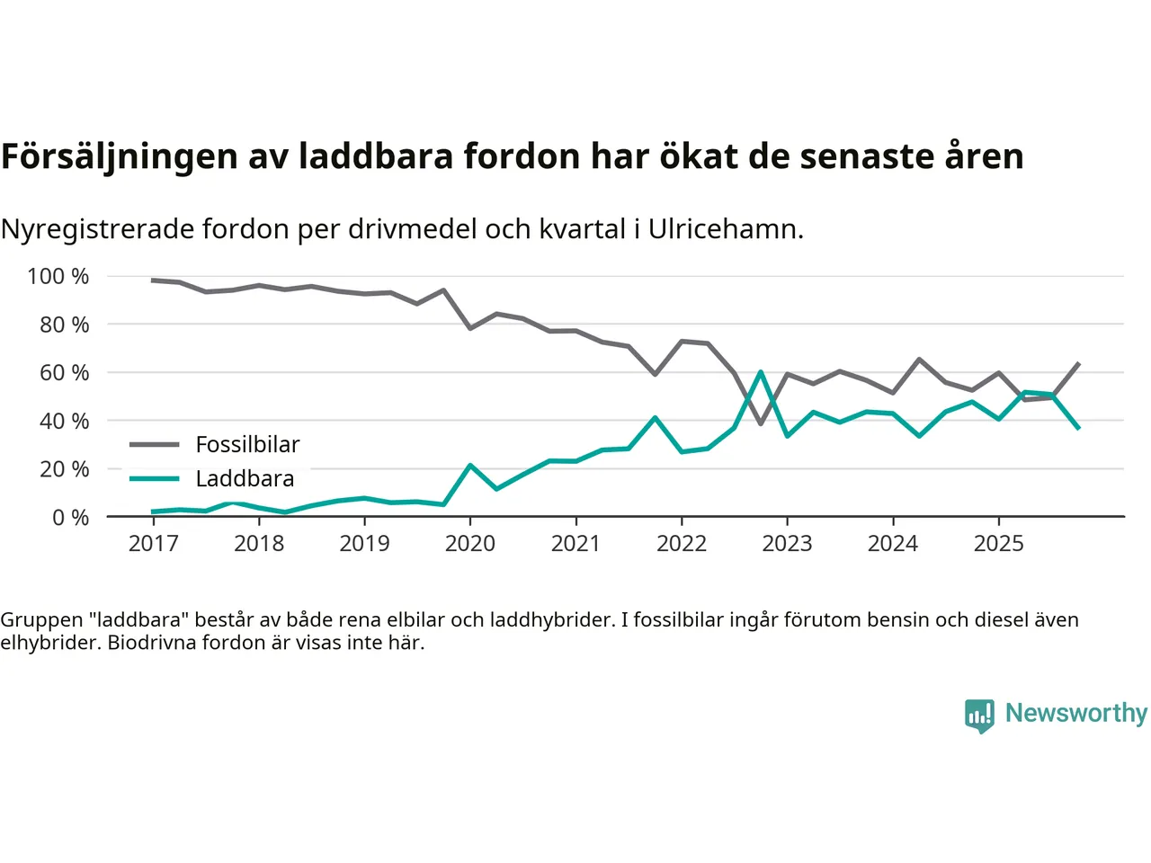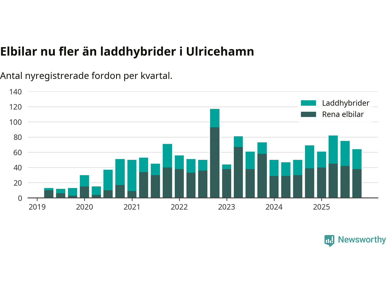 Under fjärde kvartalet 2025 var 37 procent av alla nyregistrerade personbilar i Ulricehamn laddbara (sammanlagt registrerades 173 nya bilar). Merparten av de laddbara bilarna var rena elbilar (22 procent av alla).