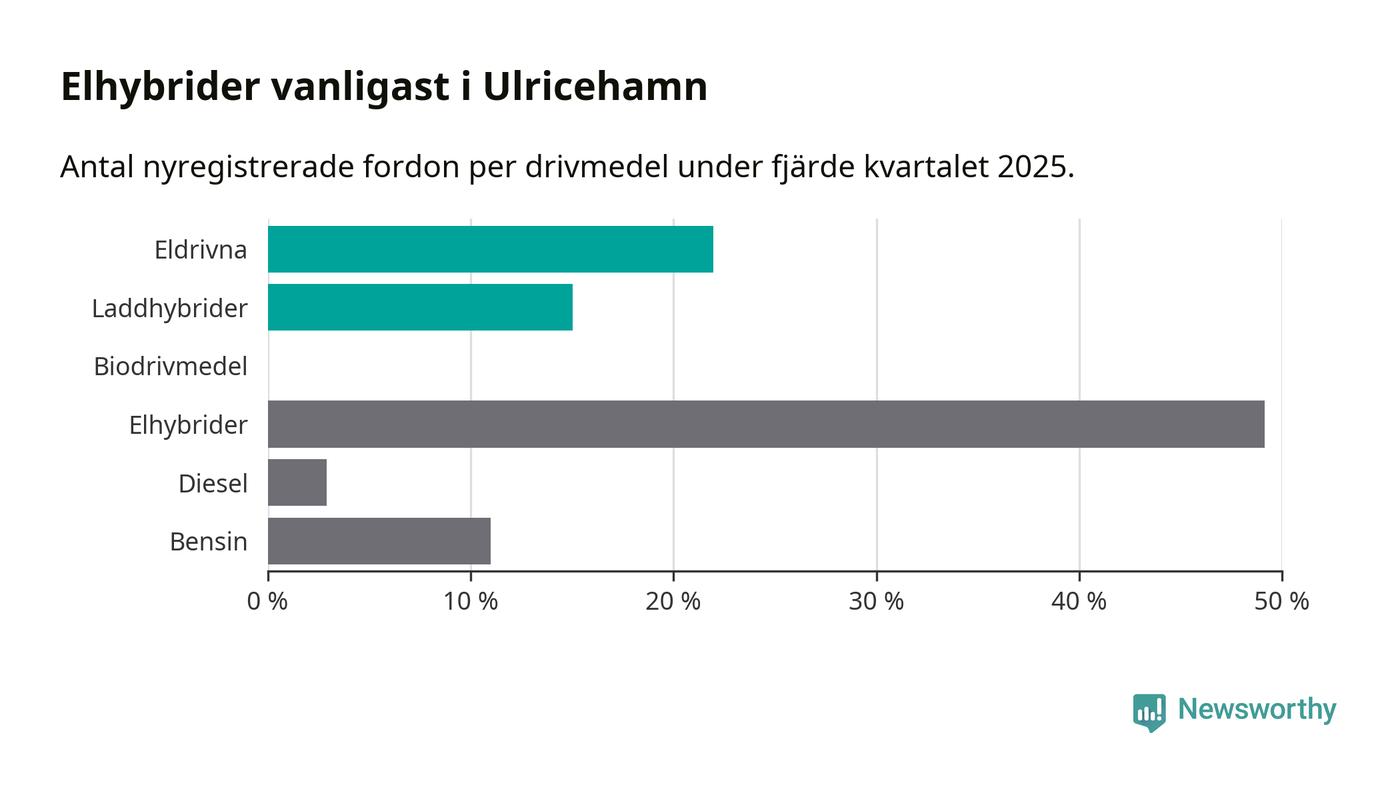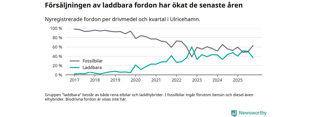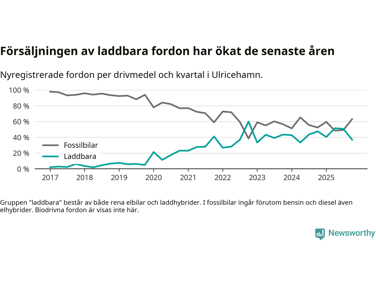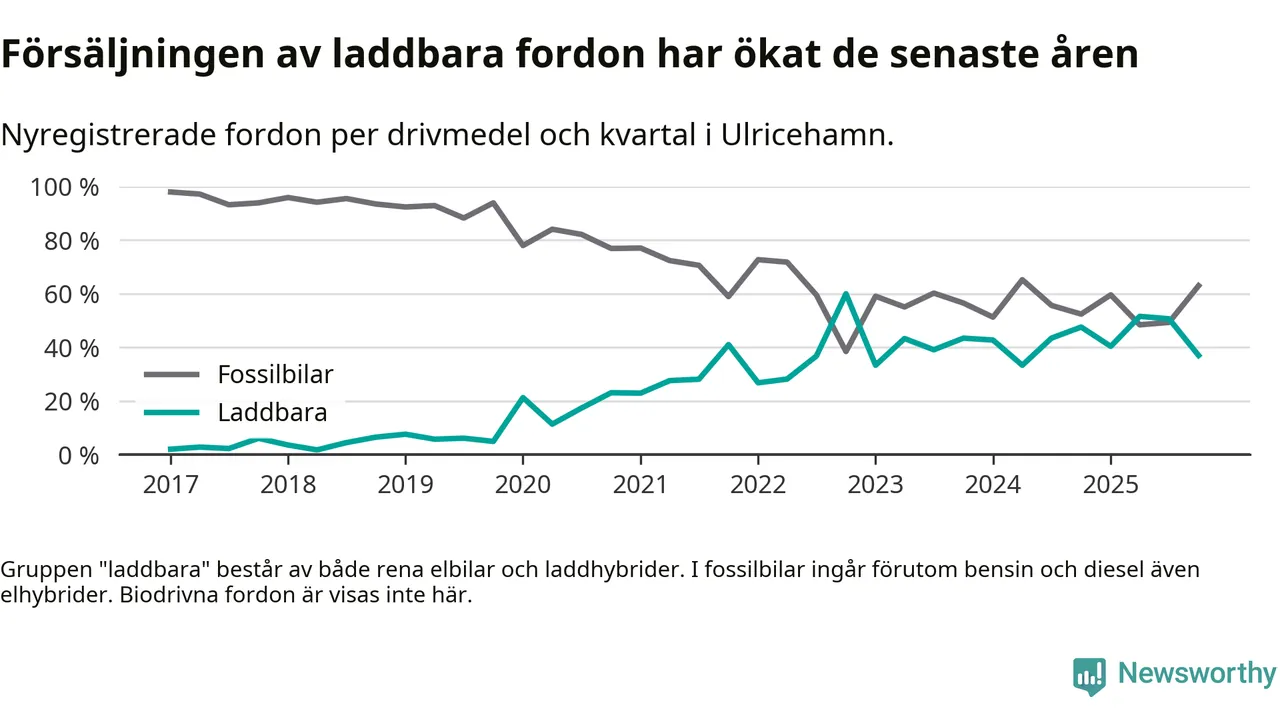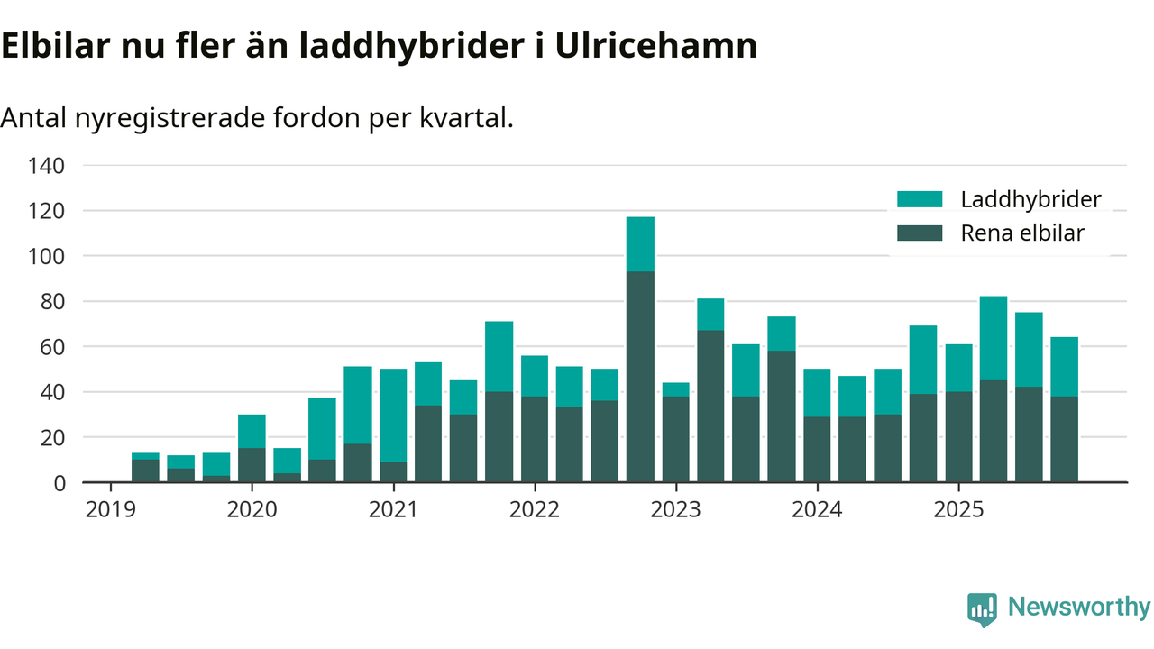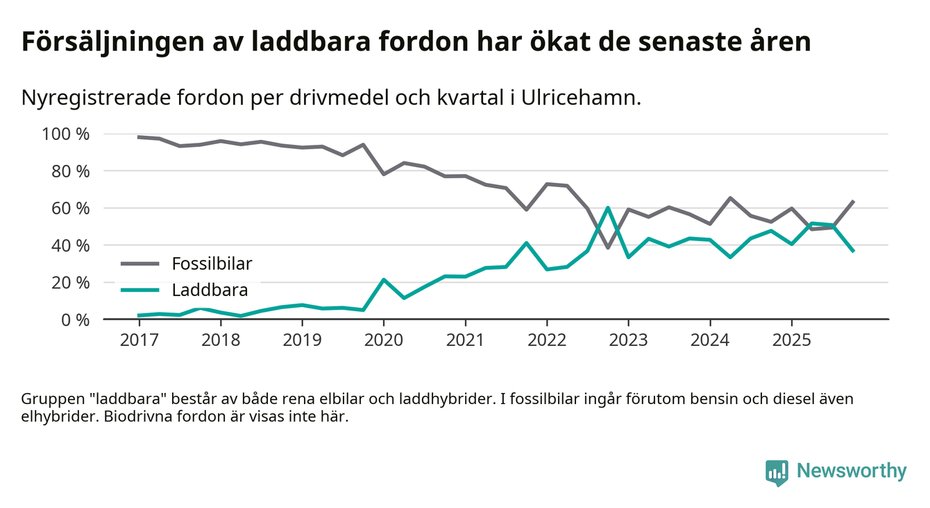 Under fjärde kvartalet 2025 var 37 procent av alla nyregistrerade personbilar i Ulricehamn laddbara (sammanlagt registrerades 173 nya bilar). Merparten av de laddbara bilarna var rena elbilar (22 procent av alla).