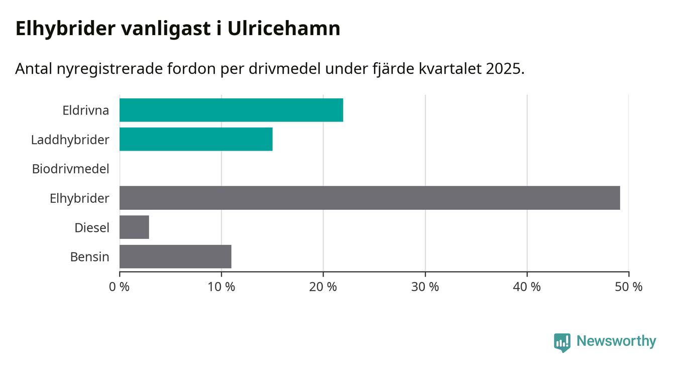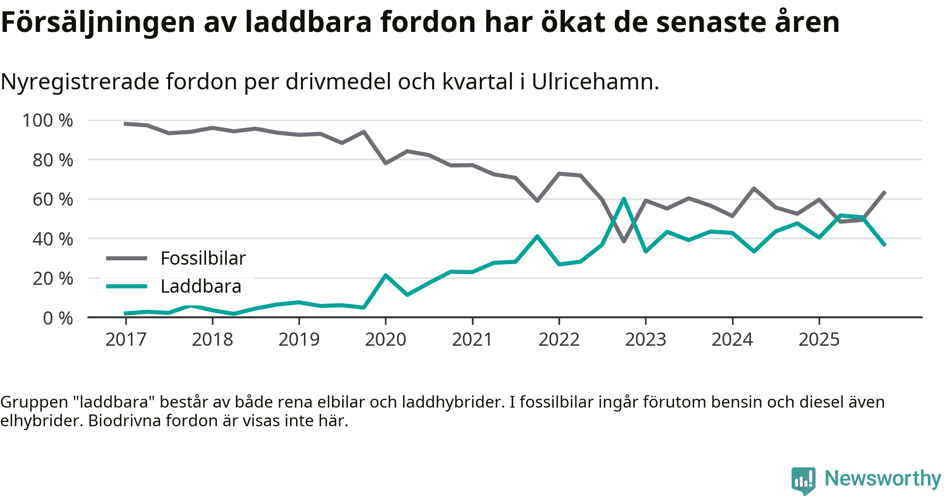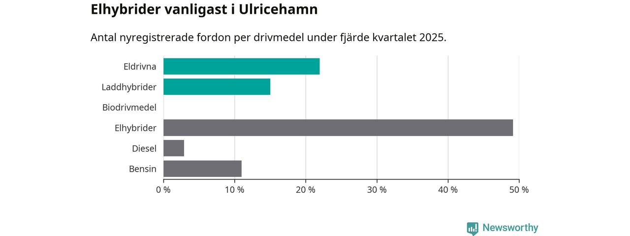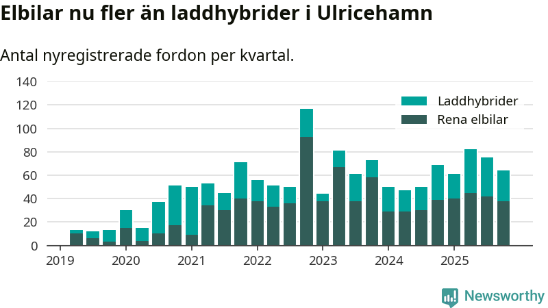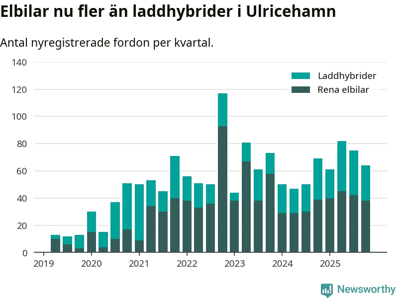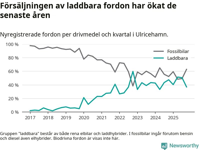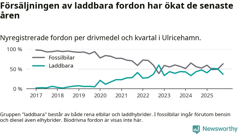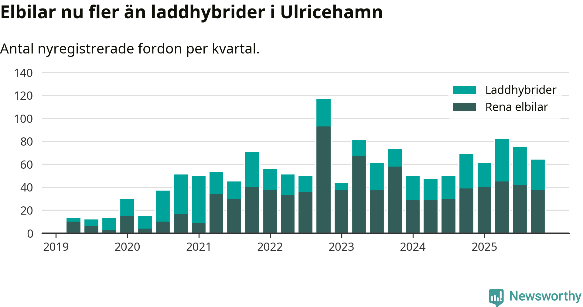 Under fjärde kvartalet 2025 var 37 procent av alla nyregistrerade personbilar i Ulricehamn laddbara (sammanlagt registrerades 173 nya bilar). Merparten av de laddbara bilarna var rena elbilar (22 procent av alla).