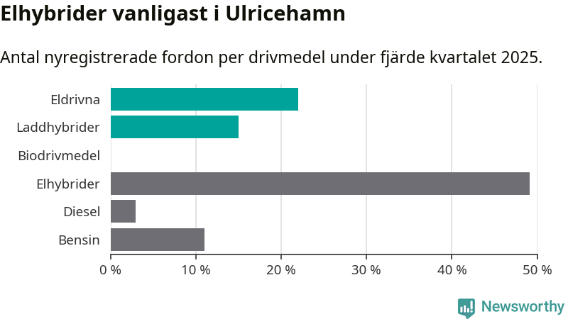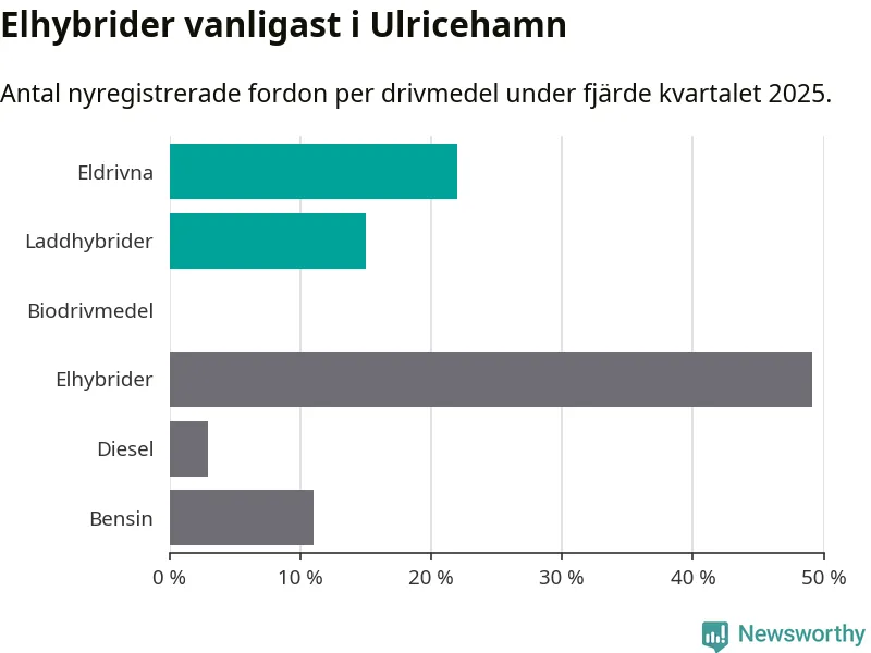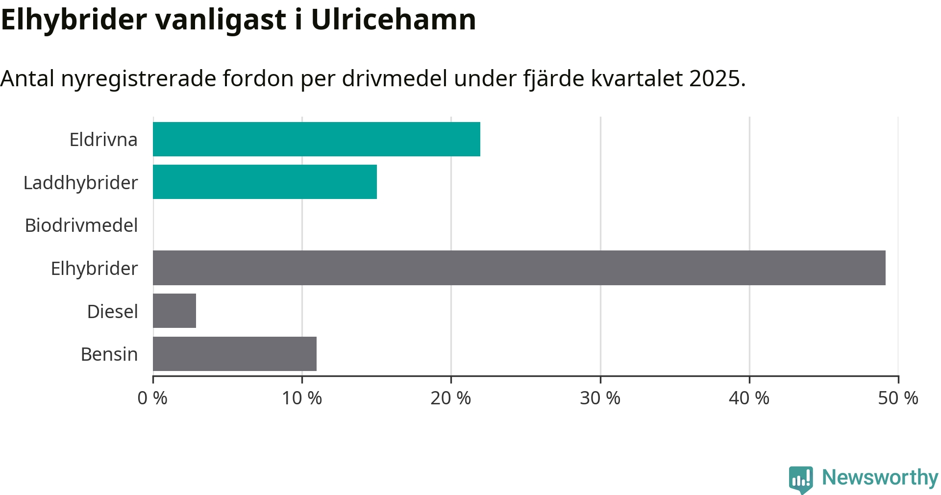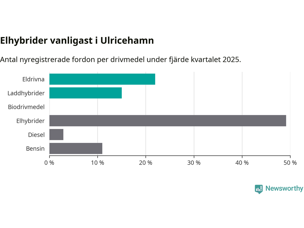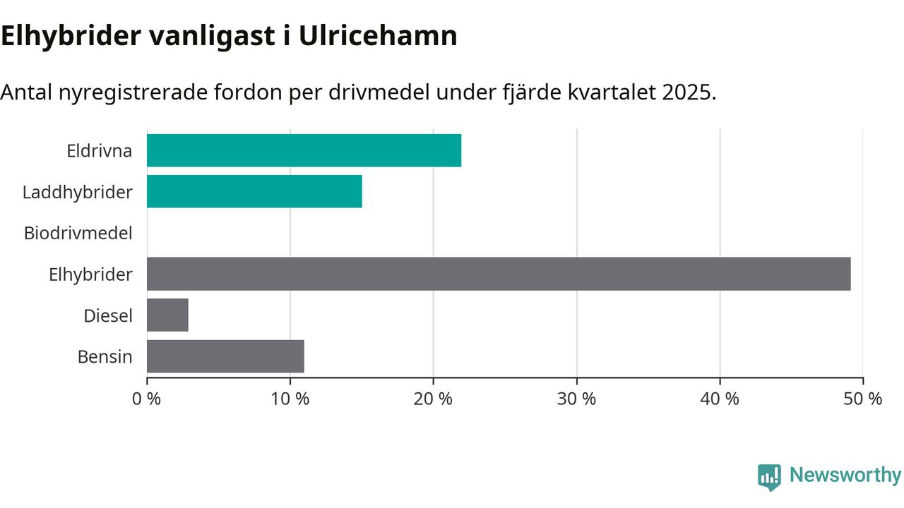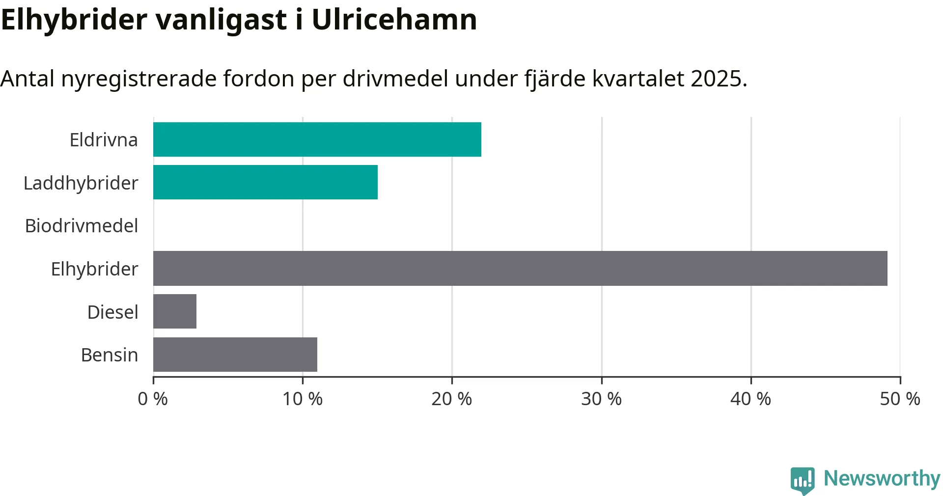 Under fjärde kvartalet 2025 var 37 procent av alla nyregistrerade personbilar i Ulricehamn laddbara (sammanlagt registrerades 173 nya bilar). Merparten av de laddbara bilarna var rena elbilar (22 procent av alla).