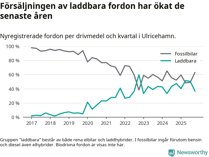 I landet som helhet var 63 procent av alla nyregistrerade personbilar laddbara år 2025. Det är en ökning jämfört med året innan, men samtidigt betydligt färre än de prognoser som gjordes för några år sedan.