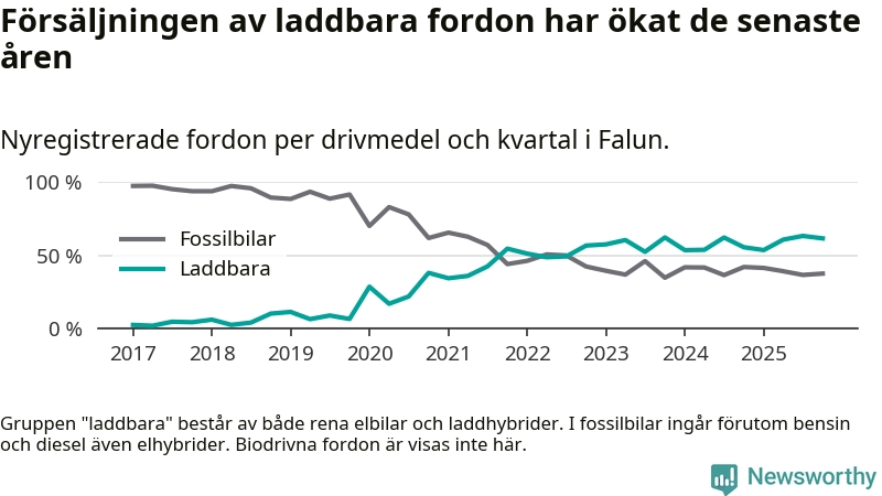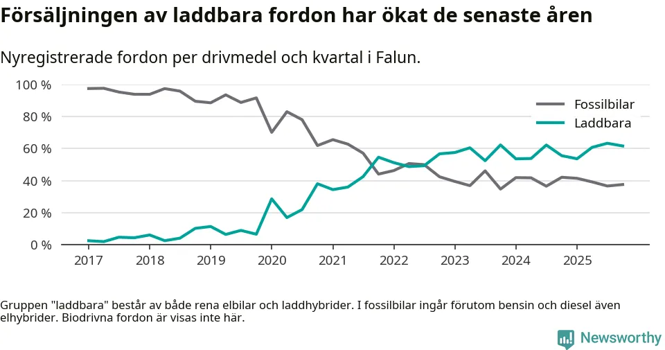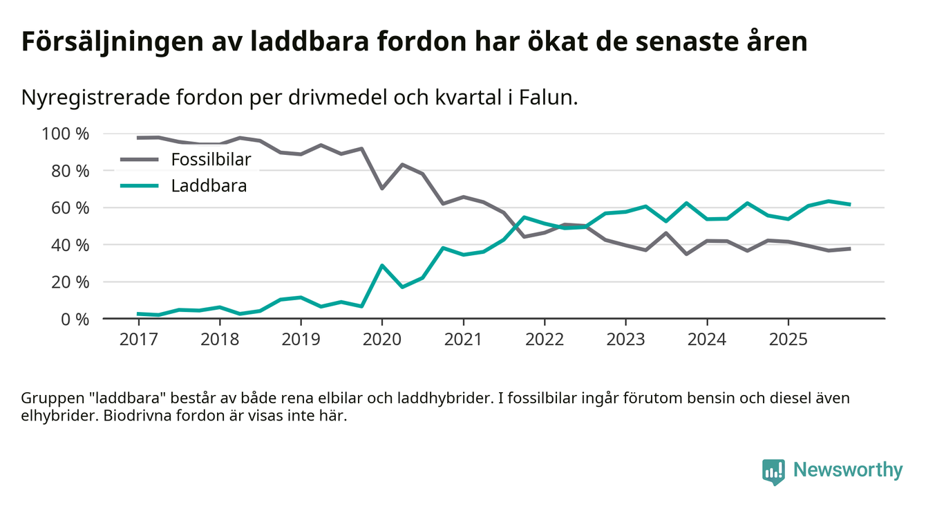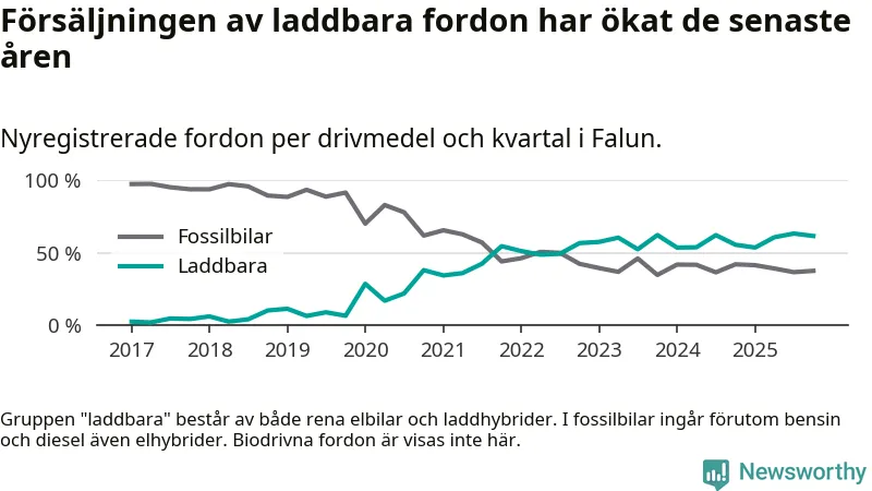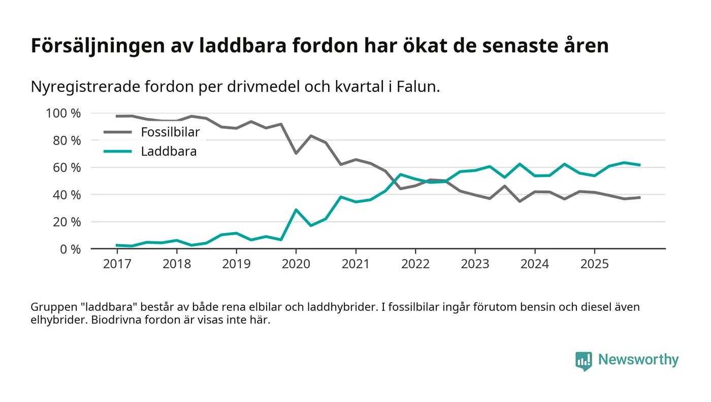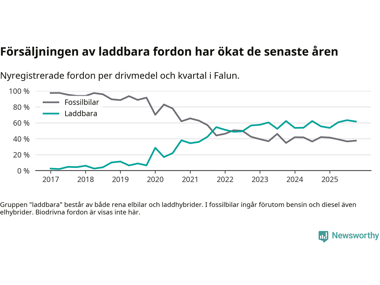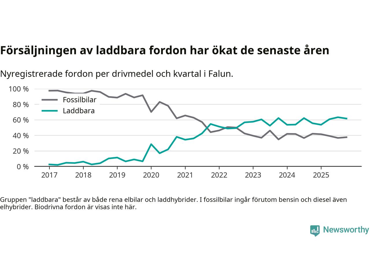 Under fjärde kvartalet 2025 var 62 procent av alla nyregistrerade personbilar i Falun laddbara (sammanlagt registrerades 266 nya bilar). Merparten av de laddbara bilarna var rena elbilar (32 procent av alla).