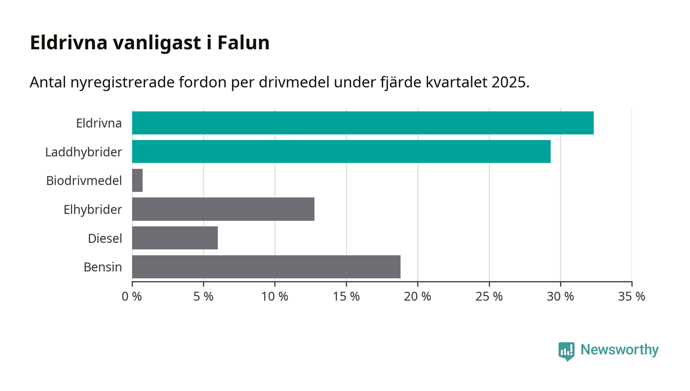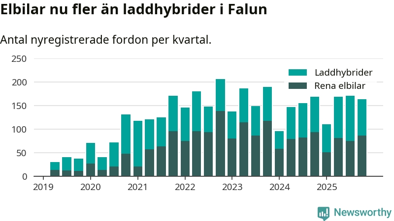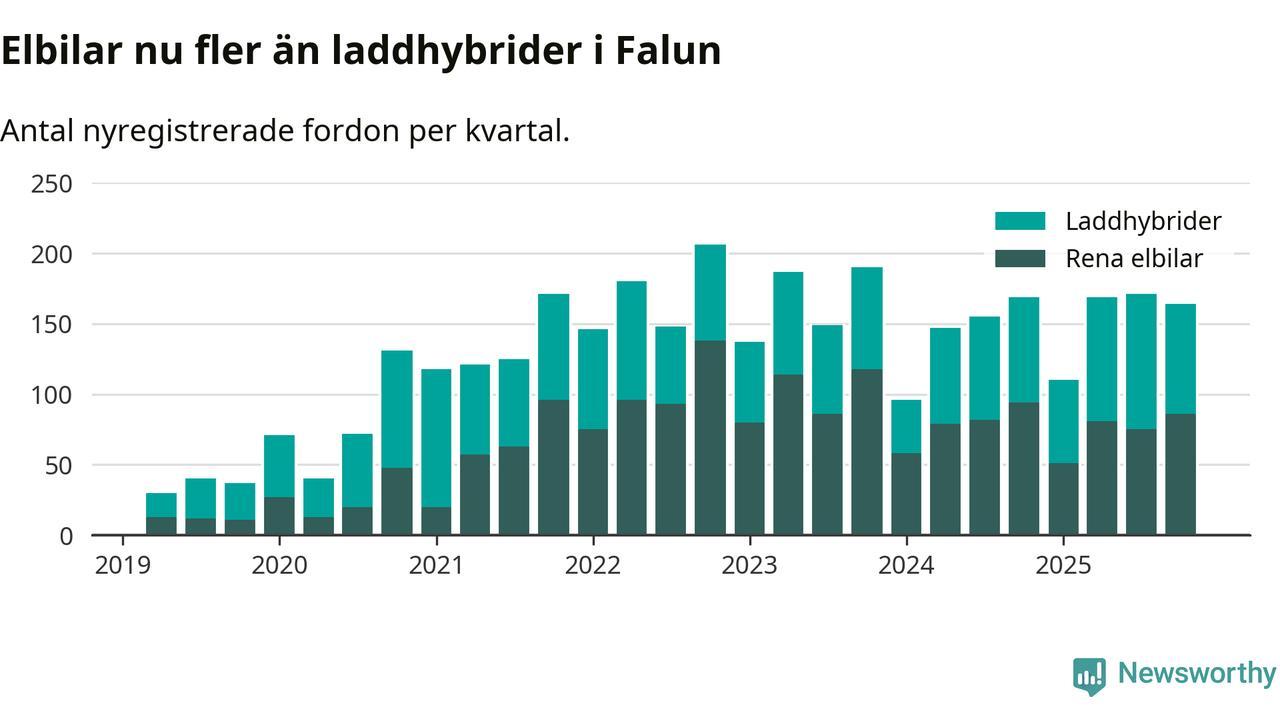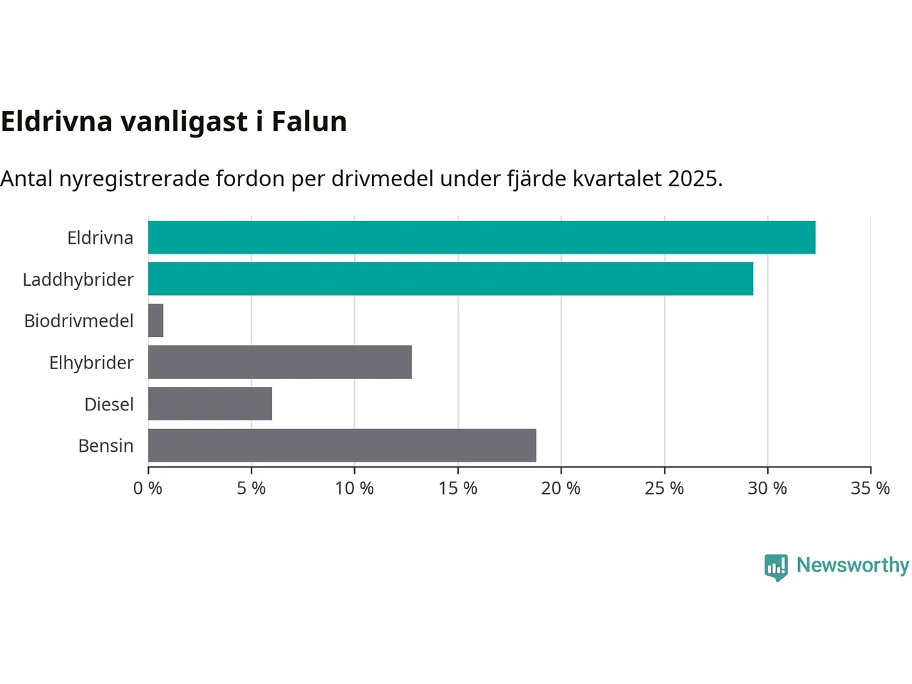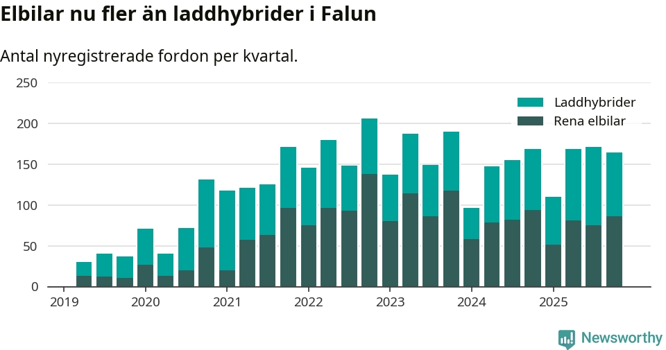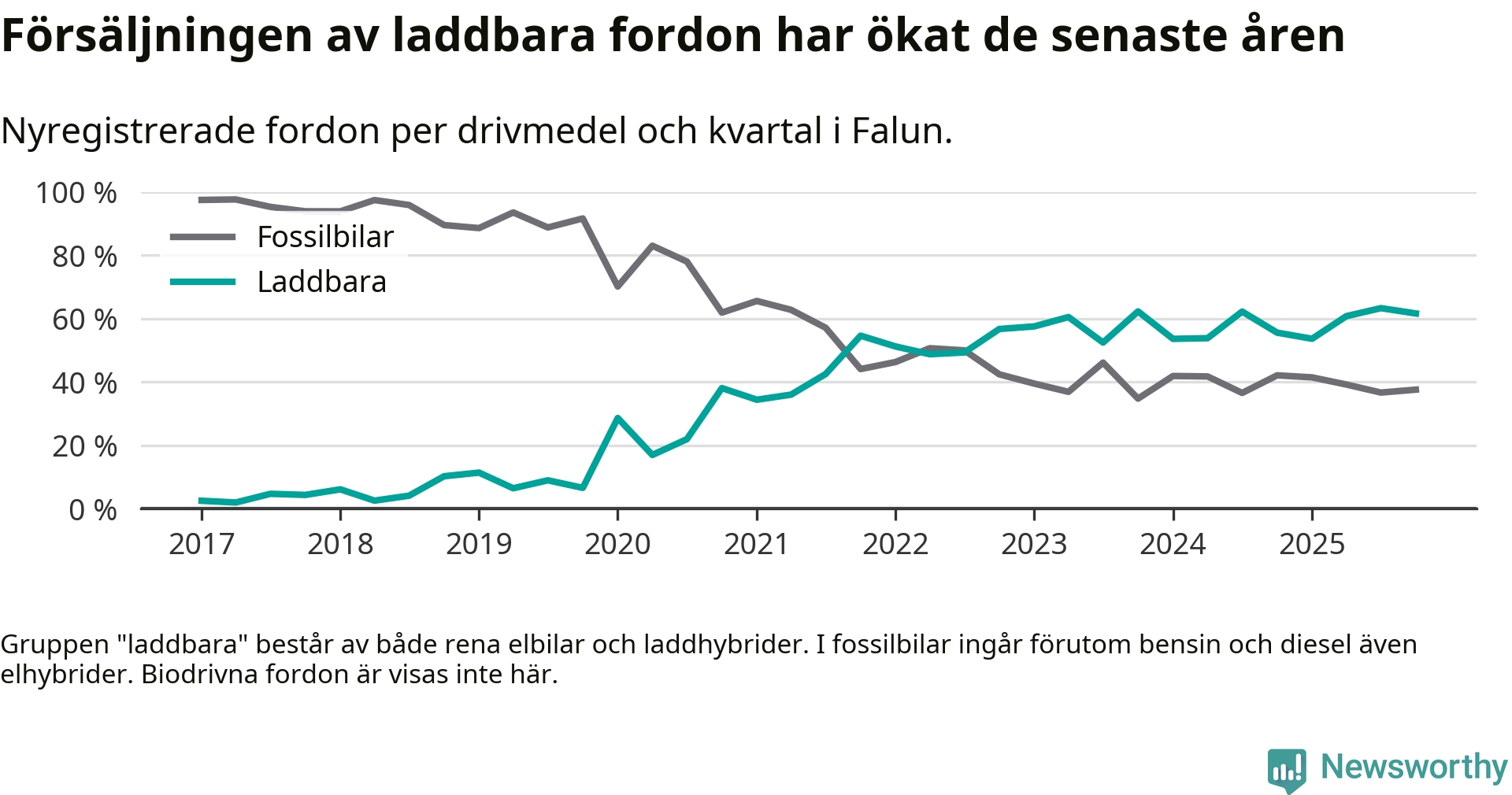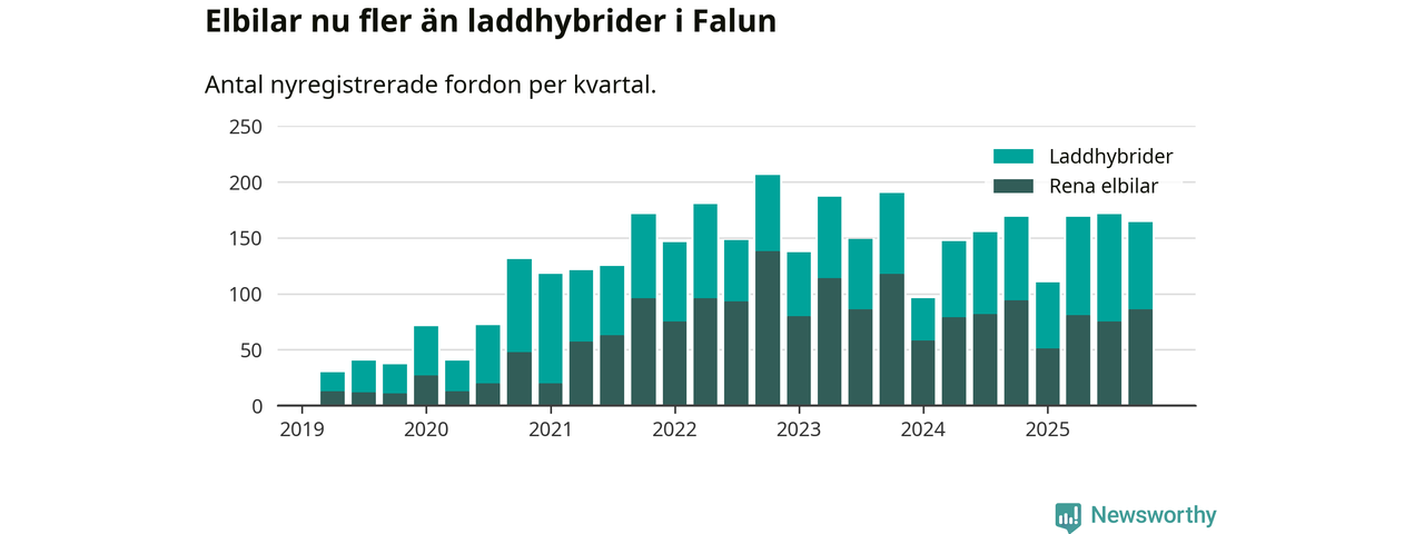 Under fjärde kvartalet 2025 var 62 procent av alla nyregistrerade personbilar i Falun laddbara (sammanlagt registrerades 266 nya bilar). Merparten av de laddbara bilarna var rena elbilar (32 procent av alla).
