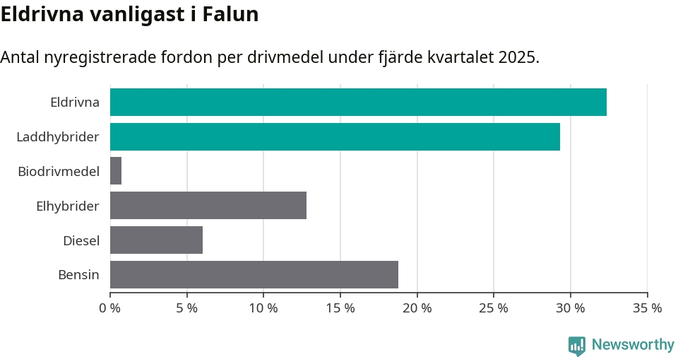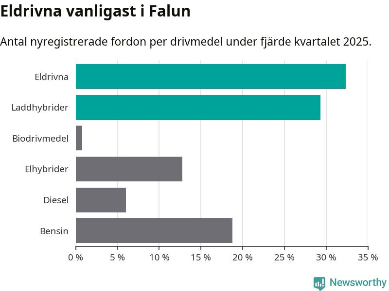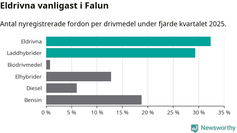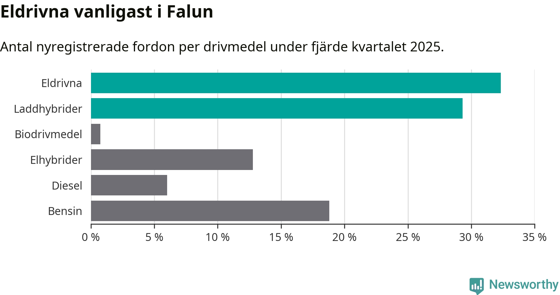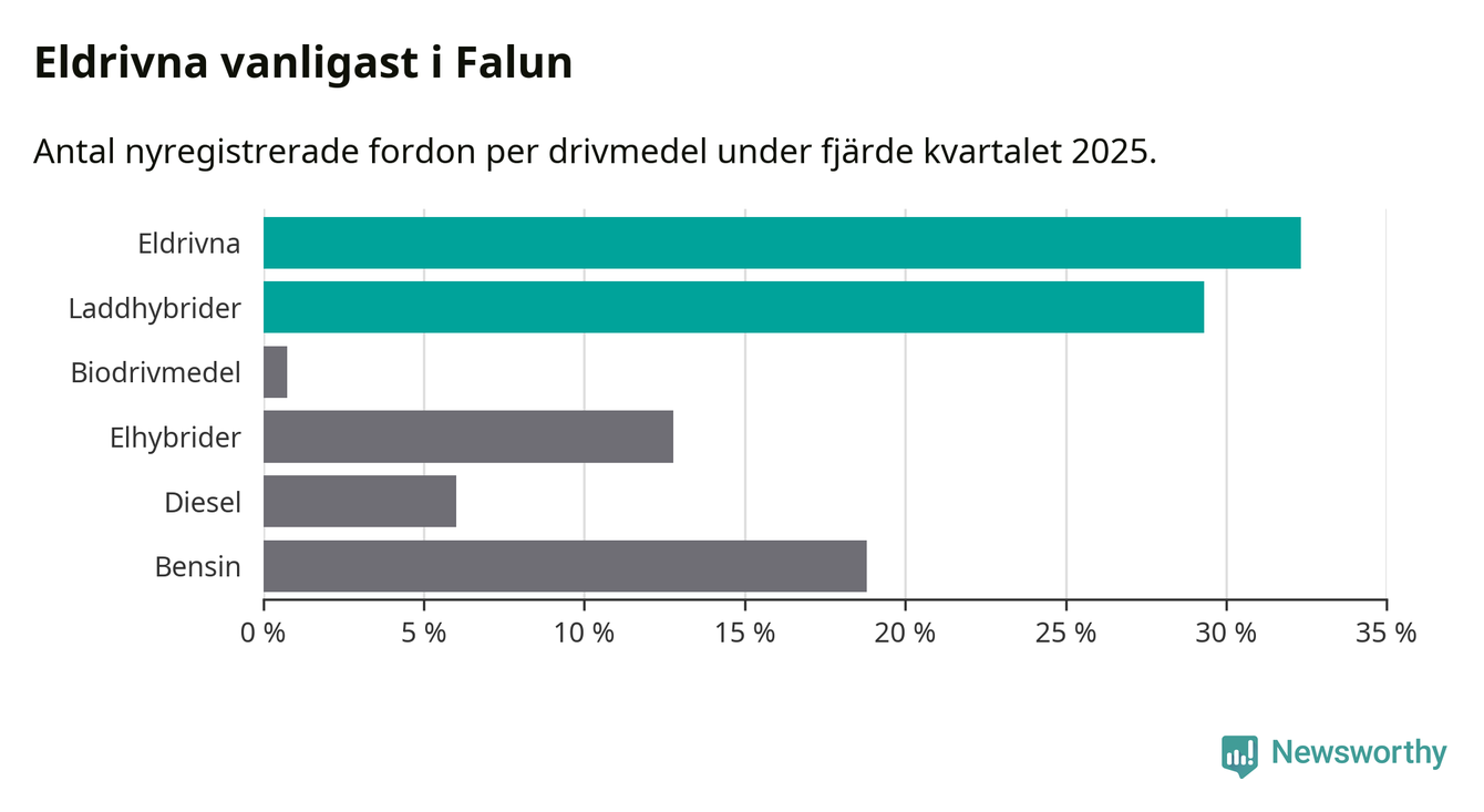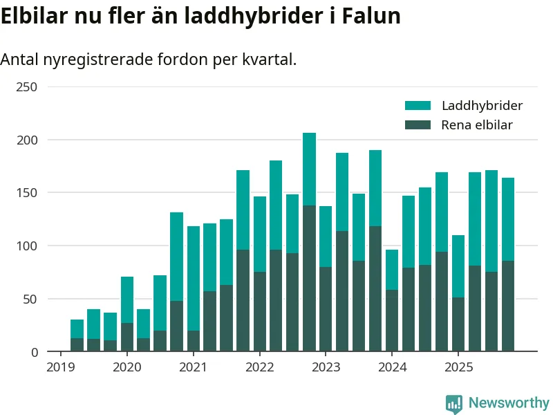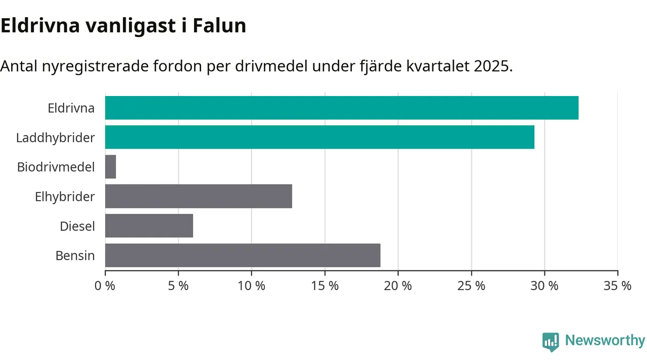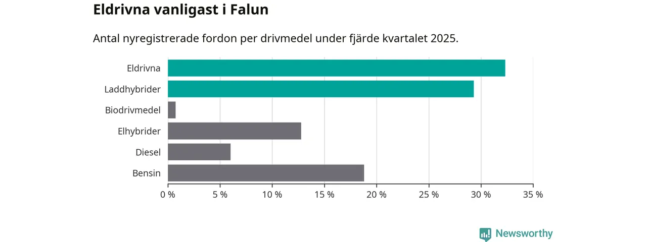 Under fjärde kvartalet 2025 var 62 procent av alla nyregistrerade personbilar i Falun laddbara (sammanlagt registrerades 266 nya bilar). Merparten av de laddbara bilarna var rena elbilar (32 procent av alla).