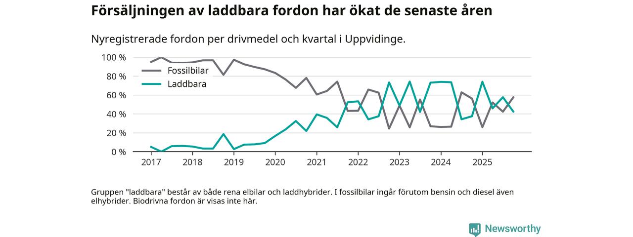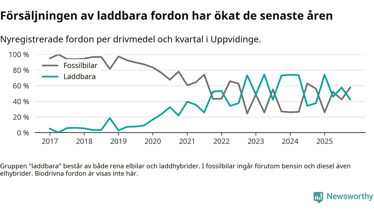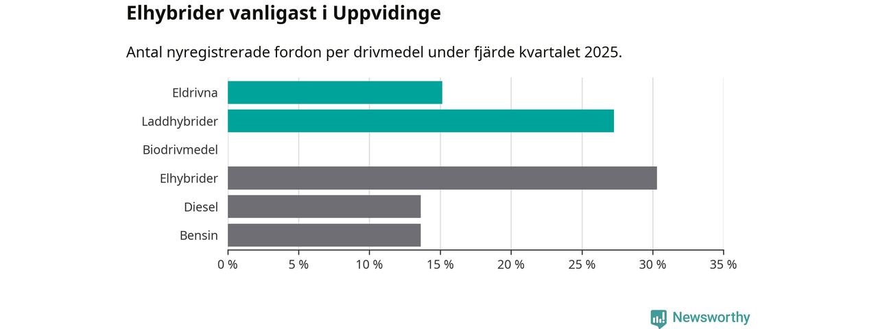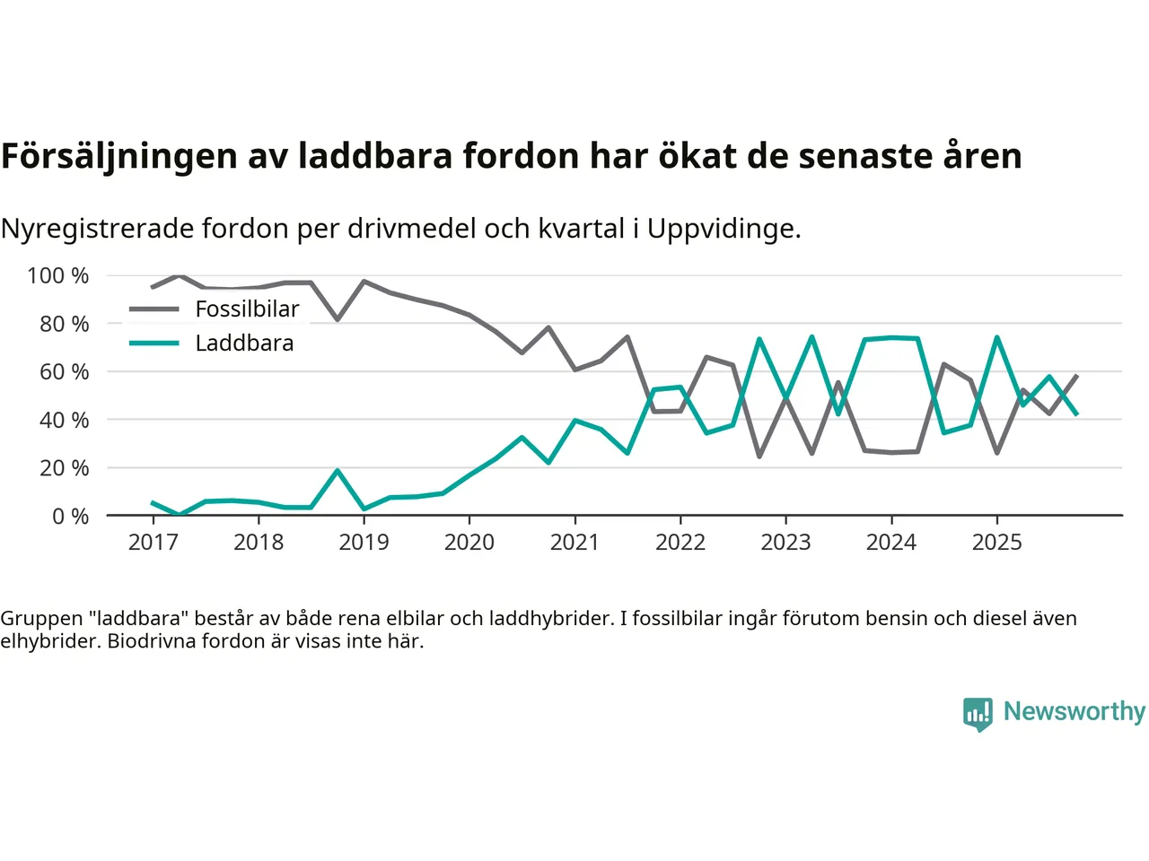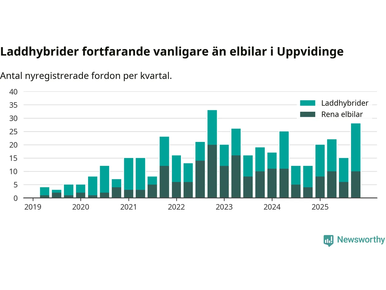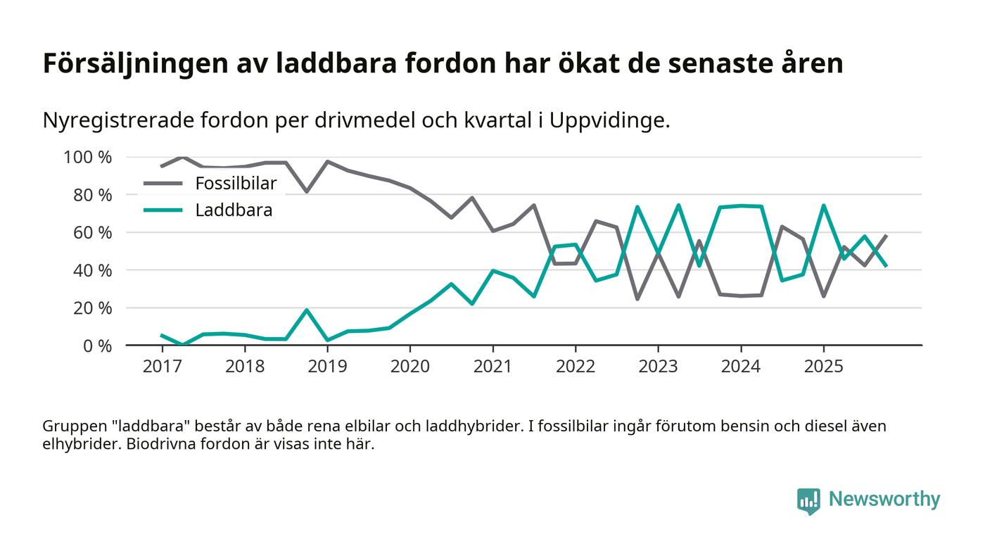 Under fjärde kvartalet 2025 var 42 procent av alla nyregistrerade personbilar i Uppvidinge laddbara (sammanlagt registrerades 66 nya bilar). Merparten av de laddbara bilarna var så kallade laddhybrider, det vill säga fordon som går att ladda och köra på el, men som även har en förbränningsmotor. 15 procent av alla nya bilar var rena elbilar.