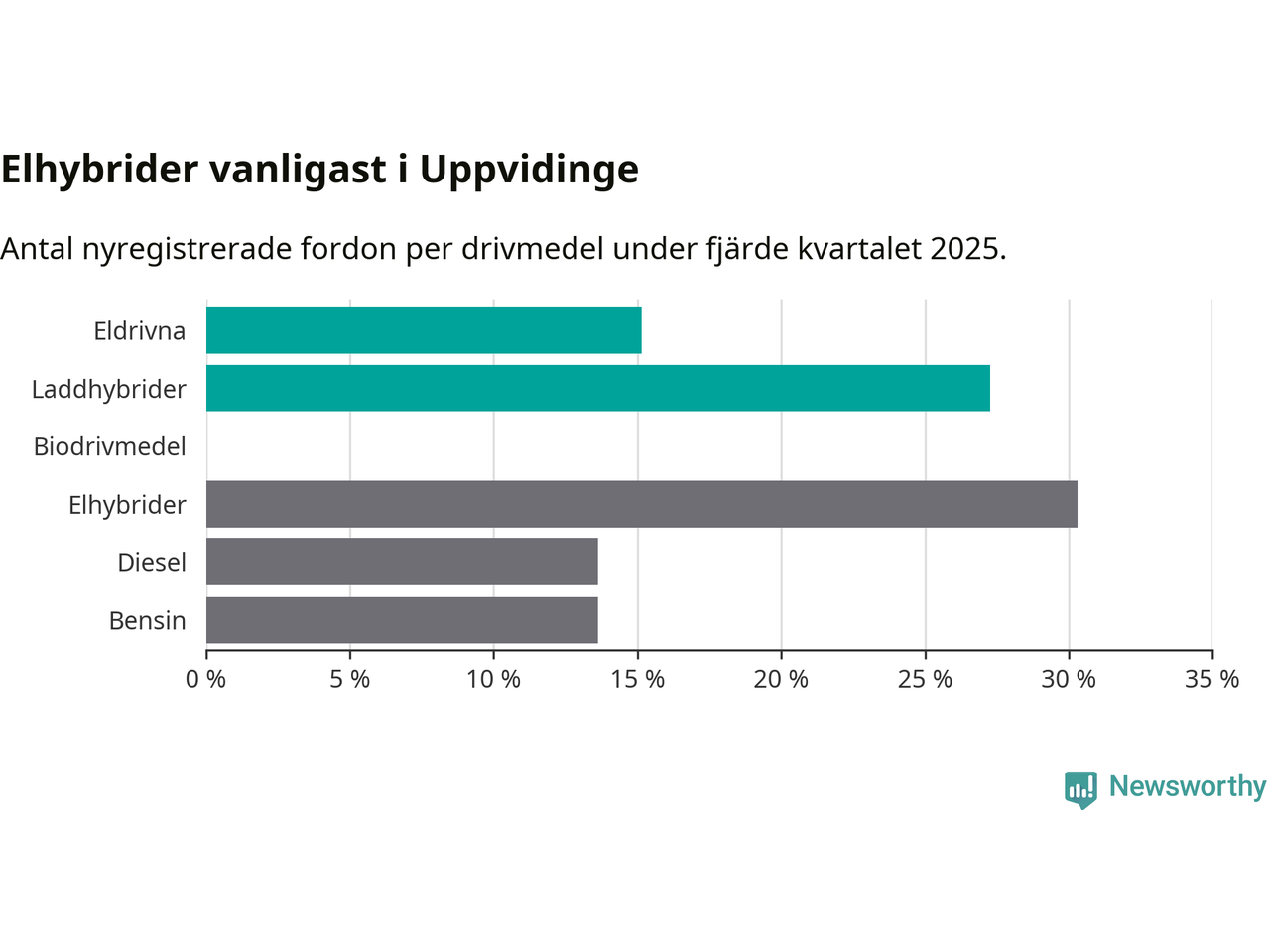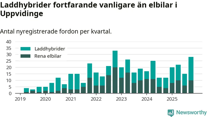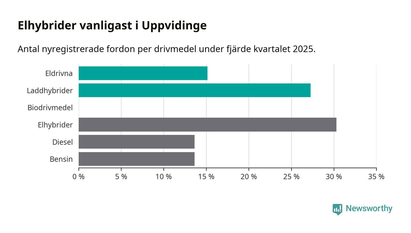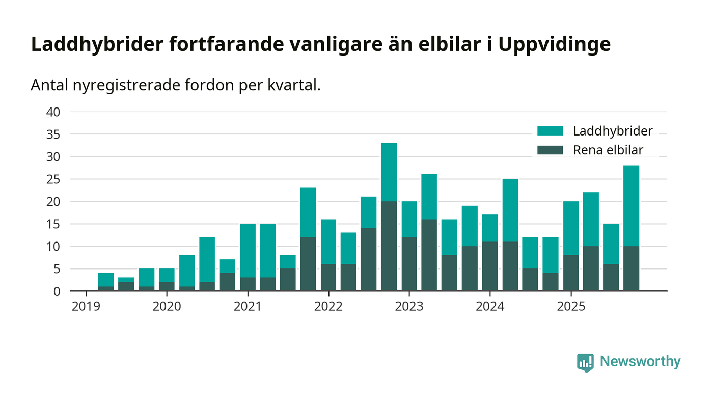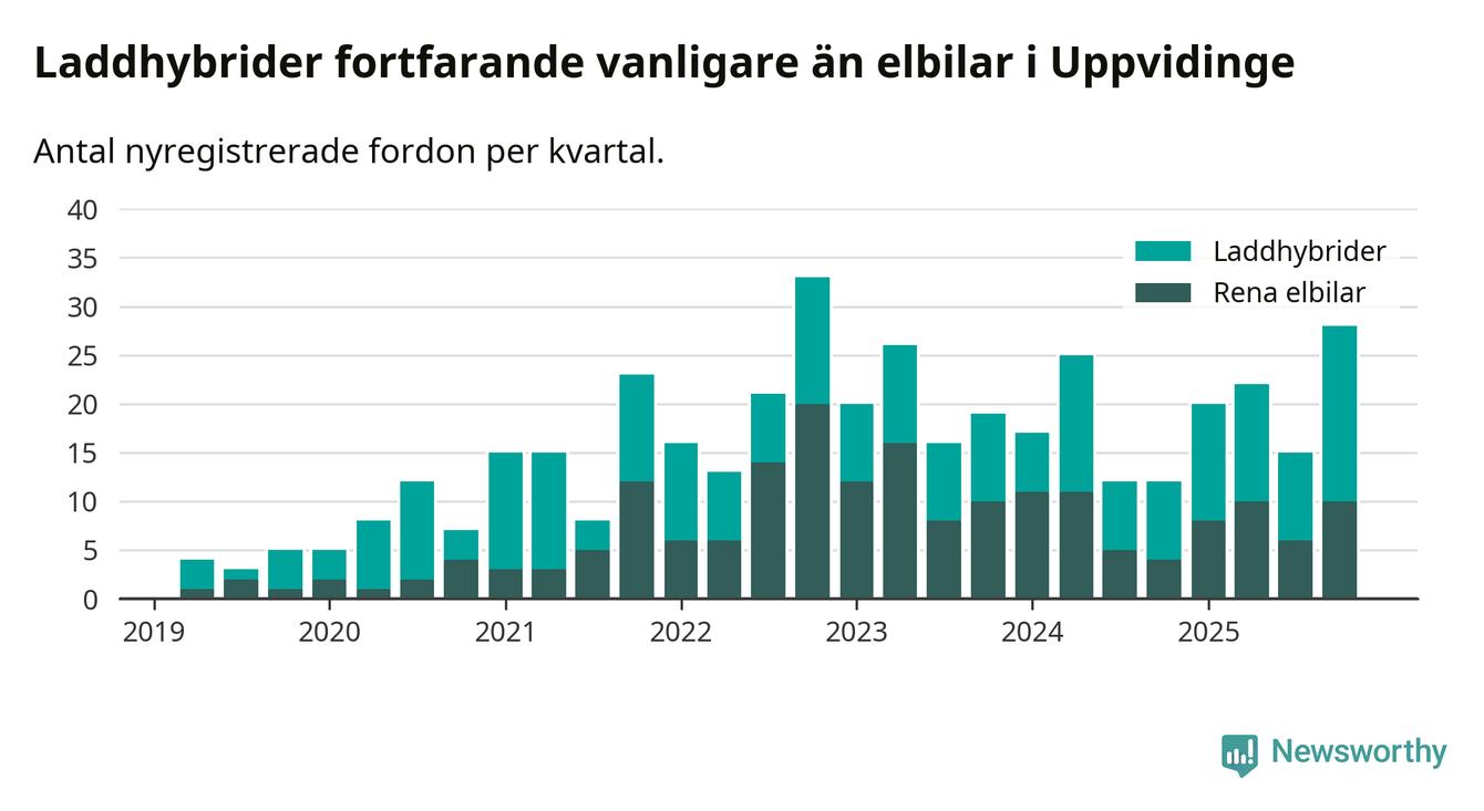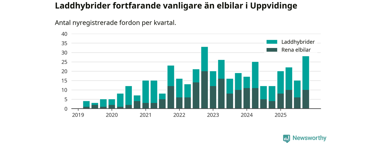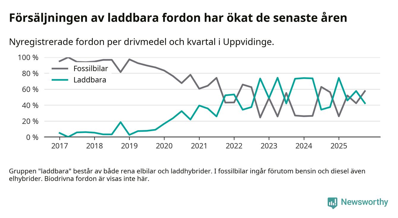 Under fjärde kvartalet 2025 var 42 procent av alla nyregistrerade personbilar i Uppvidinge laddbara (sammanlagt registrerades 66 nya bilar). Merparten av de laddbara bilarna var så kallade laddhybrider, det vill säga fordon som går att ladda och köra på el, men som även har en förbränningsmotor. 15 procent av alla nya bilar var rena elbilar.